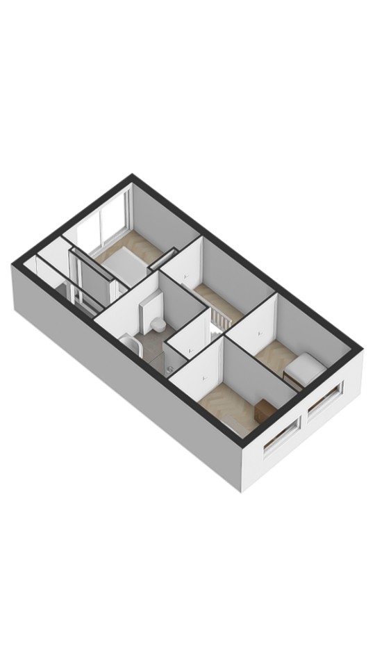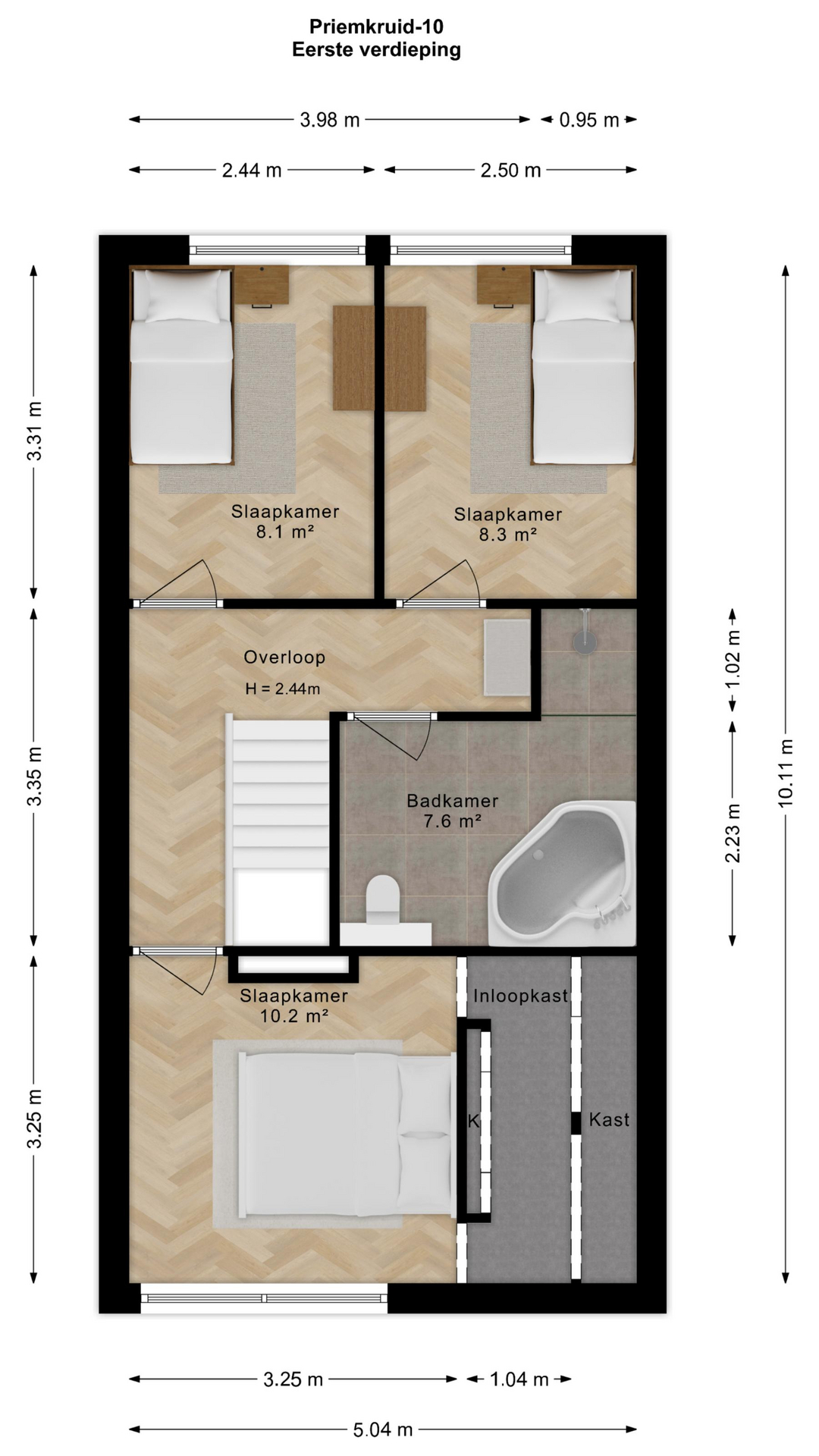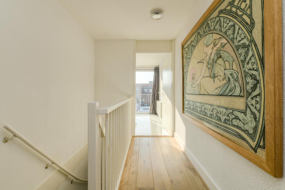 Eerste verdieping L-vormige overloop; hoofdslaapkamer aan de voorzijde (ca. 3.25 × 5.04 m) met Frans balkon, schuifpui en inloopkast; twee slaapkamers aan de achterzijde (beide ca. 2.50 × 3.30 m); badkamer (ca. 2.20 × 2.90 m) met ligbad, inloopdouche, tweede toilet en wastafelmeubel.