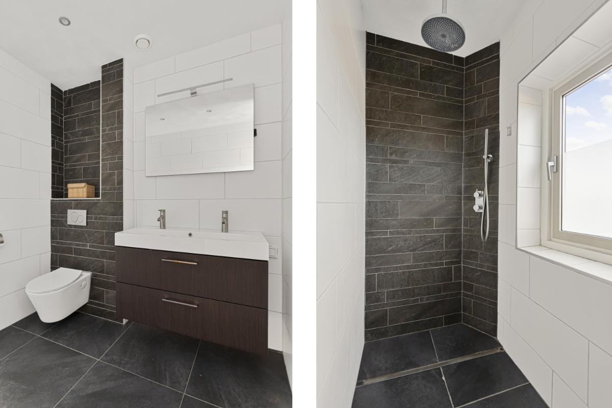 BADKAMER De geheel betegelde badkamer (ca. 3.18 x 2.01m.) beschikt over een ruime inloop (regen)douche met inbouwkranen en separate handdouche, dubbele wastafel met meubel, inbouwspots, mechanische ventilatie en een vrijhangend closet.