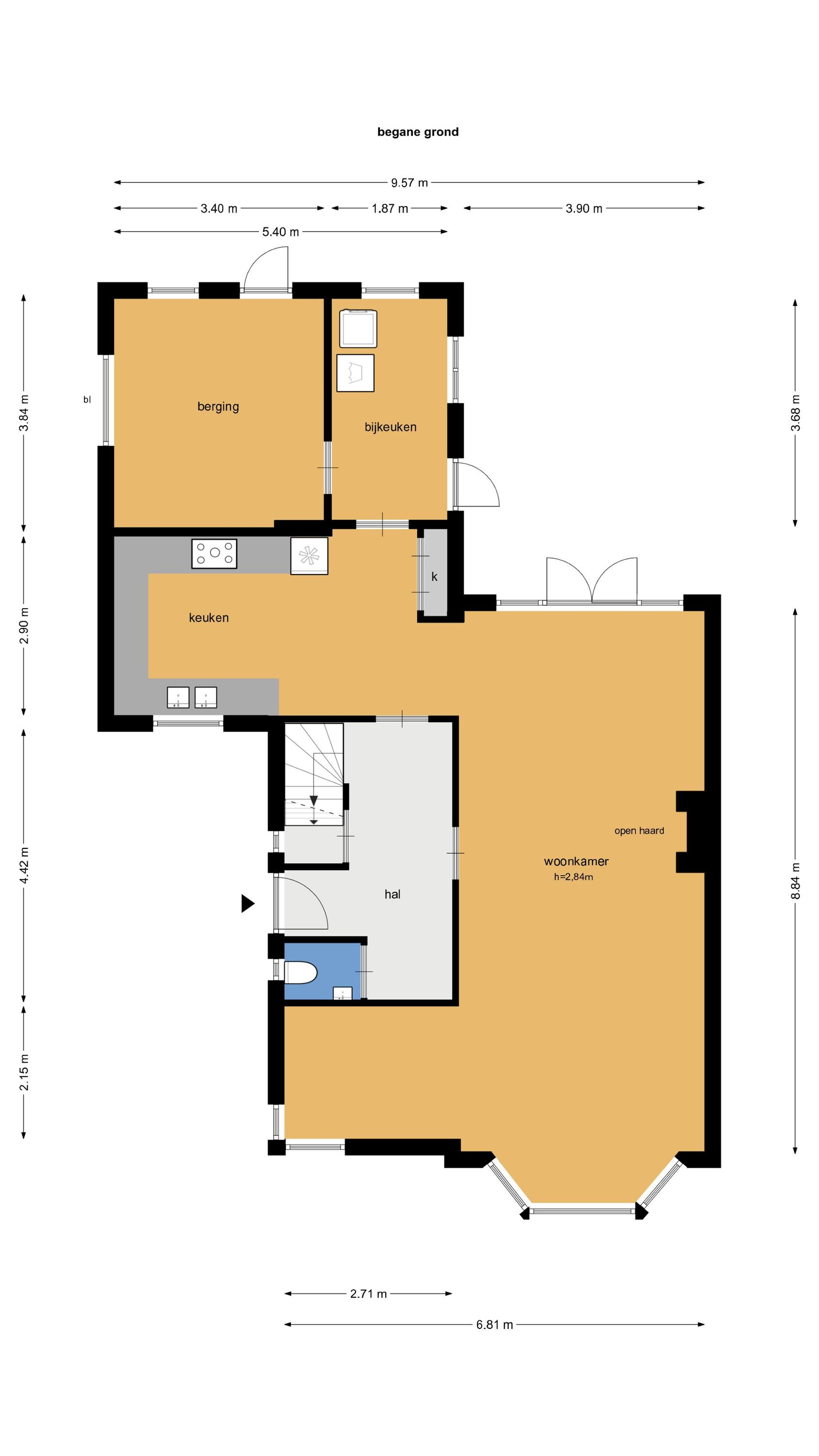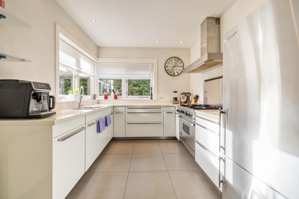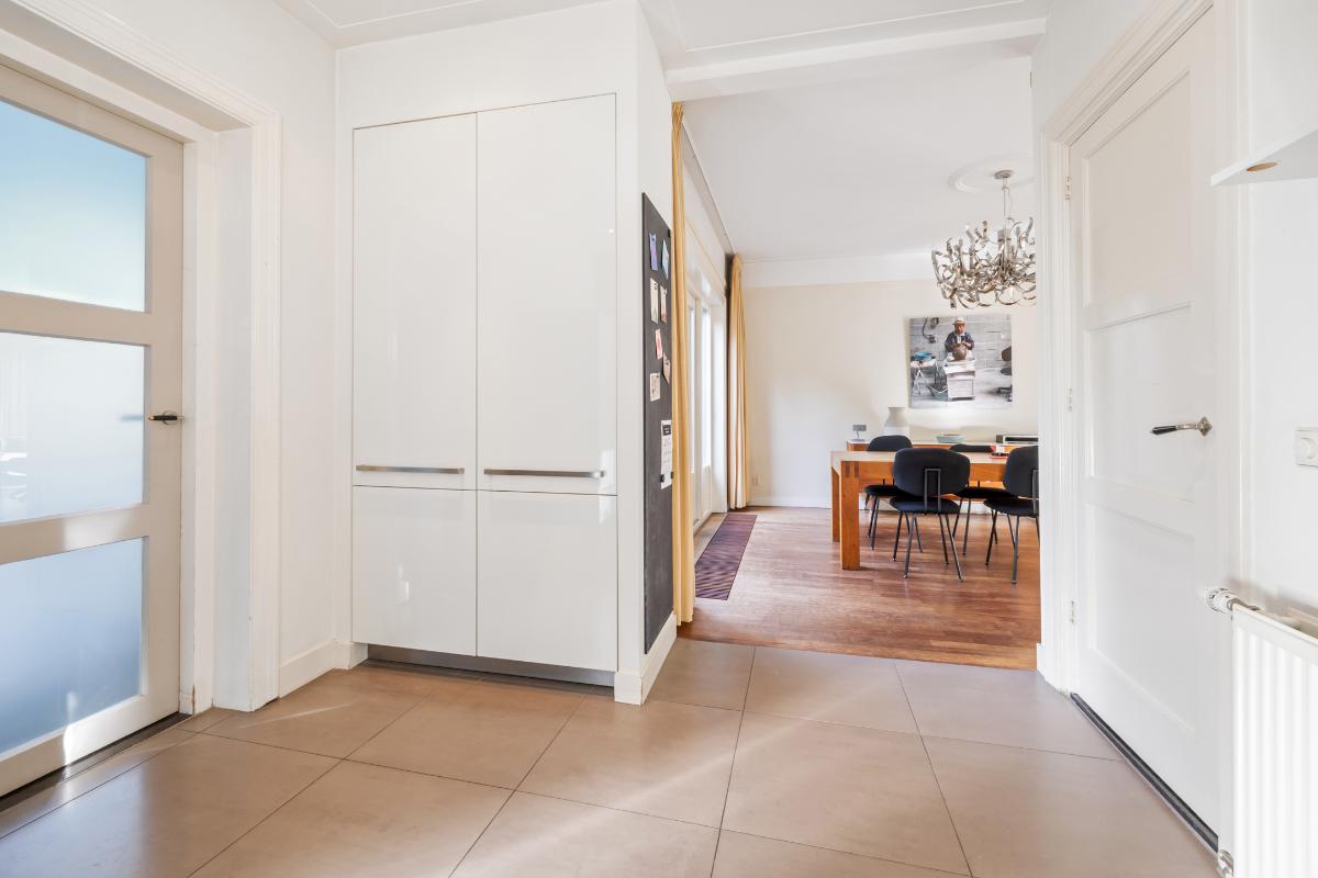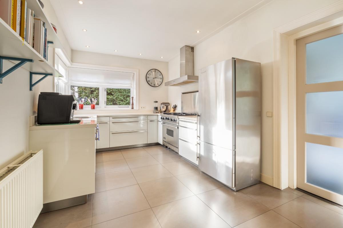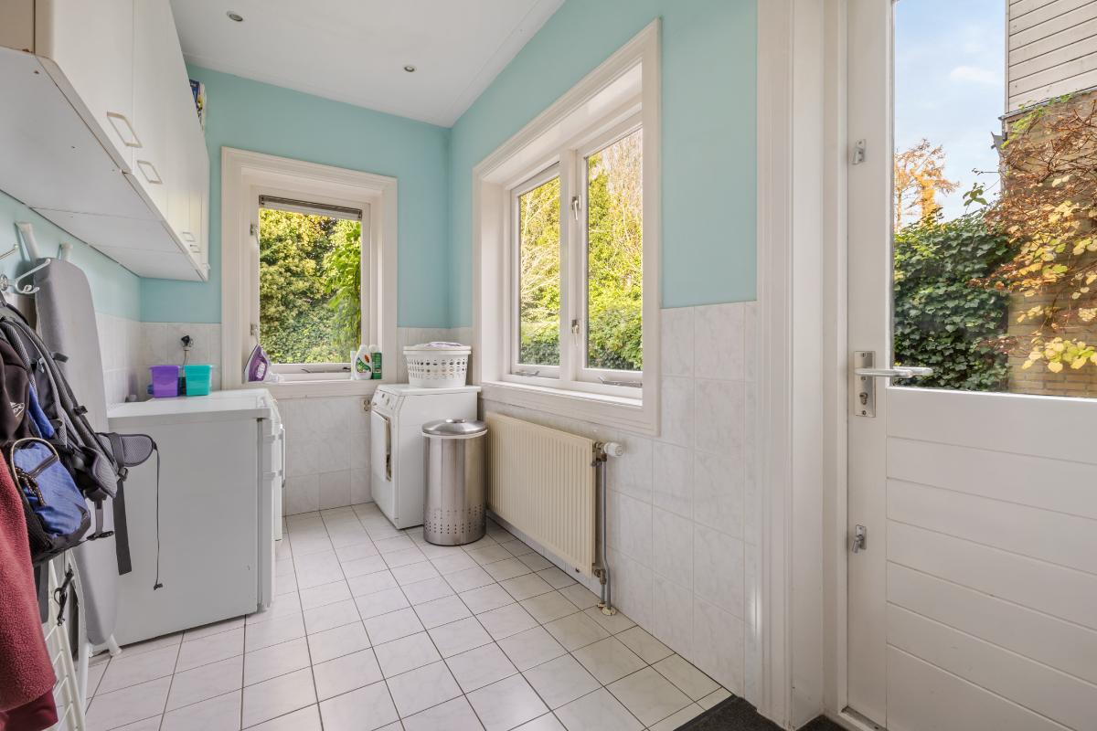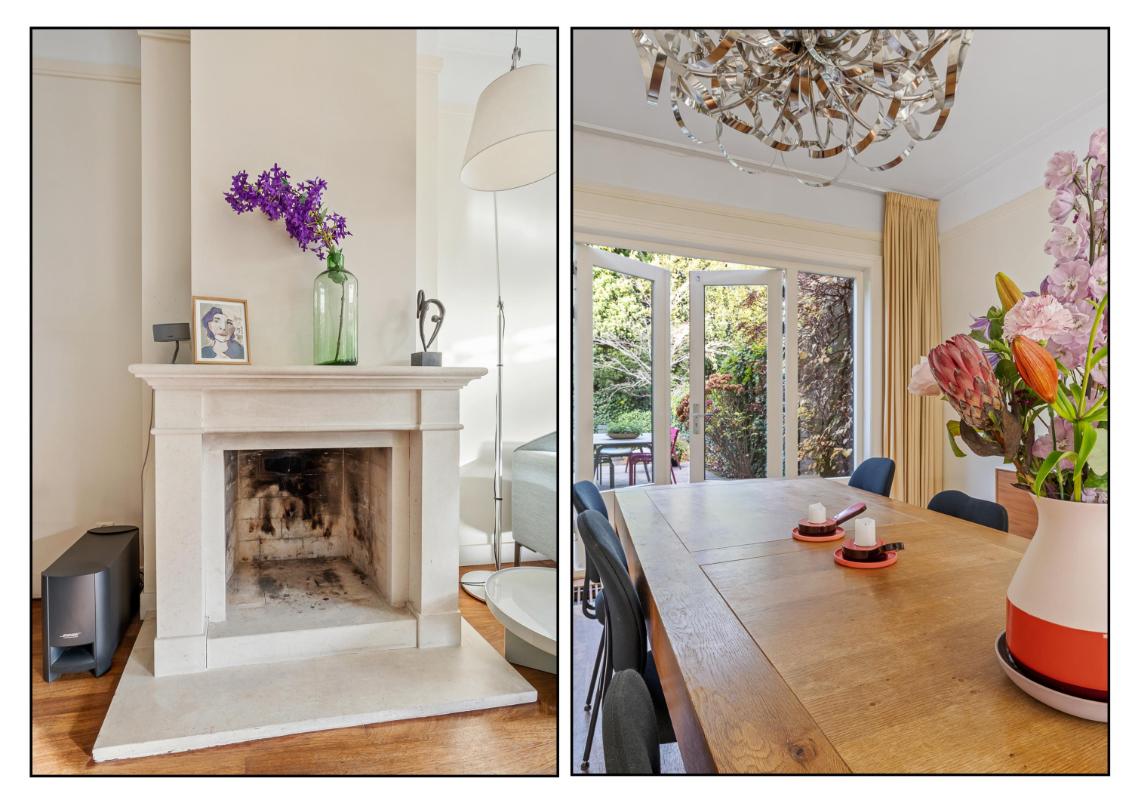 Begane grond: • Entree aan de zijkant van het huis met vestibule • Ruime hal met kelder, toilet met fontein en trappartij • Royale L-vormige woonkamer voorzien van parketvloer, glad gestuukte wanden, open haard, schilderijlijsten, glas in lood ramen, hoge plafonds, een erker en openslaande deuren naar de achtertuin. • Uitgebouwde eetkeuken met vloerverwarming, een professioneel Viking fornuis met 4 pitten, een grillplaat en een oven, afzuigkap, vaatwasmachine en een koel-vriescombinatie. • Achter de keuken is een grote bijkeuken met de aansluitingen van wasmachine en droger met een deur naar de tuin en naar de naastgelegen schuur die is verwarmd en is voorzien van een extra keukenblok en boiler (t.b.v. keuken en vloerverwarming).