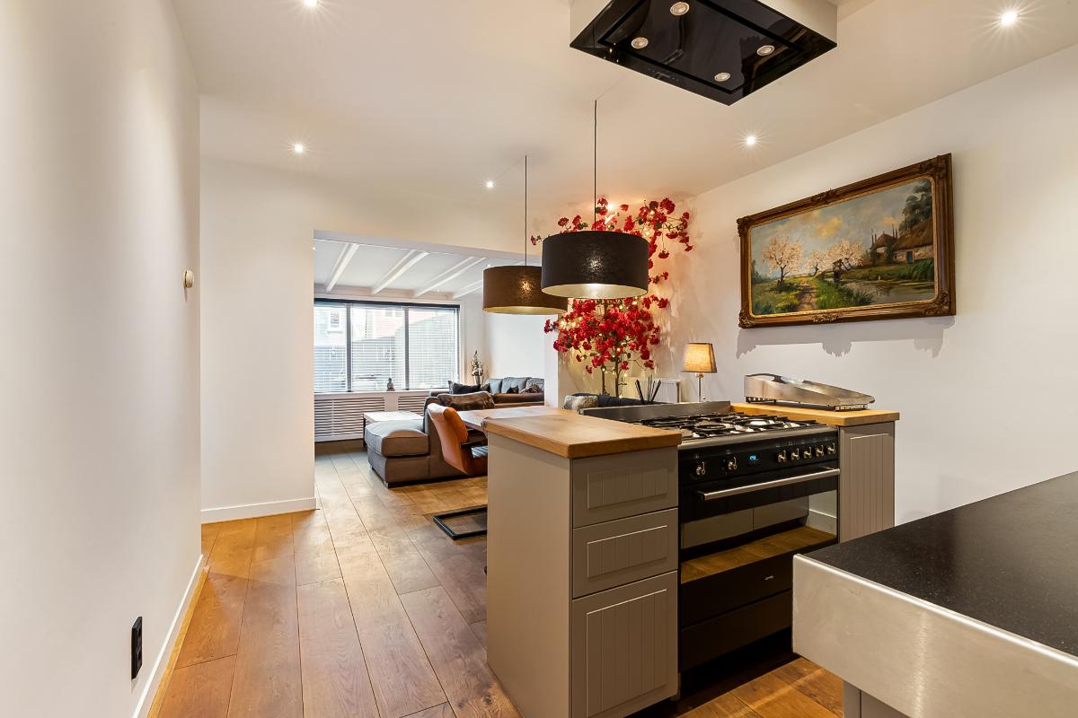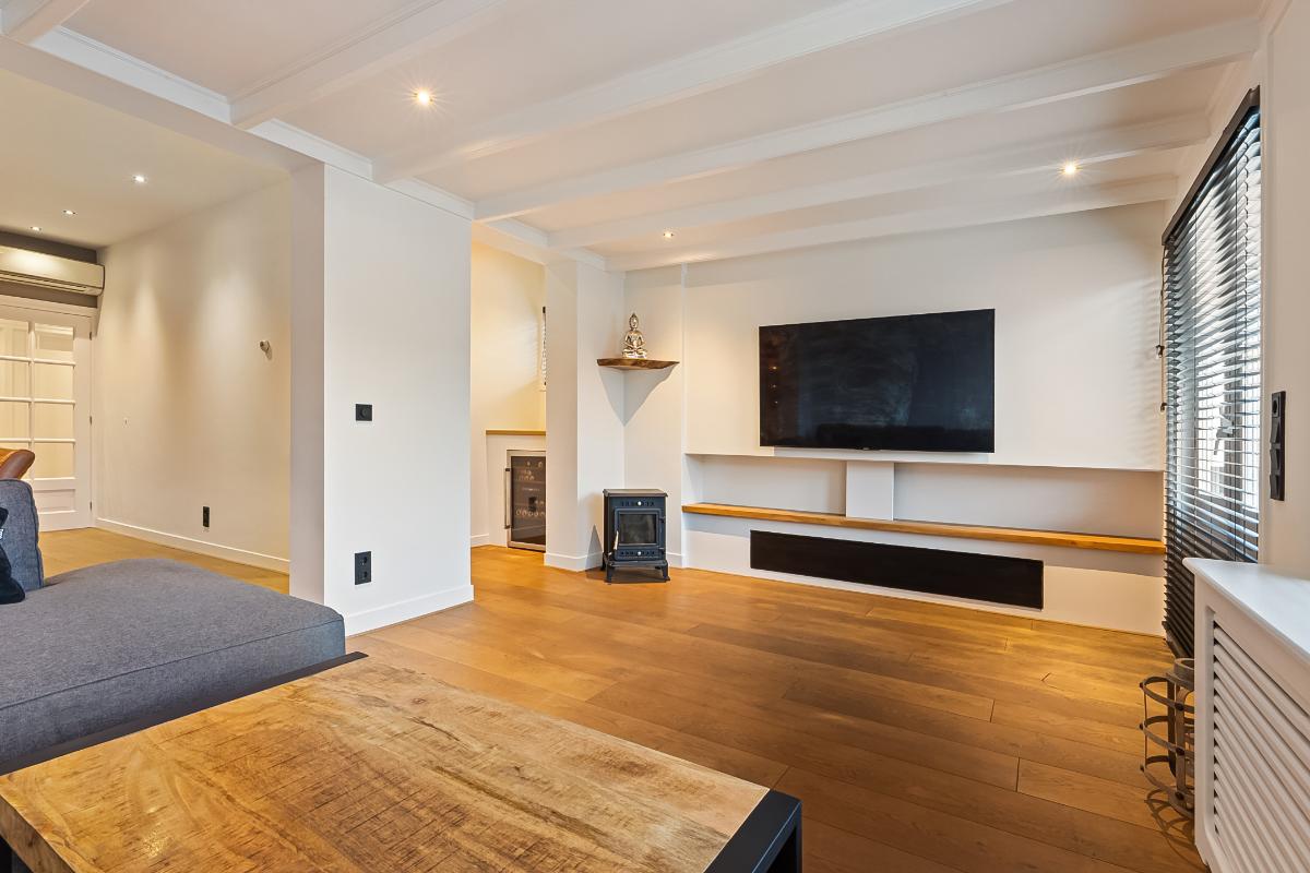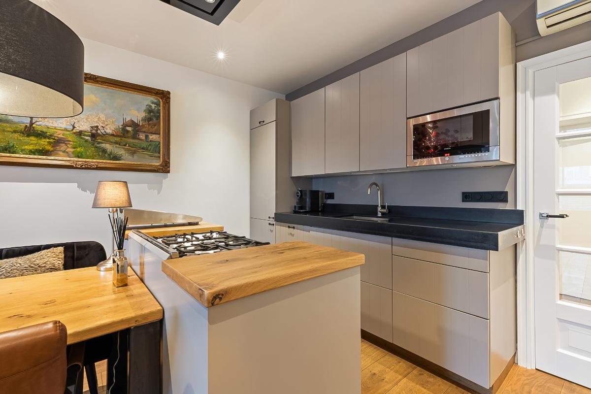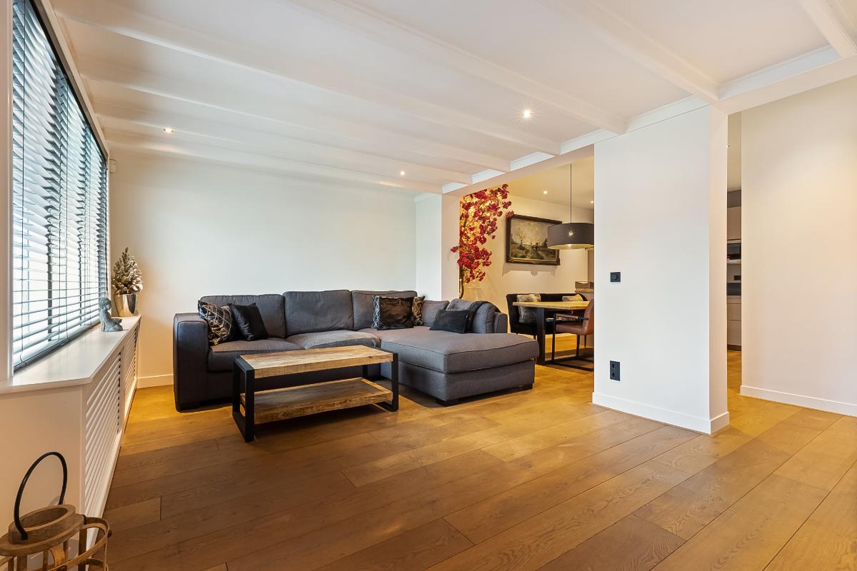 Entree, hal, kast met c.v. ketel en aansluiting voor de wasmachine, riante living met open keuken die is voorzien van een kookeiland en alle denkbare apparatuur zoals een fornuis met 5-pits gaskookplaat en grote oven, hoge afzuigkap, vaatwasser, koel/vriescombinatie, magnetron en in de kamer zit nog een wijnkoelkast. De woonkamer is heerlijk licht en is voorzien van openslaande deuren naar het terras. Het gehele appartement is voorzien van houten vloerdelen en er is een airco-installatie aanwezig.