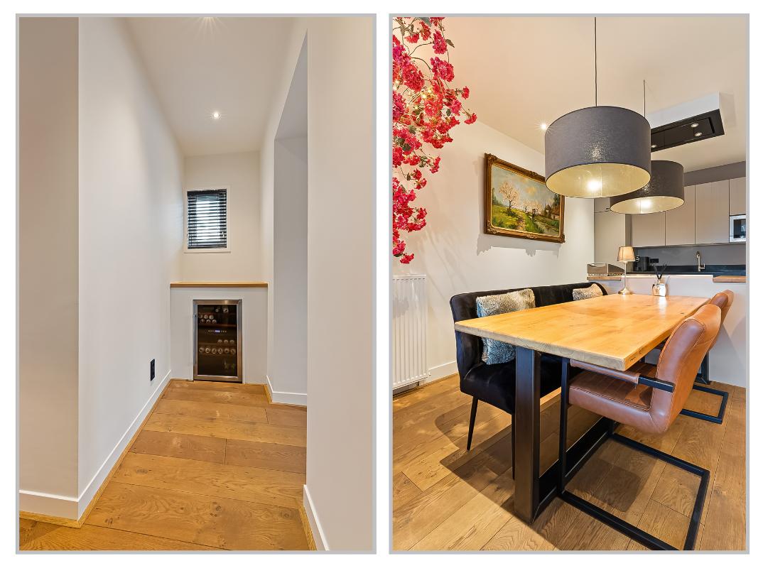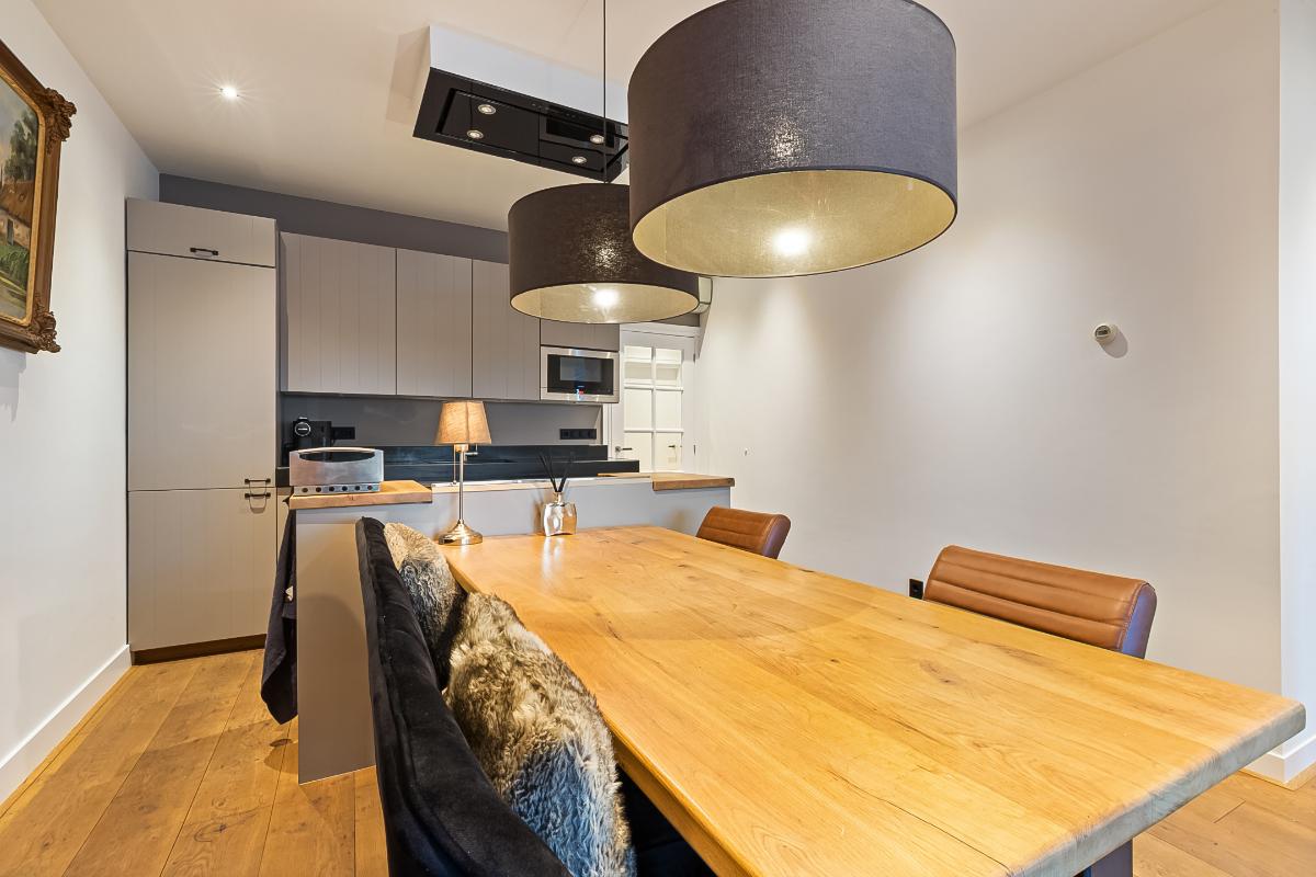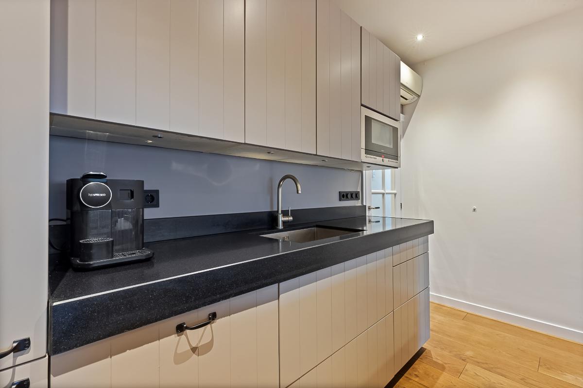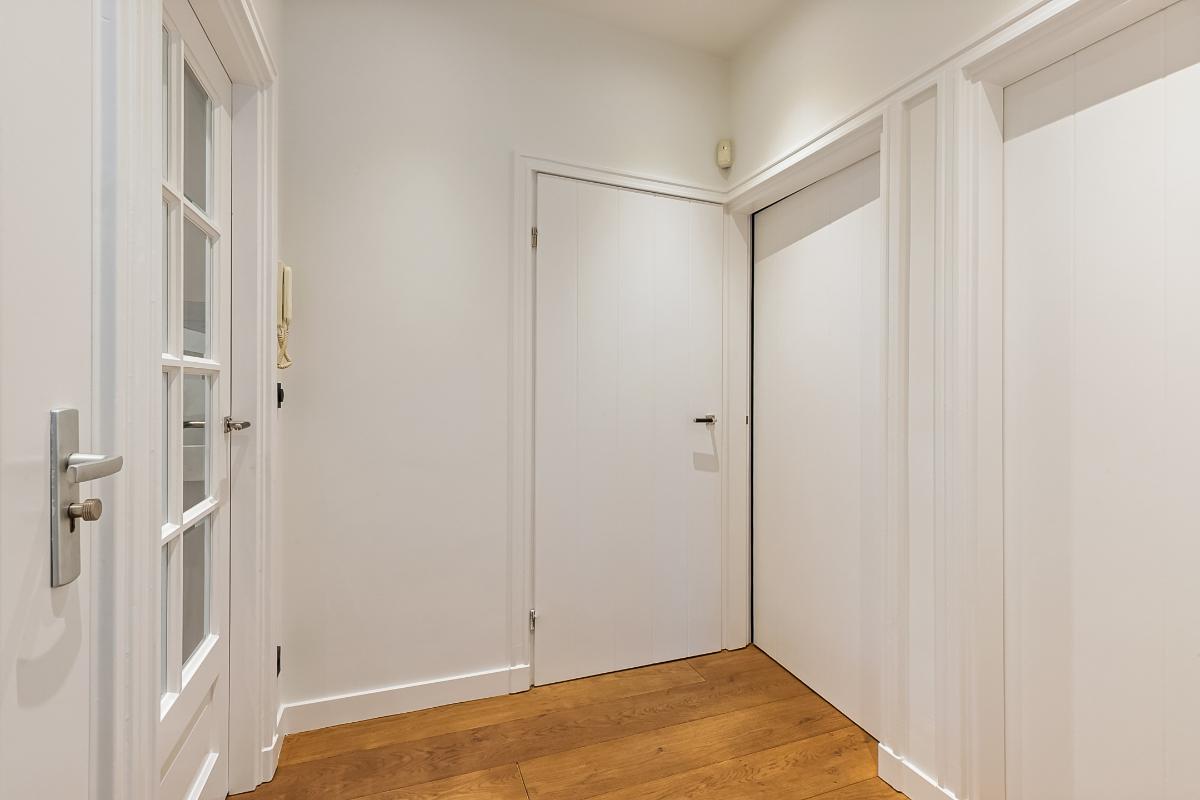 Entree, hal, kast met c.v. ketel en aansluiting voor de wasmachine, riante living met open keuken die is voorzien van een kookeiland en alle denkbare apparatuur zoals een fornuis met 5-pits gaskookplaat en grote oven, hoge afzuigkap, vaatwasser, koel/vriescombinatie, magnetron en in de kamer zit nog een wijnkoelkast. De woonkamer is heerlijk licht en is voorzien van openslaande deuren naar het terras. Het gehele appartement is voorzien van houten vloerdelen en er is een airco-installatie aanwezig.