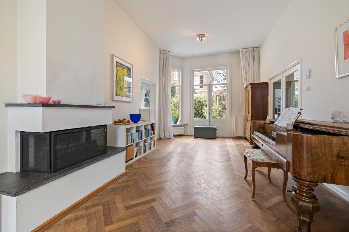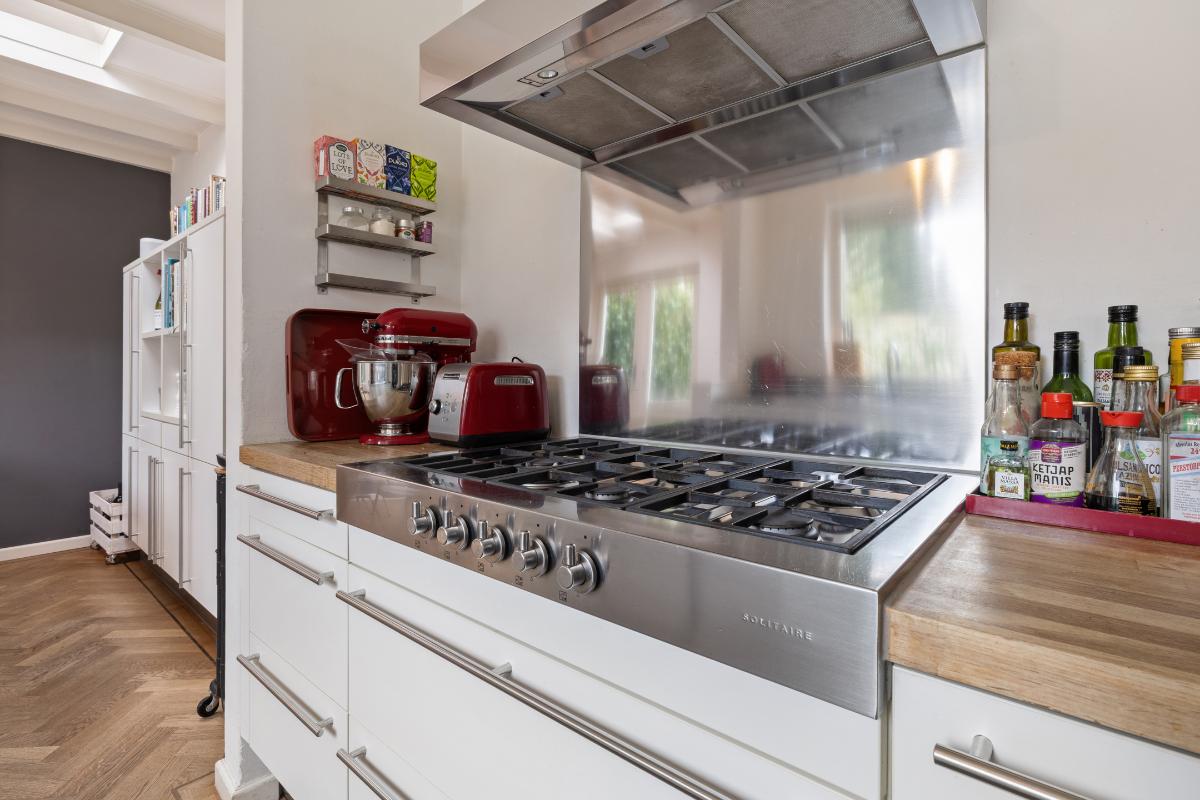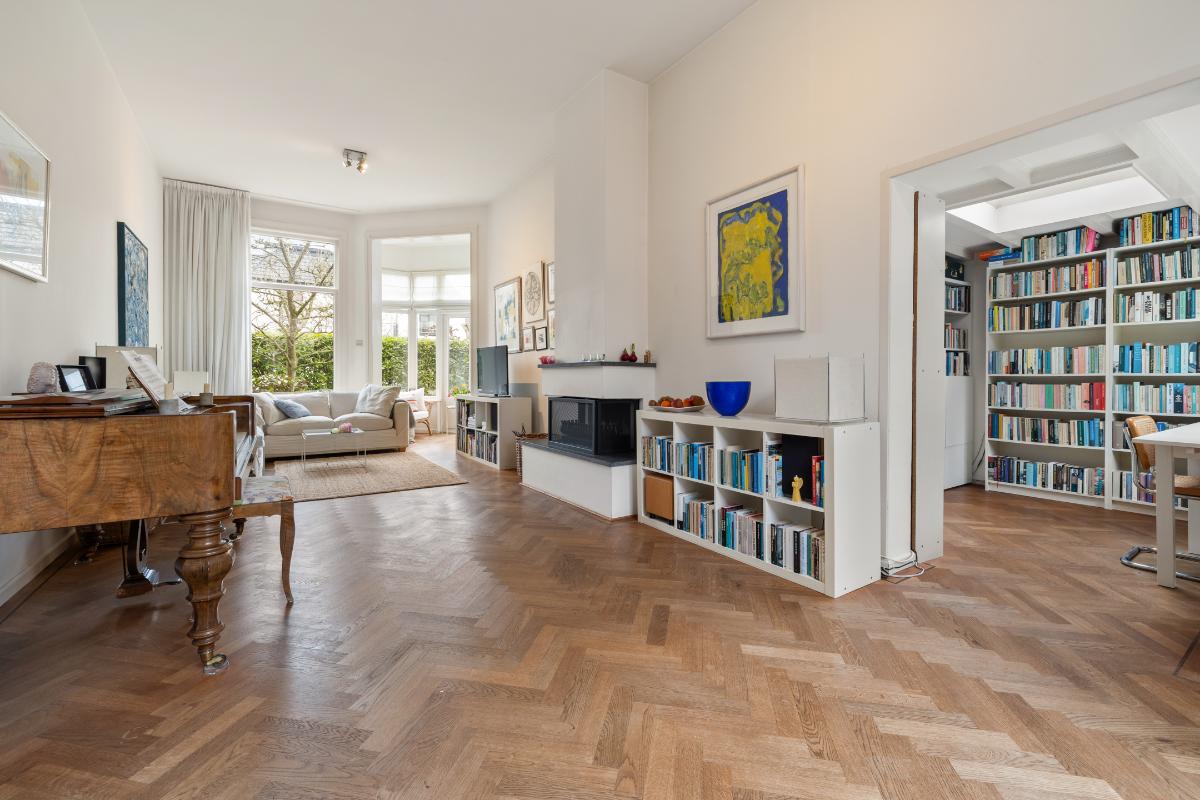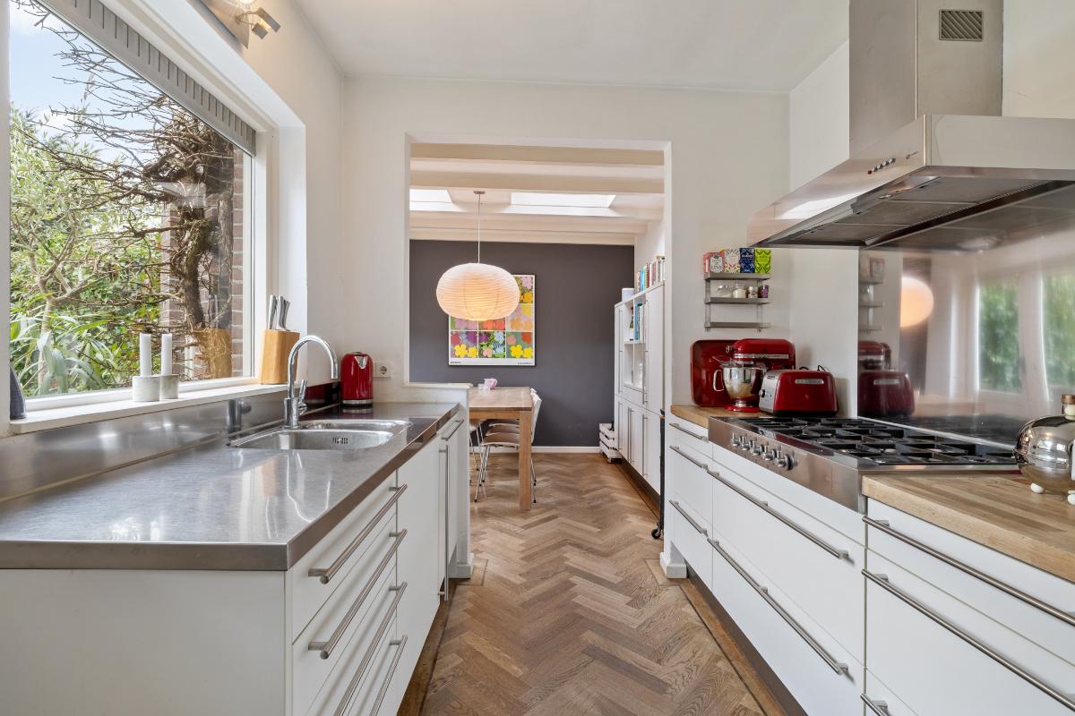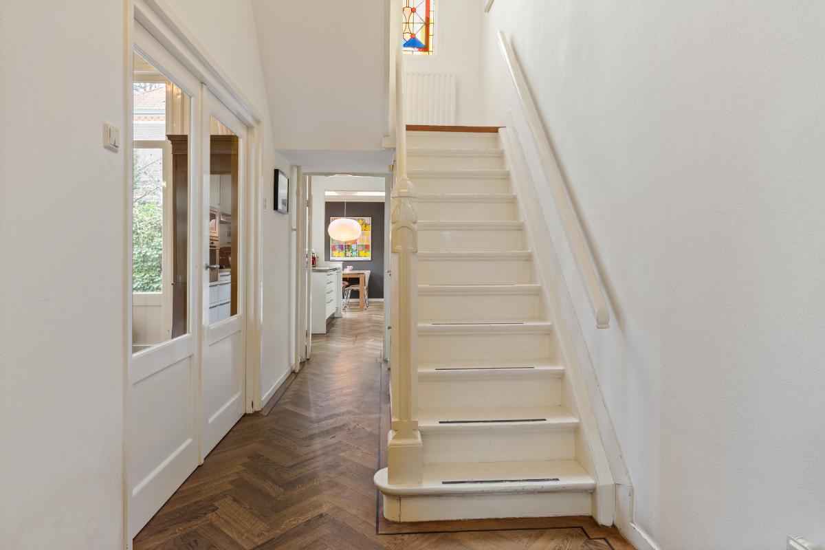 Begane grond: Entree, vestibule met originele vloertegels en garderobe, royale hal met mooi trappenhuis met bordestrap met prachtig glas in loodraam, trapkast , toilet met fontein, dubbele deuren naar de living die zich laat kenmerken door hoge raampartijen en heel veel licht. De woonkamer is voorzien van een eiken visgraat parketvloer, een open haard, hoge plafonds, glad stucwerk, openslaande deuren aan de aan de achterzijde, een serre aan de voorzijde met openslaande deuren en een aparte werkkamer met dakvenster aan de zijkant en ramen naar de achtertuin. Thuiswerken wordt weer een feestje! Aan de achterzijde van het huis bevindt zich de uitgebouwde eetkeuken. De eetkeuken is net als de living heerlijk licht door veel raampartijen en openslaande deuren naar de tuin en twee dakvensters. De eetkeuken is tevens voorzien van dezelfde visgraat parketvloer en beschikt over een Solitair 5 pits gaskookplaat en afzuigkap, koel en vriescombinatie, vaatwasser, oven en magnetron.