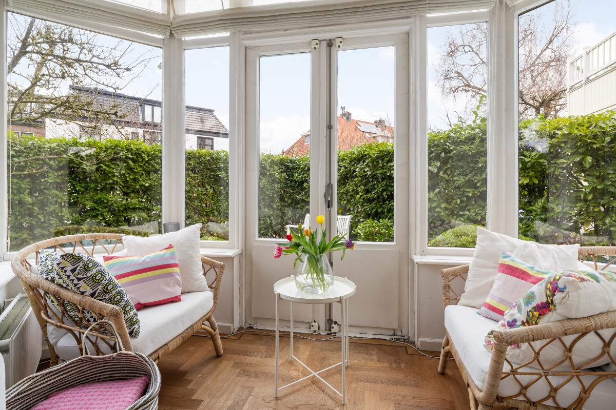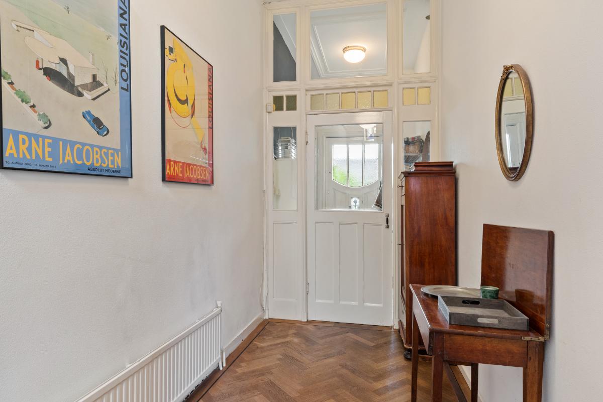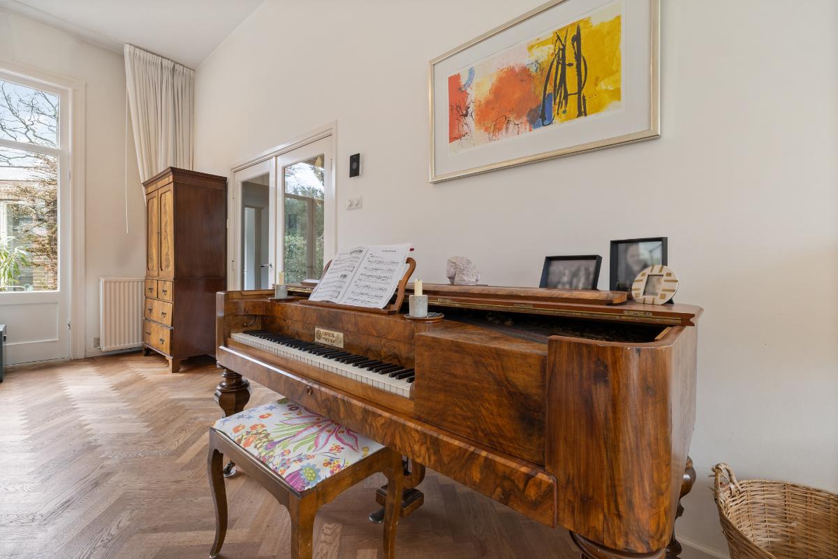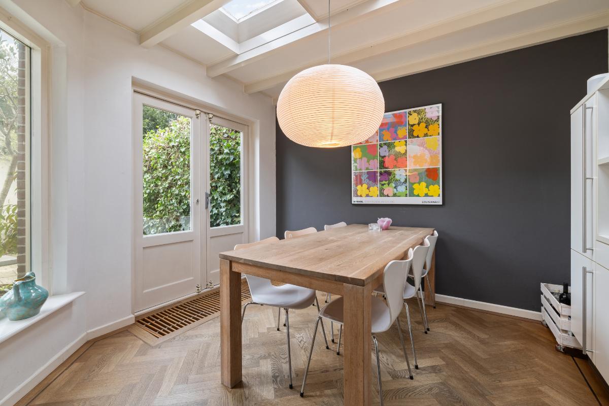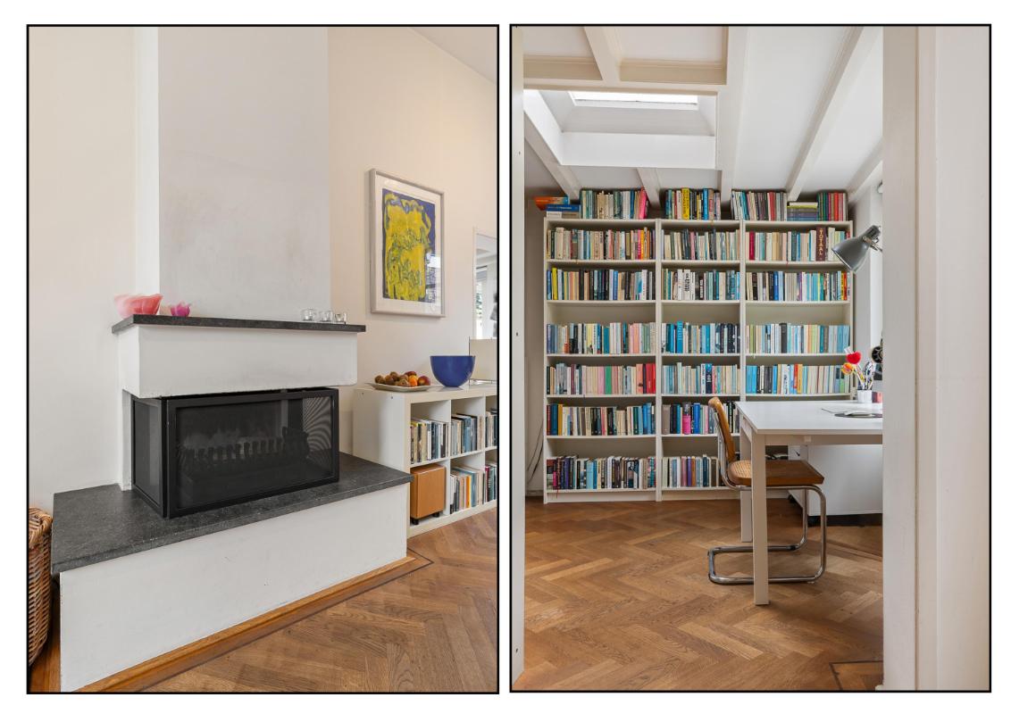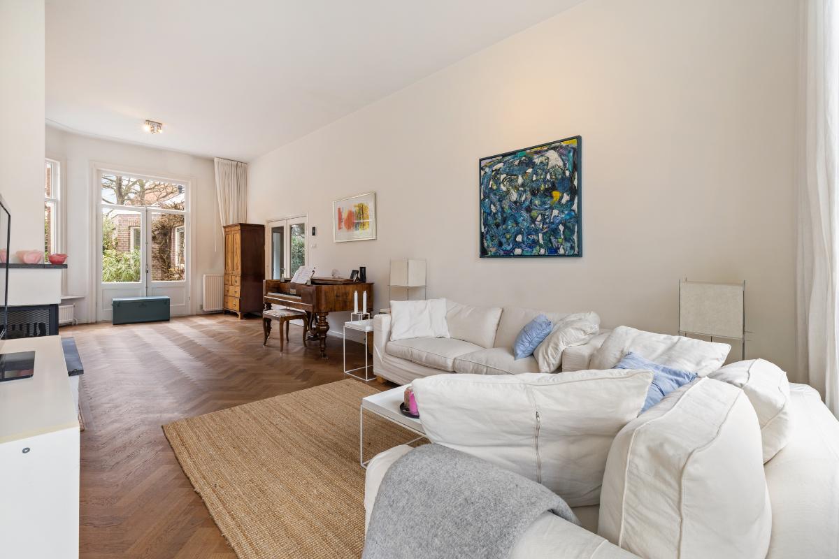Begane grond: Entree, vestibule met originele vloertegels en garderobe, royale hal met mooi trappenhuis met bordestrap met prachtig glas in loodraam, trapkast , toilet met fontein, dubbele deuren naar de living die zich laat kenmerken door hoge raampartijen en heel veel licht. De woonkamer is voorzien van een eiken visgraat parketvloer, een open haard, hoge plafonds, glad stucwerk, openslaande deuren aan de aan de achterzijde, een serre aan de voorzijde met openslaande deuren en een aparte werkkamer met dakvenster aan de zijkant en ramen naar de achtertuin. Thuiswerken wordt weer een feestje! Aan de achterzijde van het huis bevindt zich de uitgebouwde eetkeuken. De eetkeuken is net als de living heerlijk licht door veel raampartijen en openslaande deuren naar de tuin en twee dakvensters. De eetkeuken is tevens voorzien van dezelfde visgraat parketvloer en beschikt over een Solitair 5 pits gaskookplaat en afzuigkap, koel en vriescombinatie, vaatwasser, oven en magnetron.