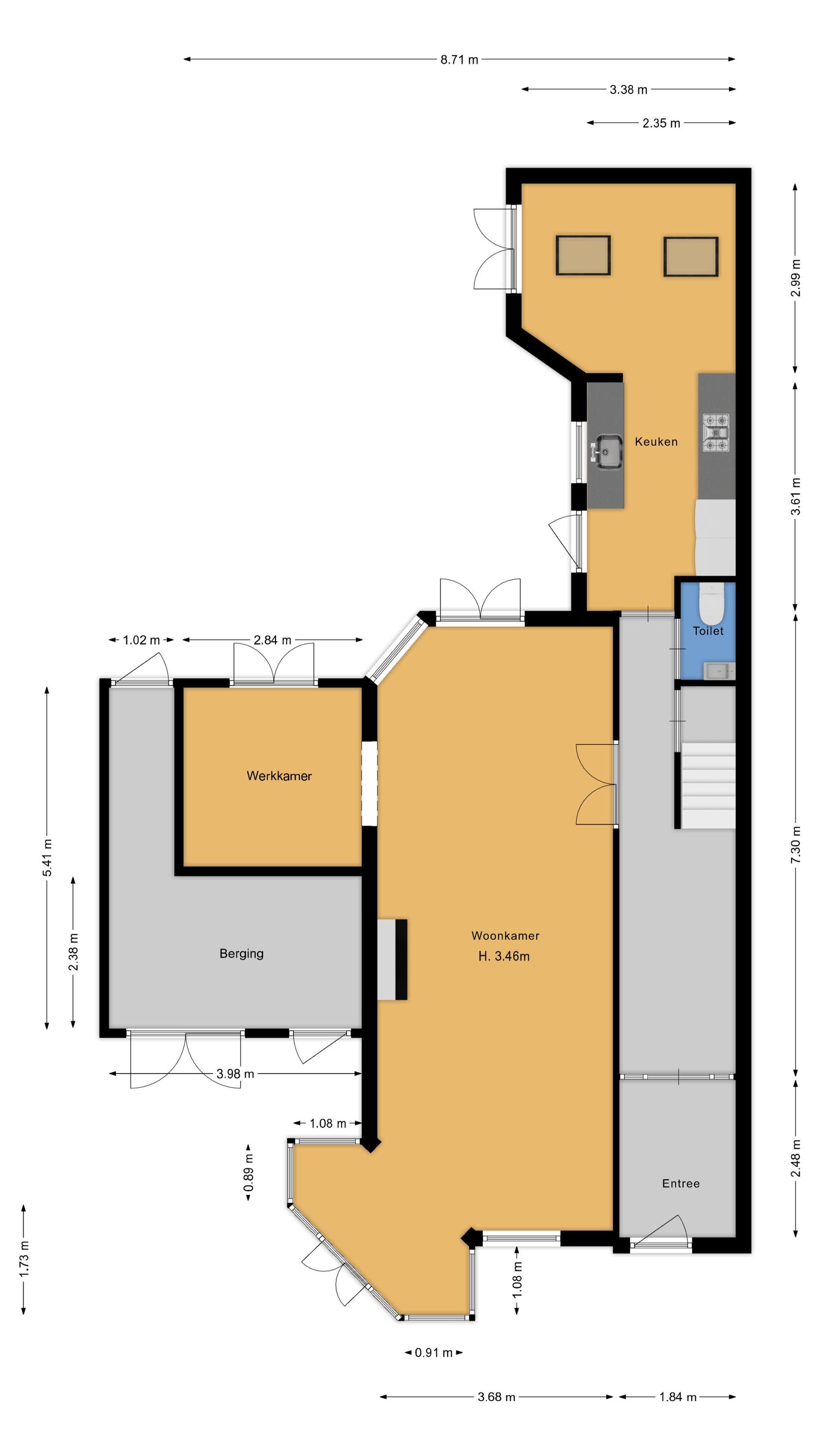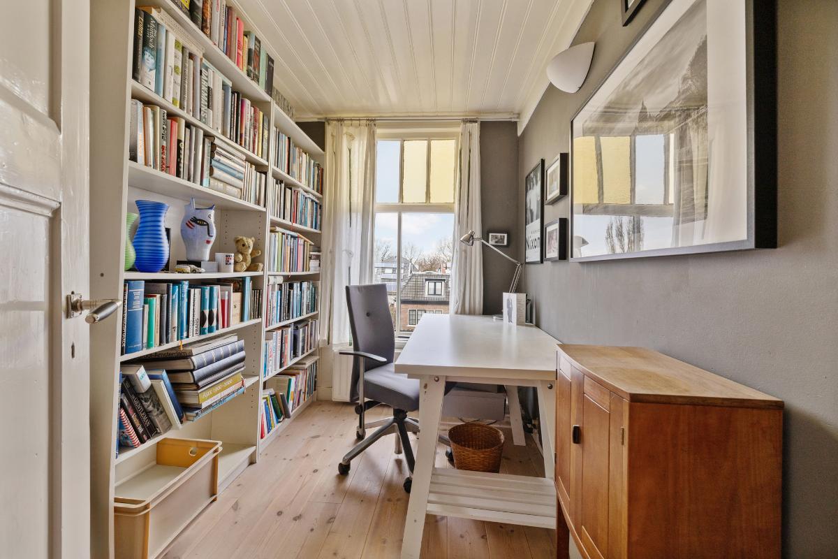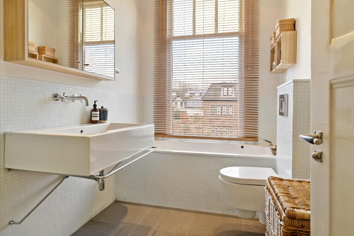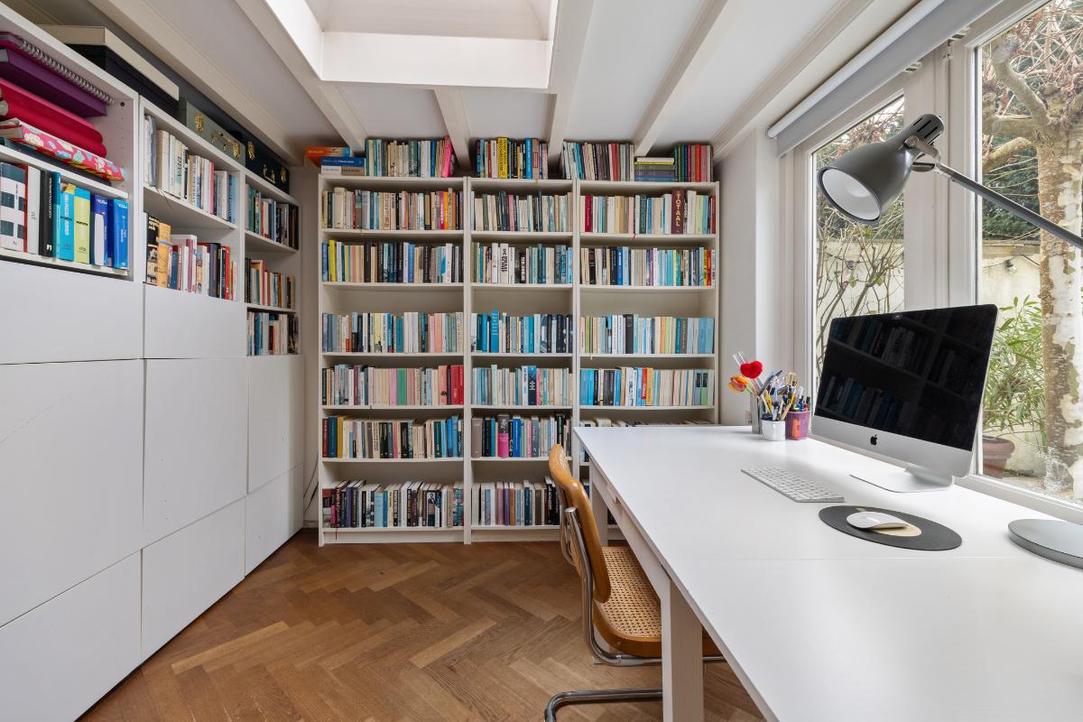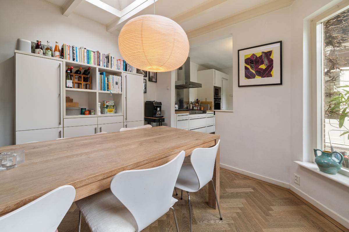 Begane grond: Entree, vestibule met originele vloertegels en garderobe, royale hal met mooi trappenhuis met bordestrap met prachtig glas in loodraam, trapkast , toilet met fontein, dubbele deuren naar de living die zich laat kenmerken door hoge raampartijen en heel veel licht. De woonkamer is voorzien van een eiken visgraat parketvloer, een open haard, hoge plafonds, glad stucwerk, openslaande deuren aan de aan de achterzijde, een serre aan de voorzijde met openslaande deuren en een aparte werkkamer met dakvenster aan de zijkant en ramen naar de achtertuin. Thuiswerken wordt weer een feestje! Aan de achterzijde van het huis bevindt zich de uitgebouwde eetkeuken. De eetkeuken is net als de living heerlijk licht door veel raampartijen en openslaande deuren naar de tuin en twee dakvensters. De eetkeuken is tevens voorzien van dezelfde visgraat parketvloer en beschikt over een Solitair 5 pits gaskookplaat en afzuigkap, koel en vriescombinatie, vaatwasser, oven en magnetron.
