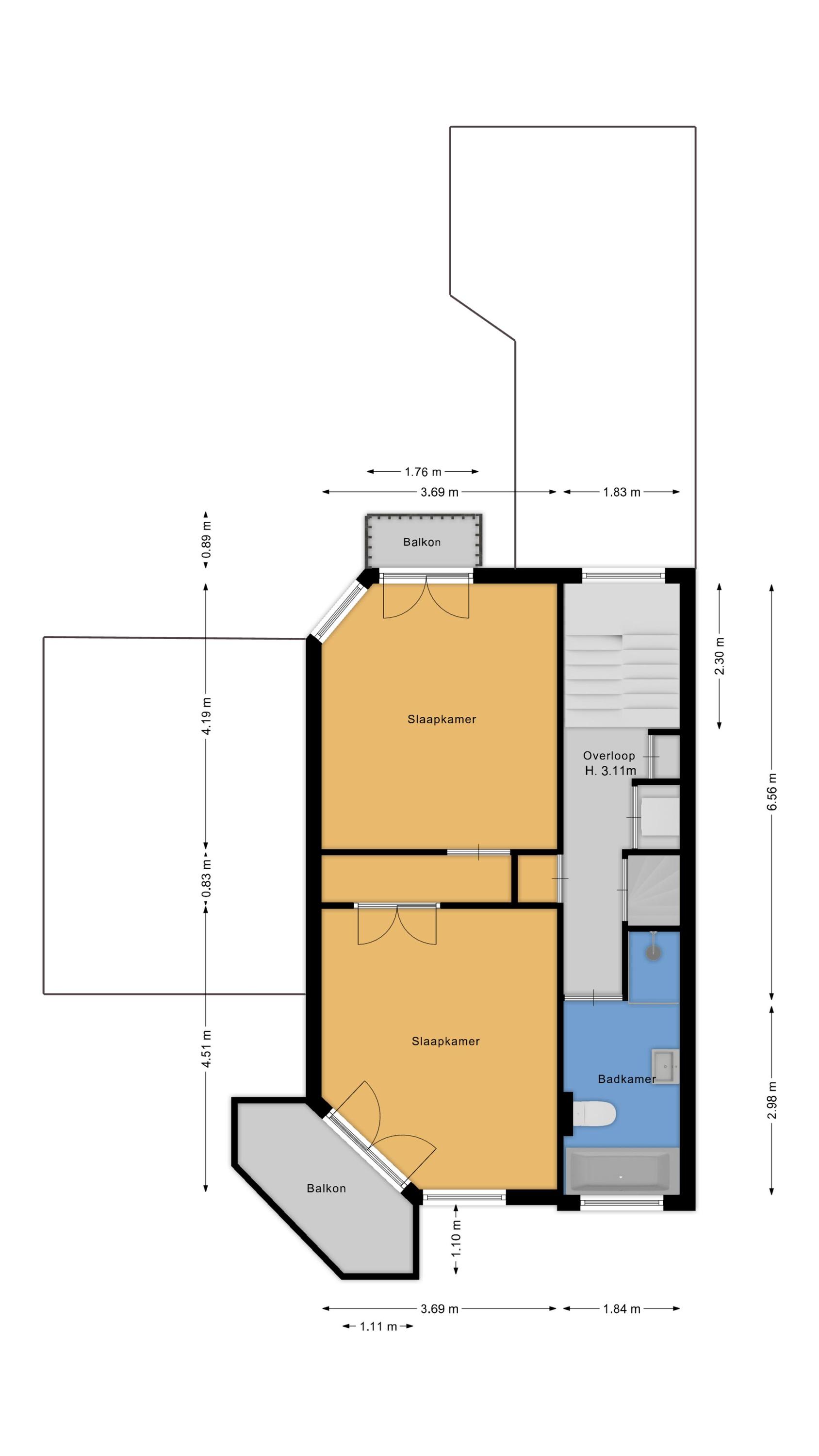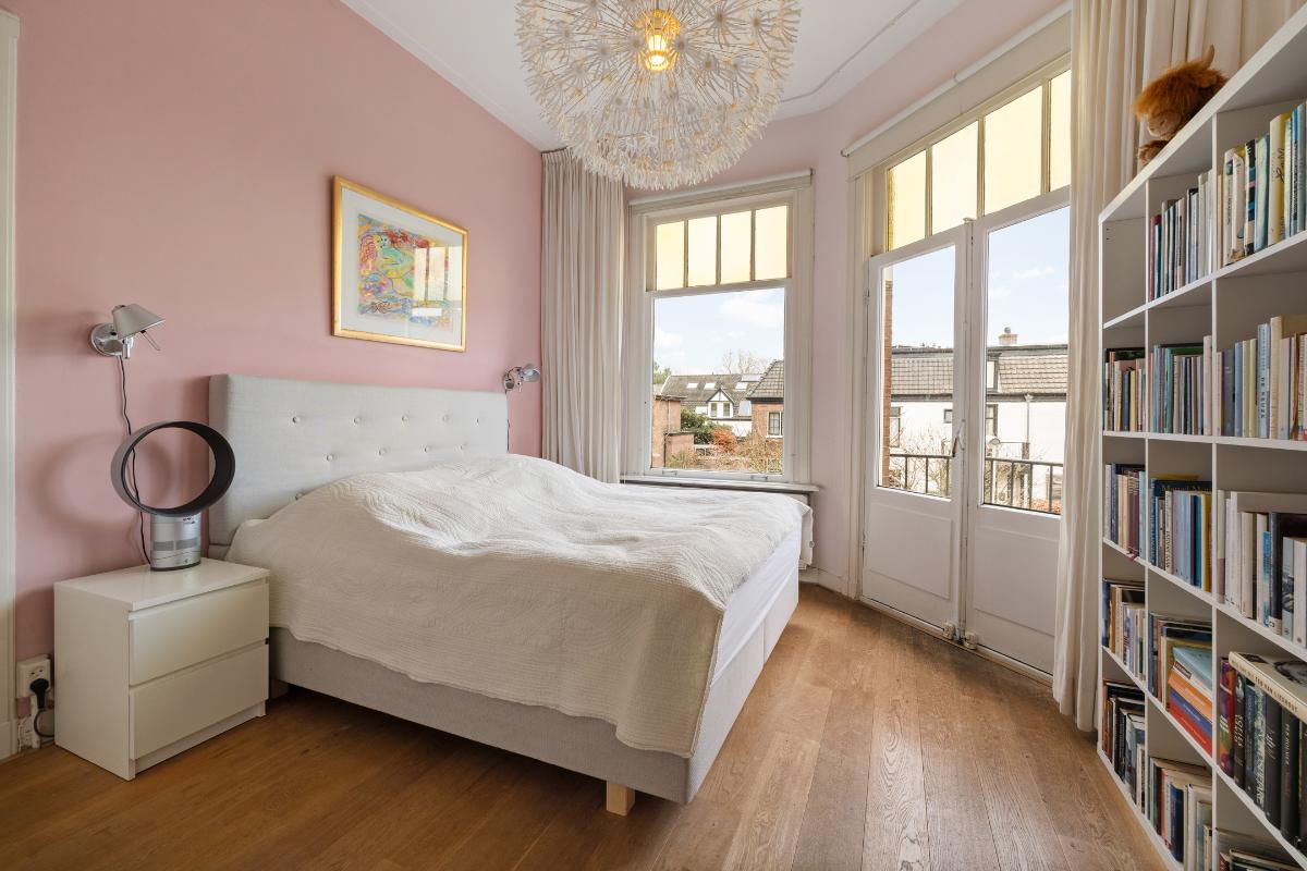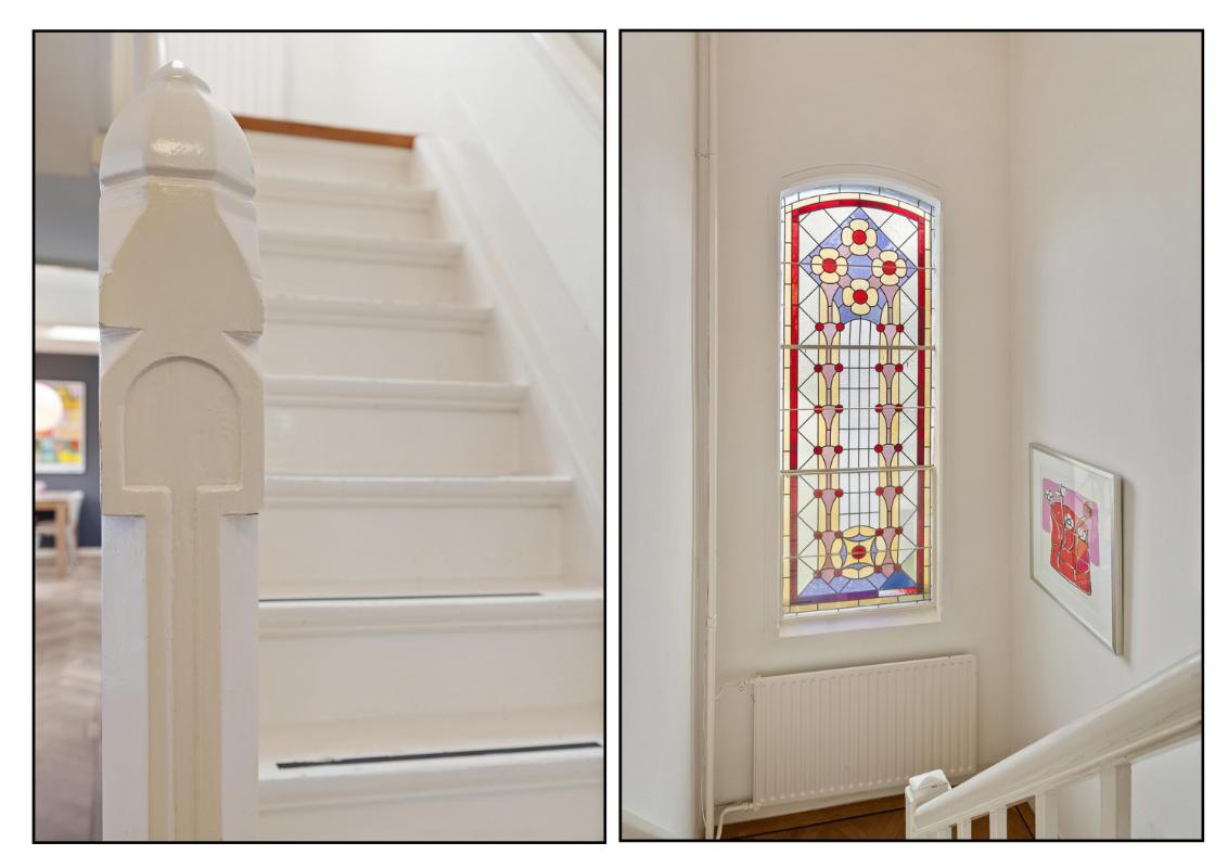 1e Verdieping: Via de bordestrap met een prachtig glas in loodraam bereikt men de 1e verdieping. Overloop met een vaste kast en een kast met aansluiting voor de wasmachine en de droger. Hoofdslaapkamer aan de voorzijde met openslaande deuren naar een sfeervol balkon. De slaapkamer aan de achterzijde is teven voorzien van openslaande deuren en een balkon. Beide kamers hebben een ruime vaste kast. De badkamer is voorzien van een whirlpool, inloopdouche, toilet, wastafel en vloerverwarming. De gehele verdieping is voorzien van een houten delenvloer.