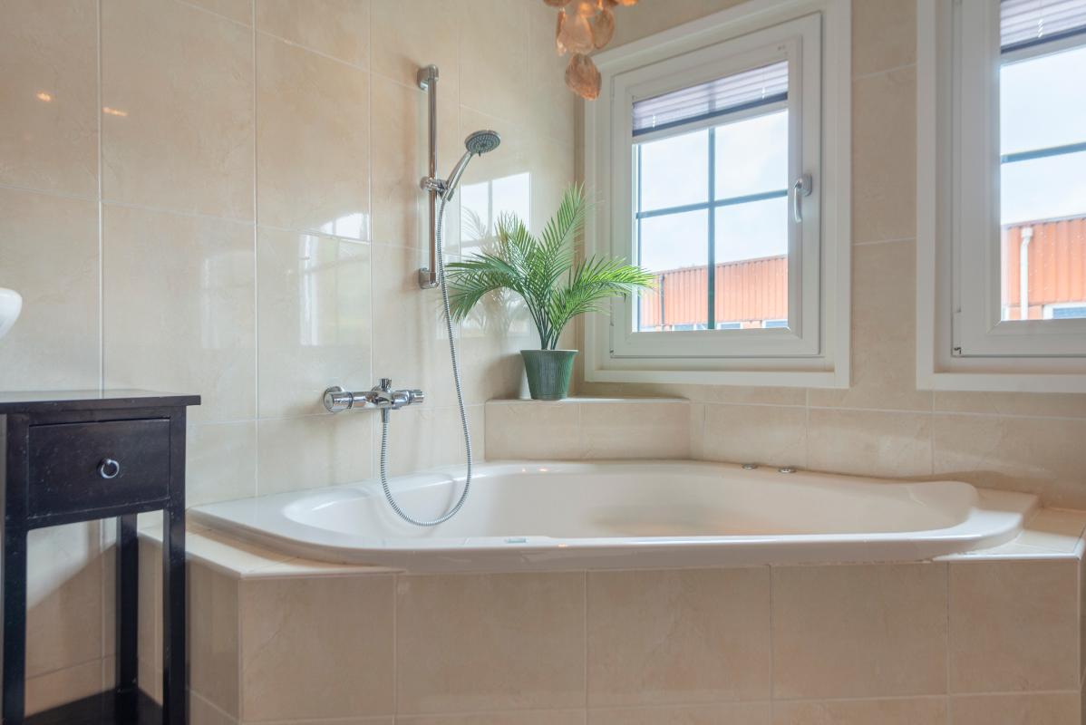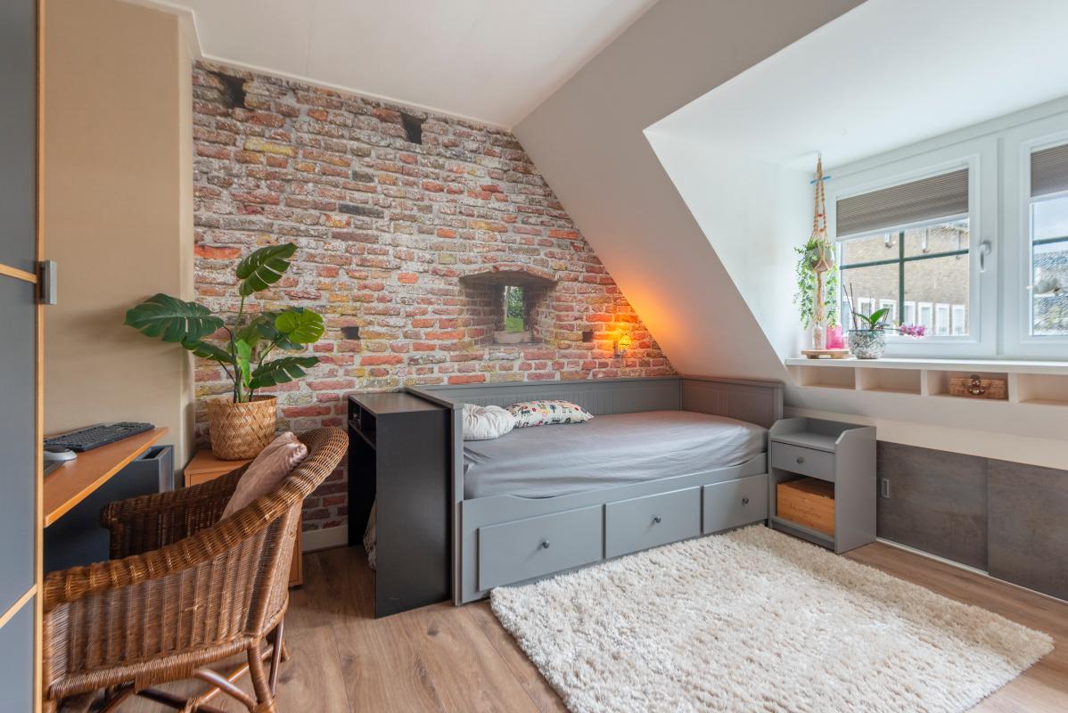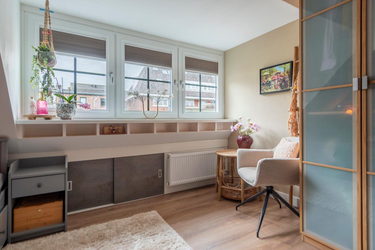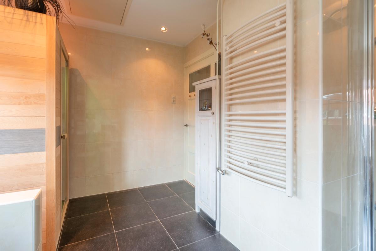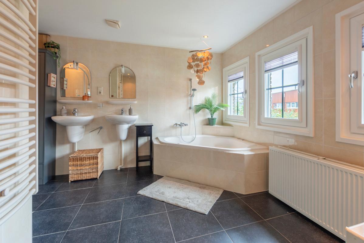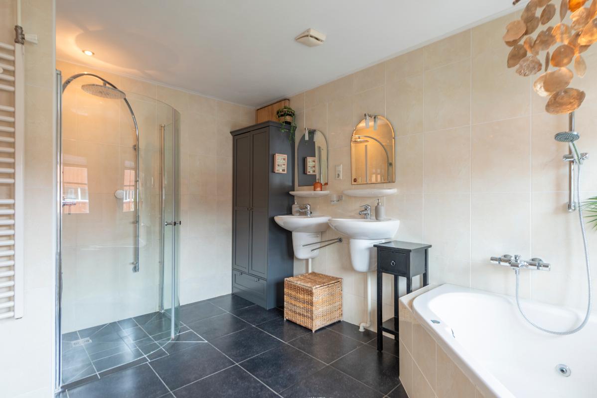Eerste verdieping: Overloop, was-droog- en stookruimte aan de voorzijde. Grote slaapkamer aan de voorzijde met dakkapel die is vernieuwd in 2023. Grote 2e slaapkamer aan de achterzijde. Uitzonderlijk grote badkamer die is voorzien van een hoekligbad met whirlpool functie, douche, een dubbele wastafel, handdoek radiator en een sauna. Deze badkamer is zo groot omdat hier het huis boven de naastgelegen poort is gebouwd. Het is mogelijk om een derde slaapkamer te maken en een kleinere badkamer. De gehele eerste verdieping is voorzien van kunststof kozijnen en ramen met HR++ glas.