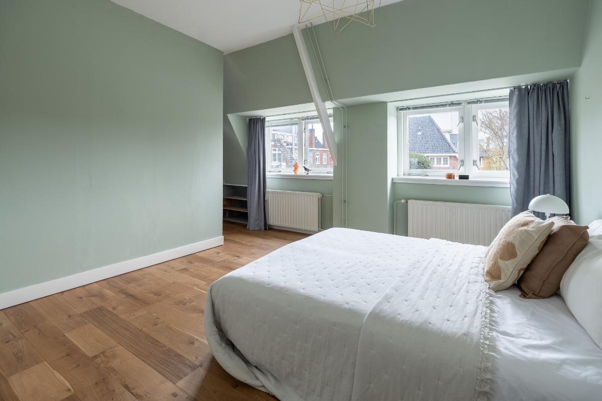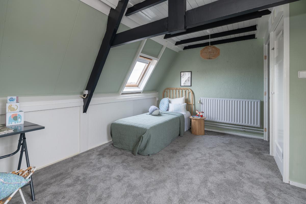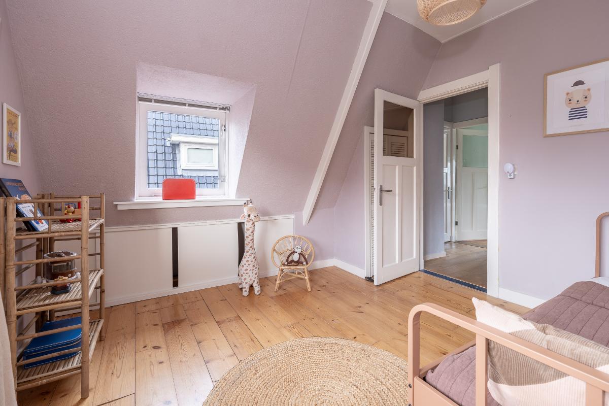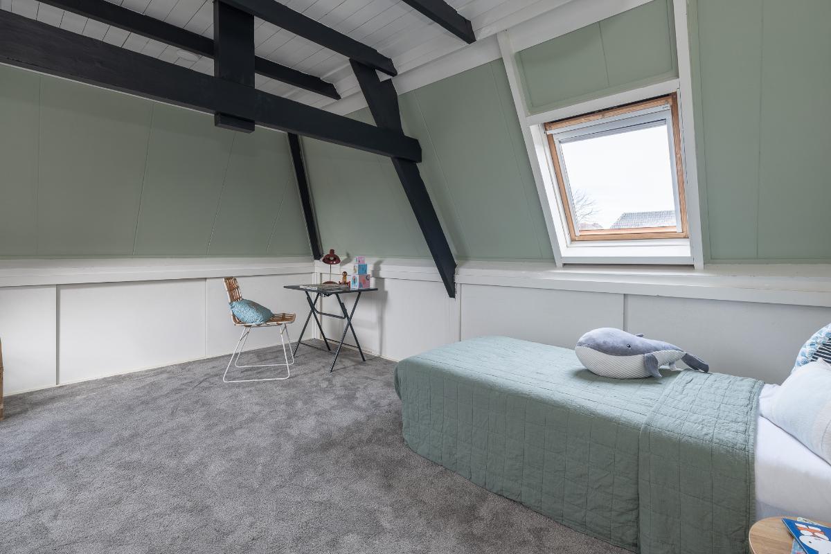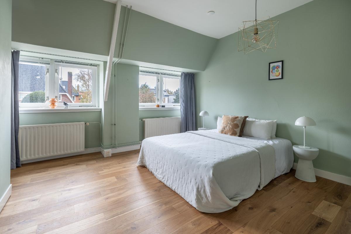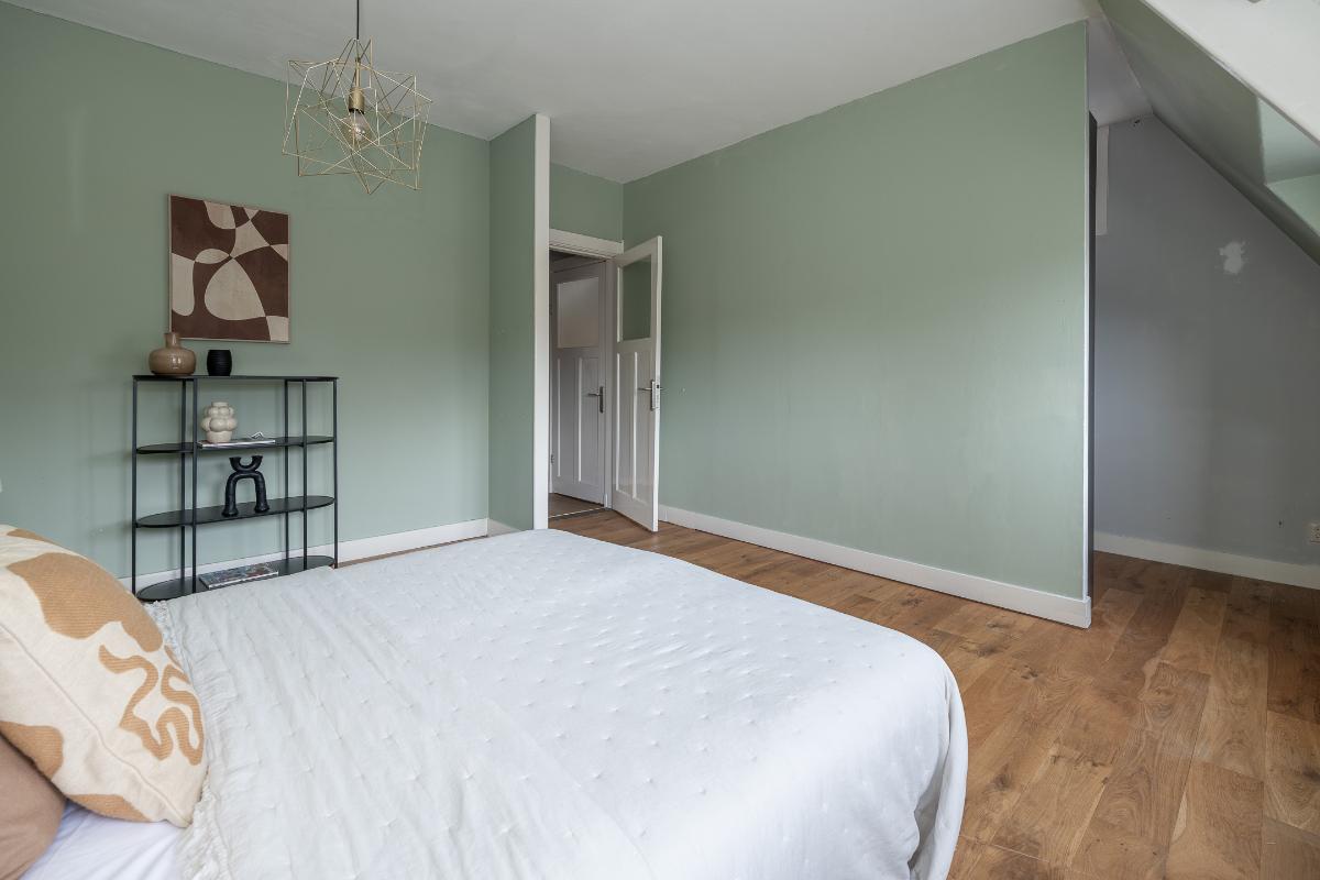 Eerste verdieping: Via de bordestrap bereikt men de overloop. Grote slaapkamer aan de voorzijde met een dakkapel en een raam aan de voor- en zijkant, een hele grote ouderslaapkamer aan de achterzijde (voorheen 2 kamers) met dakkapellen en een inloopkast. De moderne badkamer dateert grotendeels uit 2025 en is voorzien van vloerverwarming, een inloopdouche met rainshower, wastafelmeubel, spiegelkast en toilet. De badkamer is voorzien van bovenlichten voor fijn daglicht.