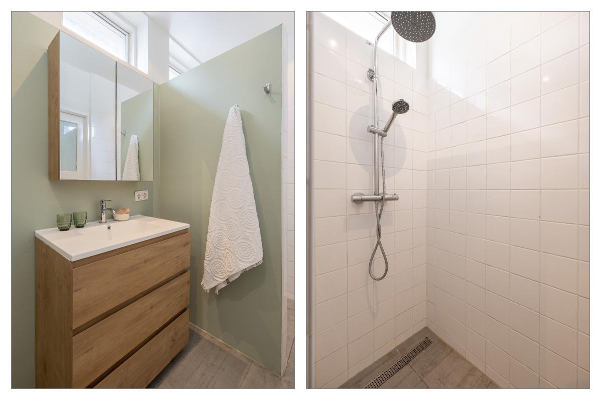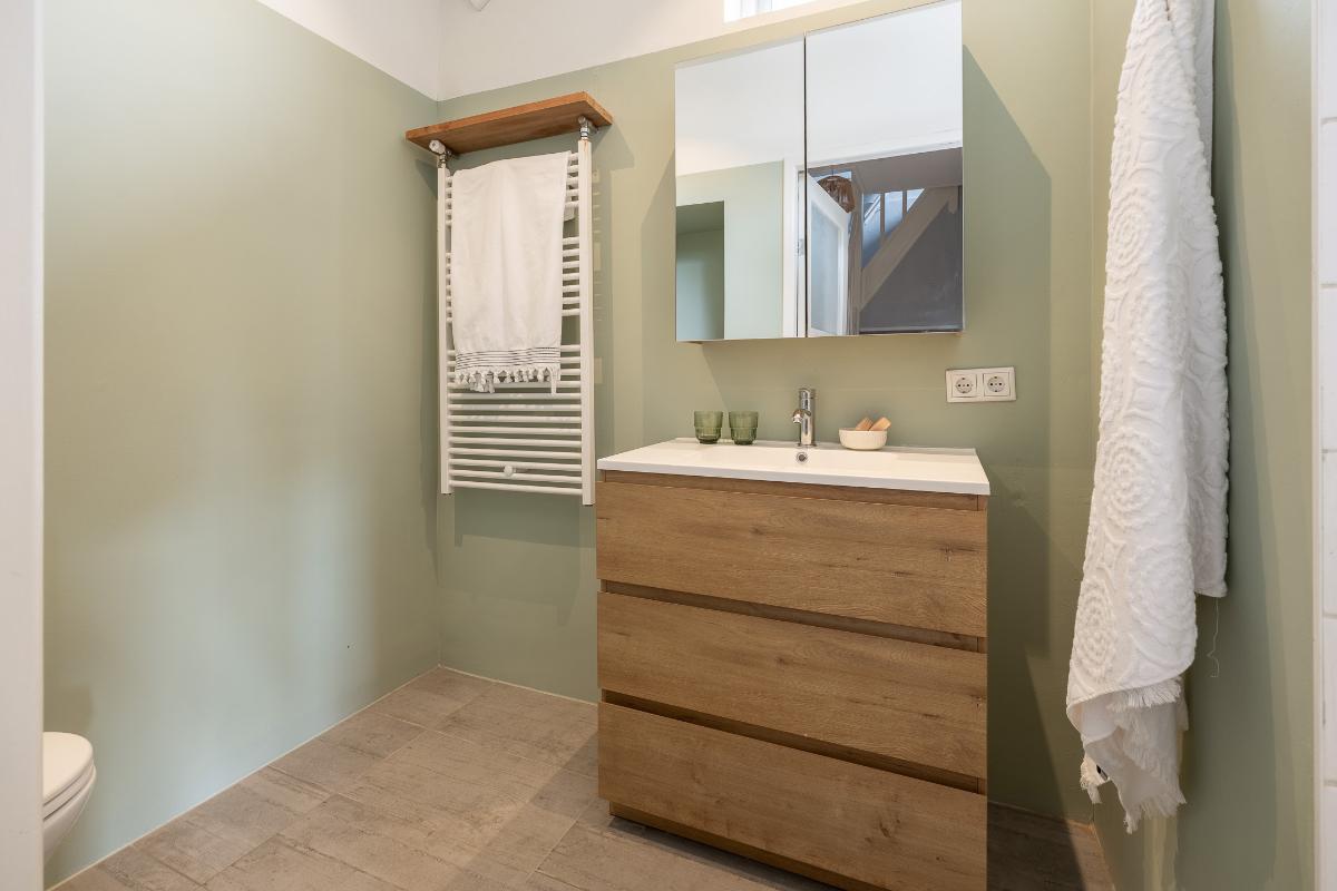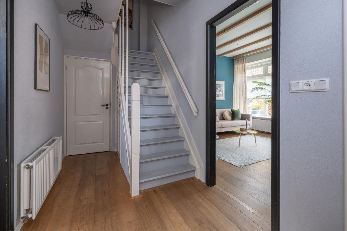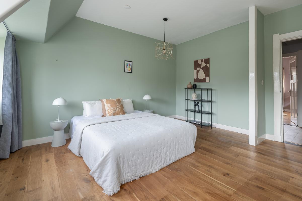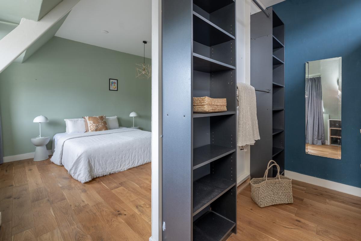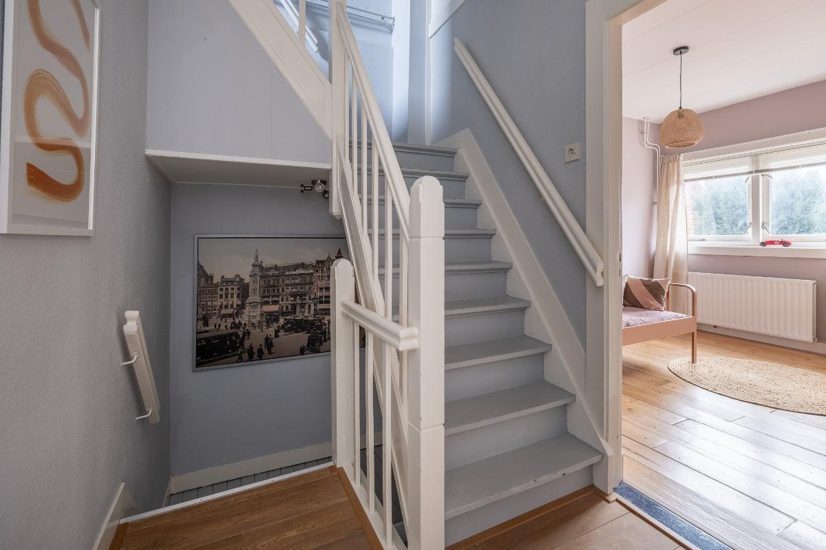 Eerste verdieping: Via de bordestrap bereikt men de overloop. Grote slaapkamer aan de voorzijde met een dakkapel en een raam aan de voor- en zijkant, een hele grote ouderslaapkamer aan de achterzijde (voorheen 2 kamers) met dakkapellen en een inloopkast. De moderne badkamer dateert grotendeels uit 2025 en is voorzien van vloerverwarming, een inloopdouche met rainshower, wastafelmeubel, spiegelkast en toilet. De badkamer is voorzien van bovenlichten voor fijn daglicht.
