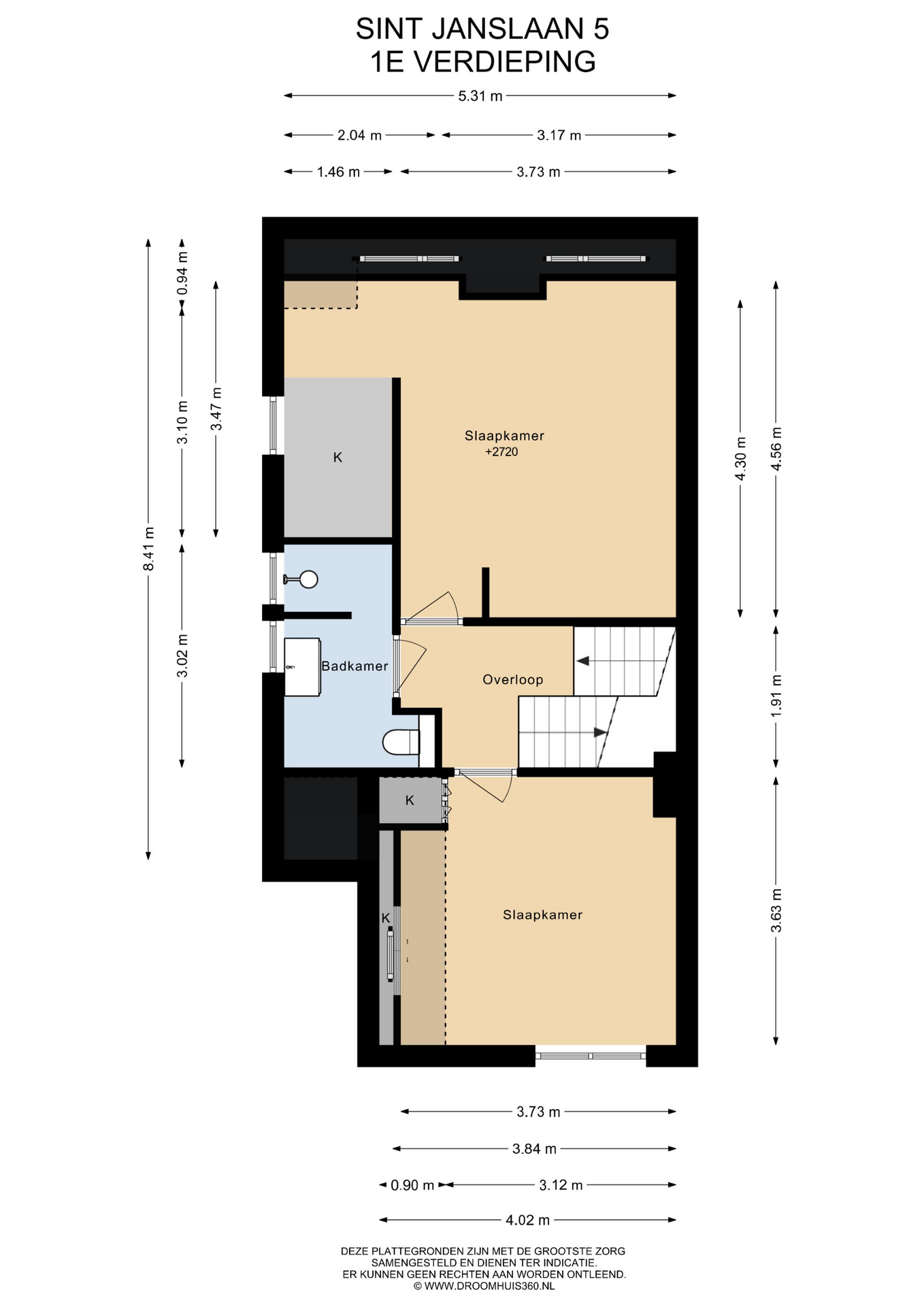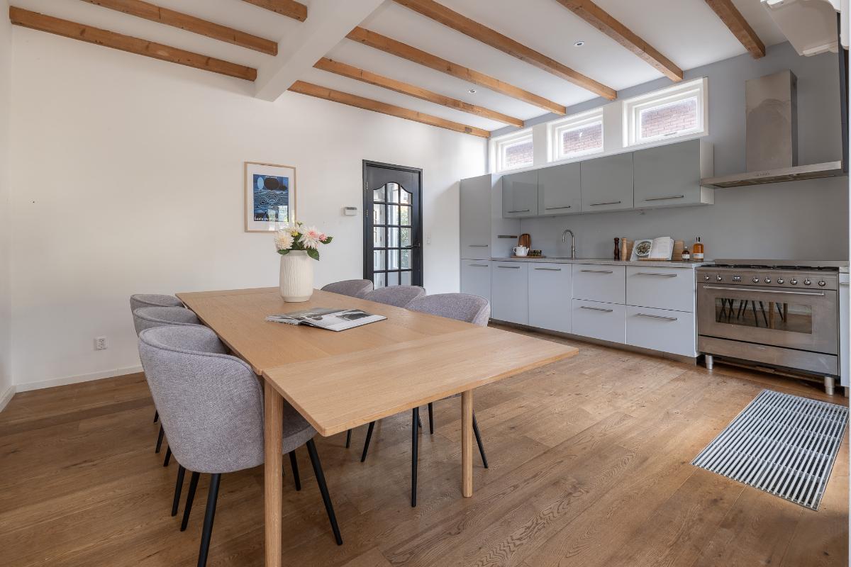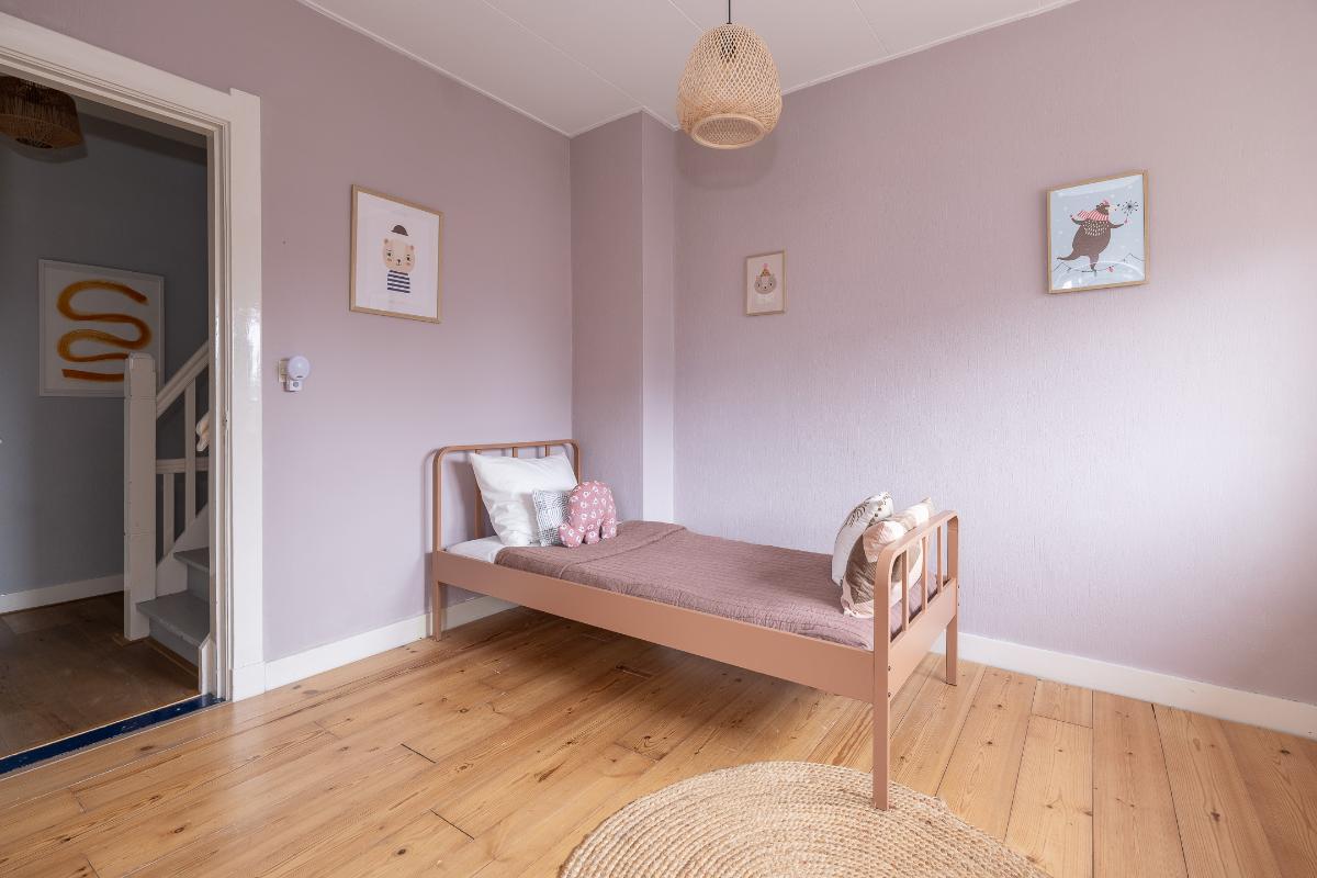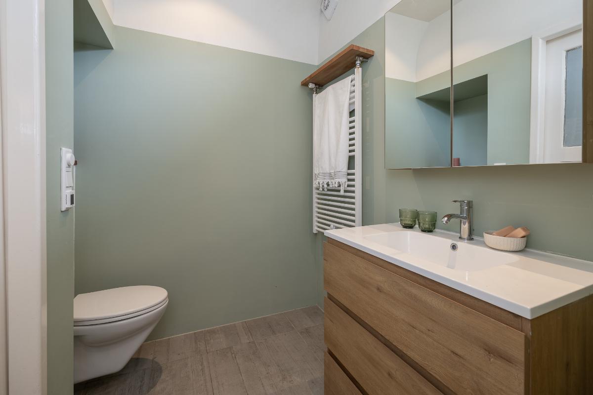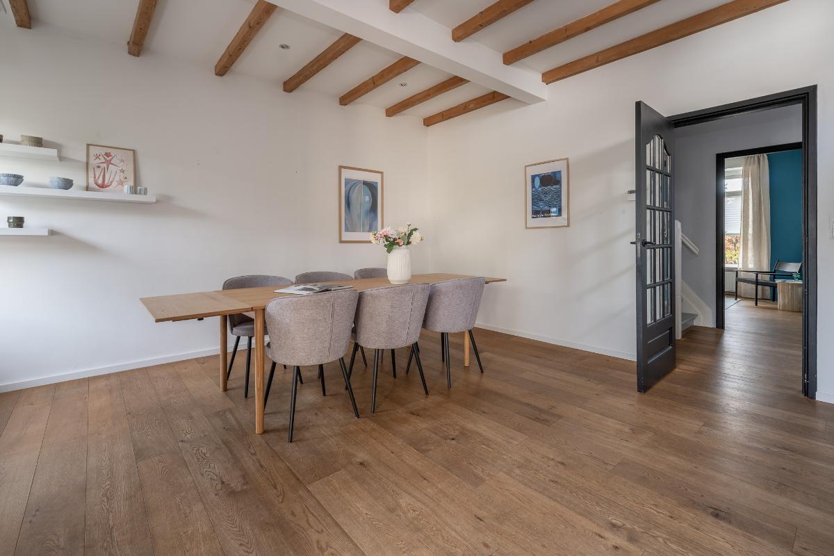 Eerste verdieping: Via de bordestrap bereikt men de overloop. Grote slaapkamer aan de voorzijde met een dakkapel en een raam aan de voor- en zijkant, een hele grote ouderslaapkamer aan de achterzijde (voorheen 2 kamers) met dakkapellen en een inloopkast. De moderne badkamer dateert grotendeels uit 2025 en is voorzien van vloerverwarming, een inloopdouche met rainshower, wastafelmeubel, spiegelkast en toilet. De badkamer is voorzien van bovenlichten voor fijn daglicht.