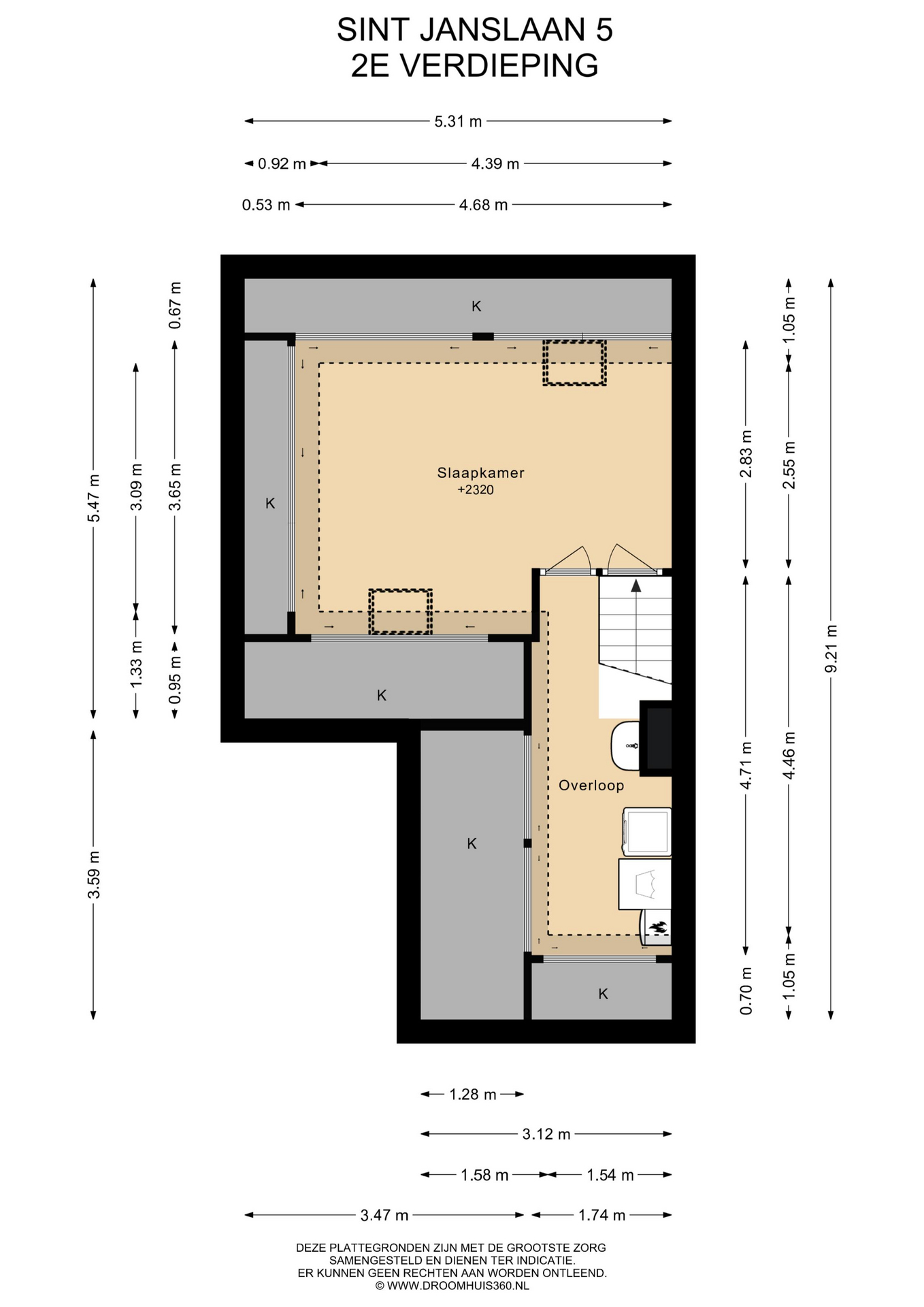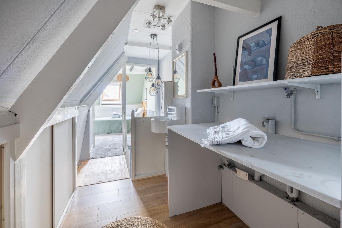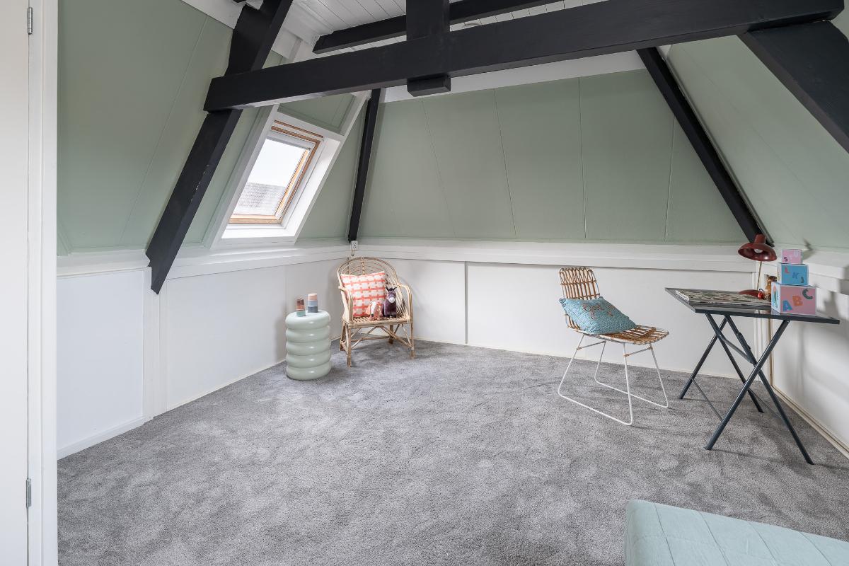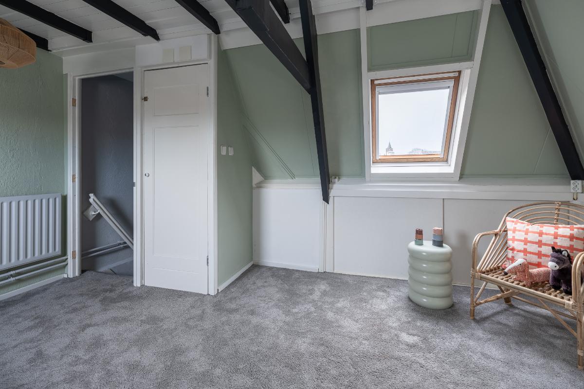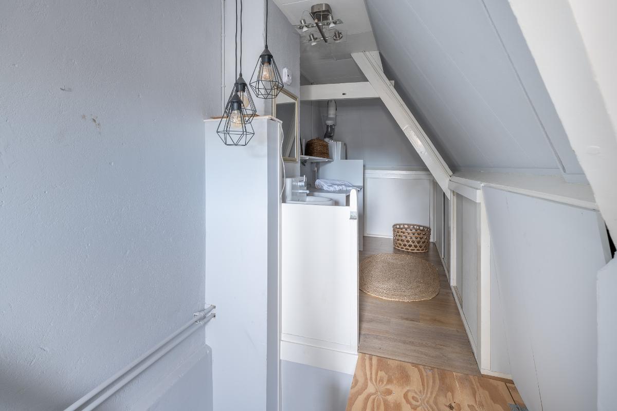 Tweede verdieping: via de doorlopende bordestrap bereikt men de zolderverdieping. Hier is een mooie grote slaapkamer met veel knieschotten voor bergruimte. De kap is geïsoleerde en er zijn 2 Velux dakvensters. Via een ingenieuze constructie is de was en stookruimte aanwezig waar de aansluitingen van wasmachine en droger en de opstelling van de c.v. ketel aanwezig zijn. Hier is tevens een wastafel aanwezig.