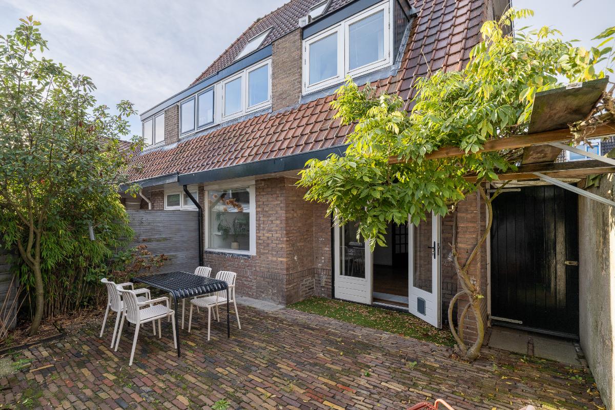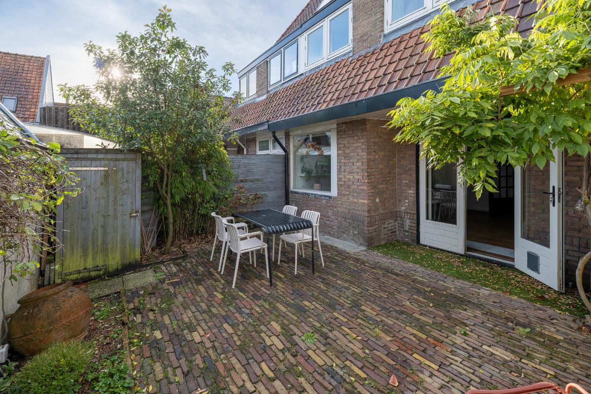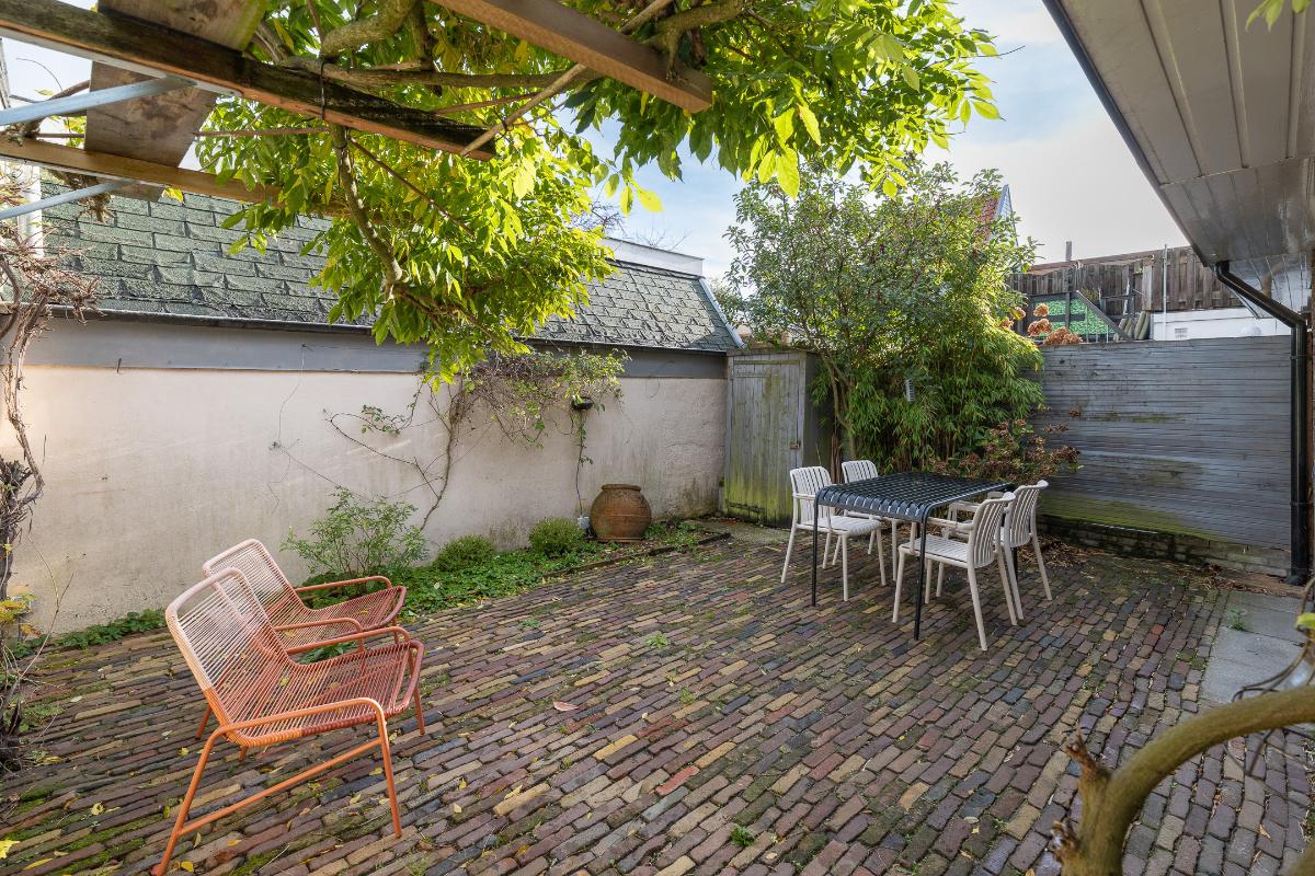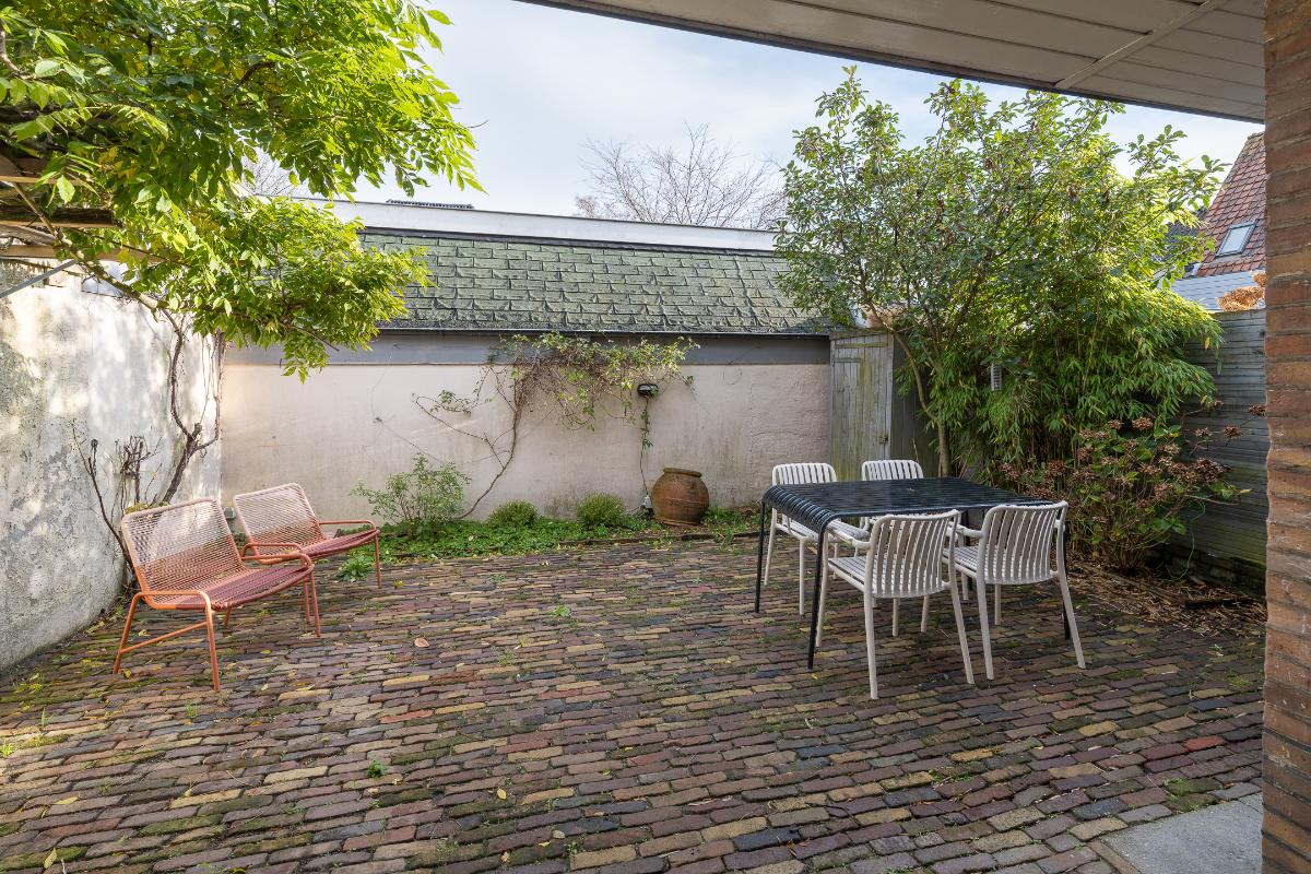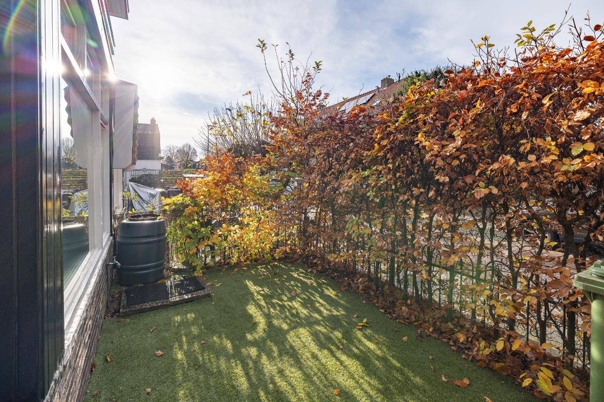 Tuin: De woning heeft een goede voortuin met een beukenhaag aanwezig die zorgt voor een prettige afstand tot de straat en geeft de nodige privacy. Via een poort aan de zijkant van het huis is de achtertuin bereikbaar die bestraat is met oude klinkers en veel privacy geeft.