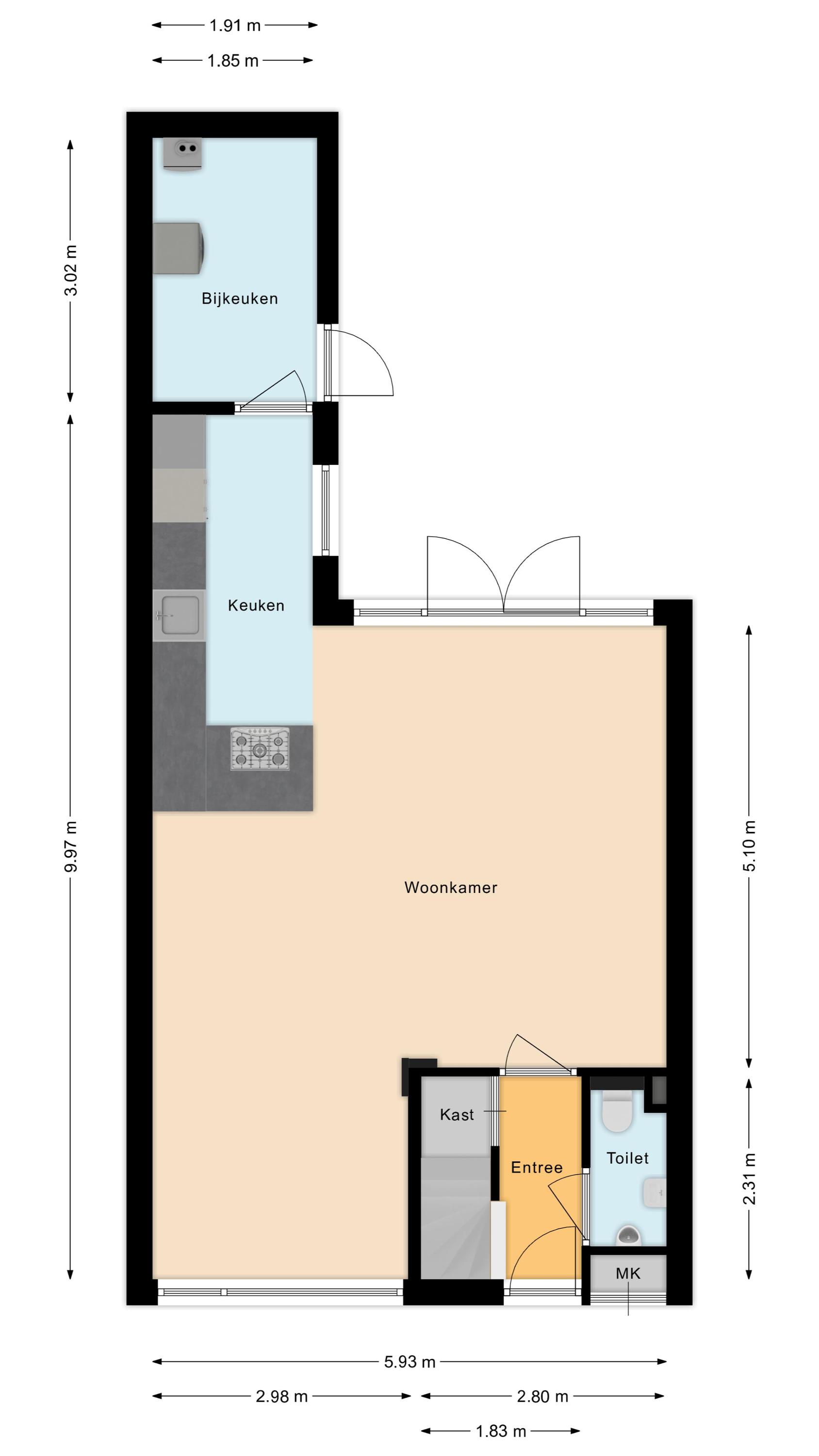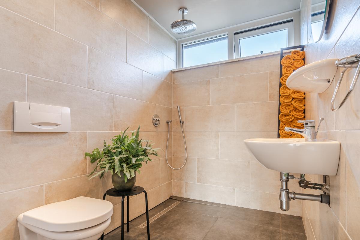 Bij binnenkomst via de ruime entree valt meteen de open en lichte woonkamer op. Hier kan je heerlijk ontspannen na een dagje strand. De moderne keuken is van alle gemakken voorzien, inclusief een handige bijkeuken waar je alles netjes kunt opbergen.