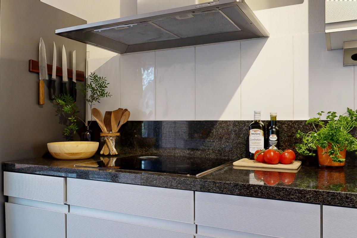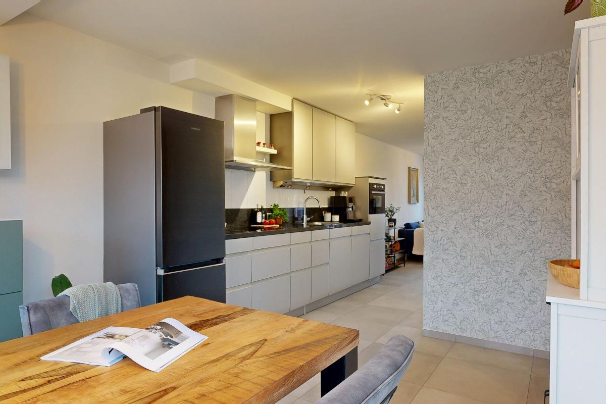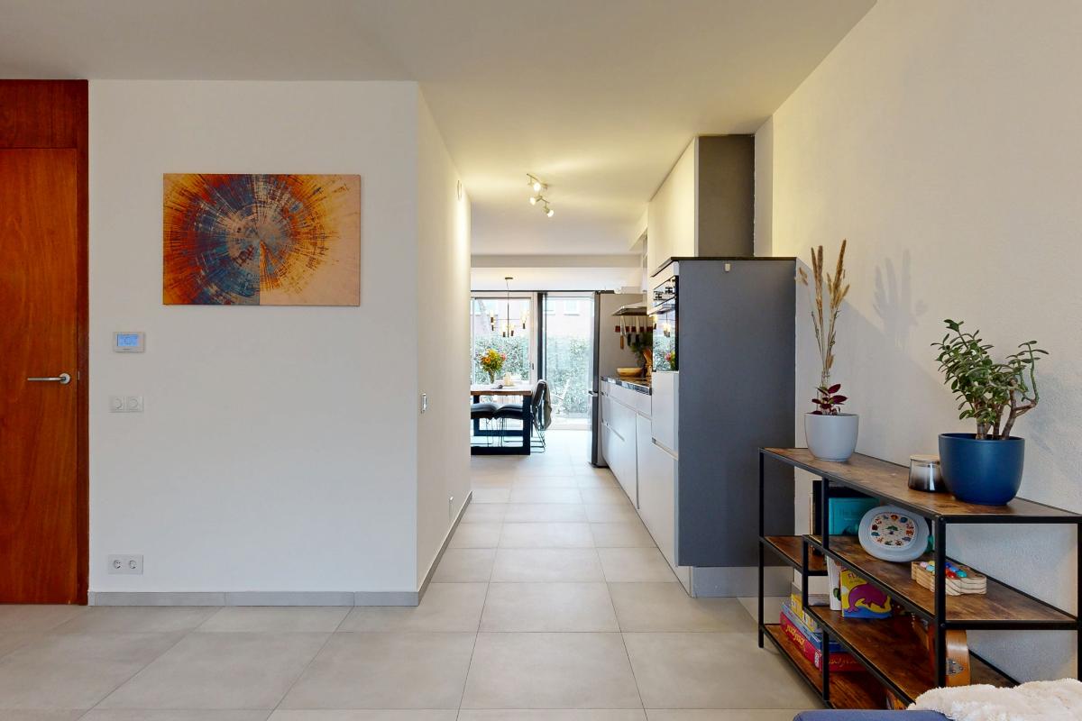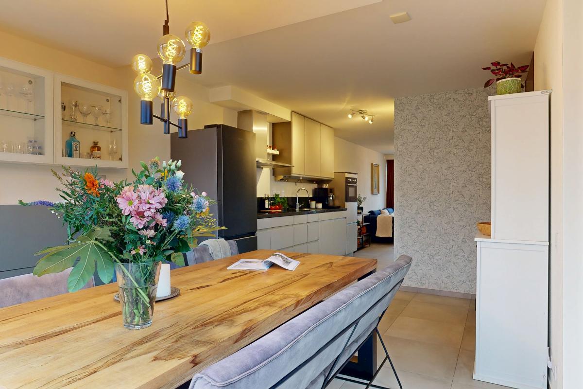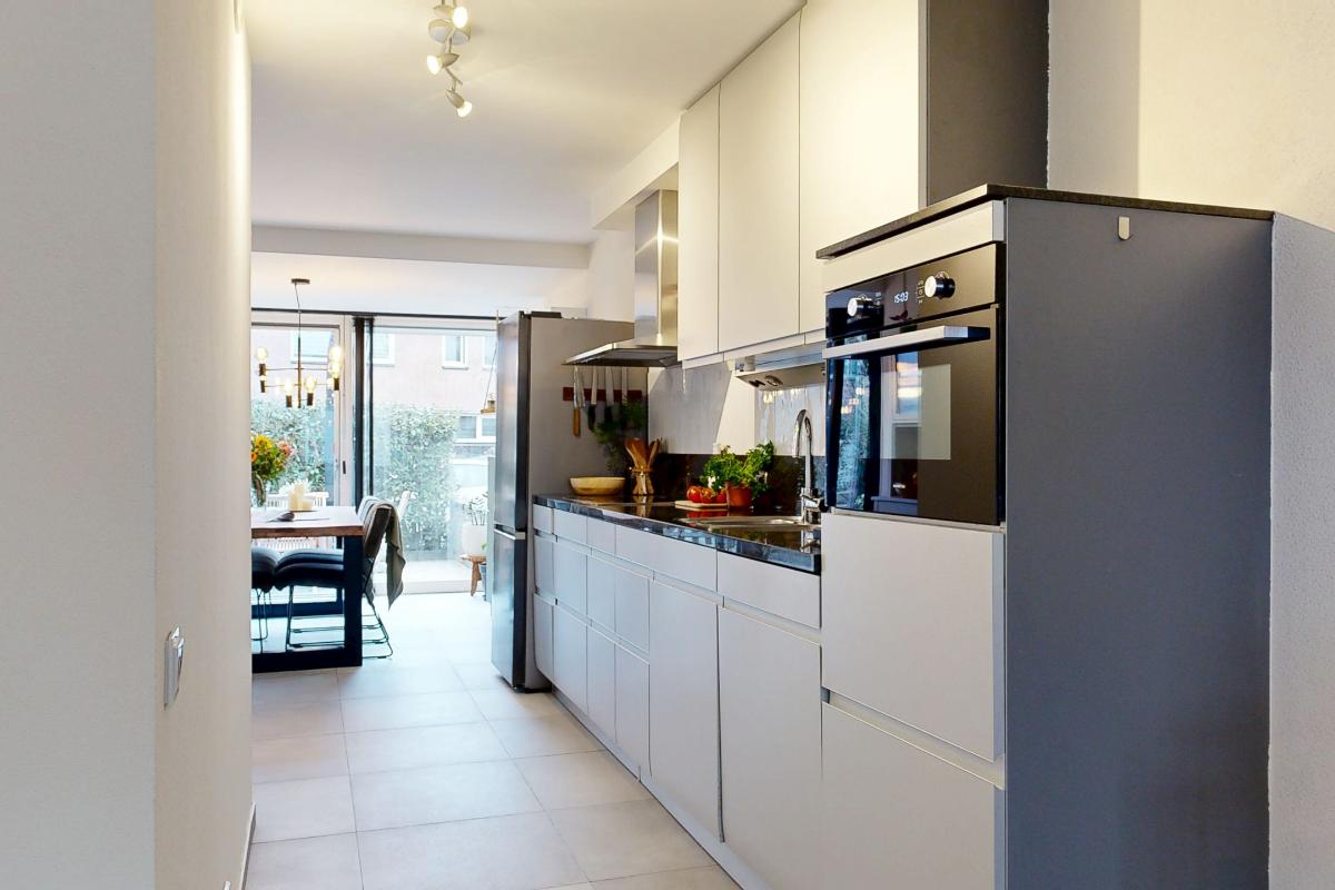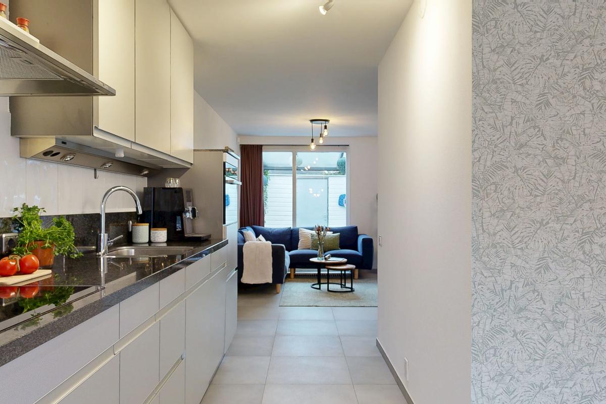 Aan de voorzijde bevindt zich de moderne, uitgebouwde woonkeuken, welke is voorzien van diverse inbouwapparatuur zoals een keramische 4-pits kookplaat, rvs afzuigkap, vaatwasser, combi-oven, vriezer en een natuurstenen werkblad. Via de schuifpui is er toegang tot de voortuin.