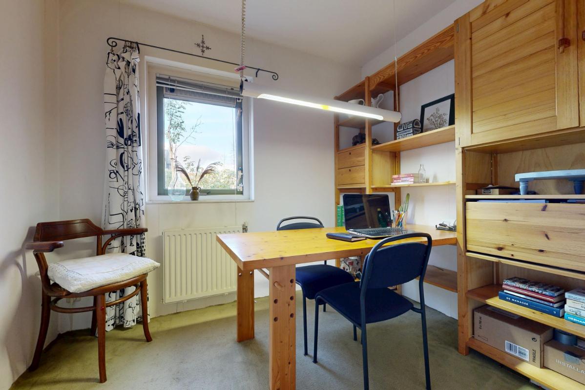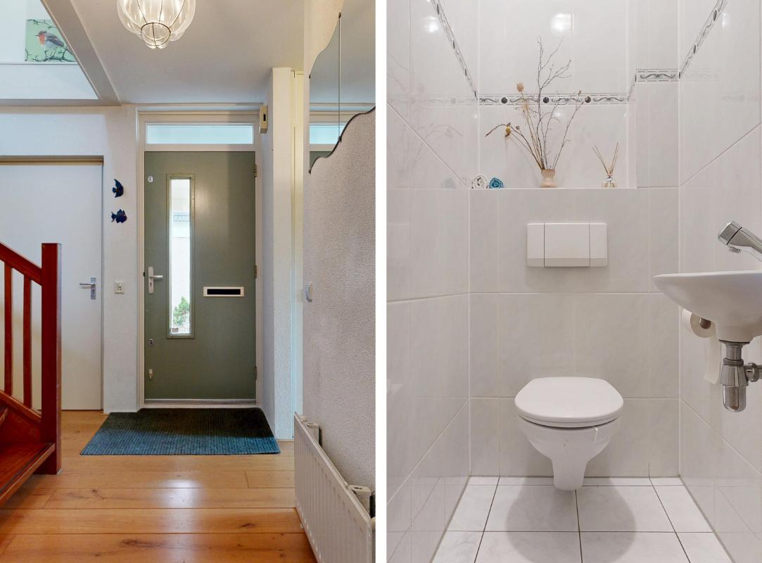 Bij binnenkomst via de ruime voortuin met parkeren op eigen terrein, stap je een royale entree binnen met garderobe en de trap naar de eerste verdieping. Links vind je een veelzijdige kamer die je naar eigen wens kunt inrichten – ideaal als werkkamer, speelruimte of extra slaapkamer. Een separaat toilet completeert deze praktische entree.