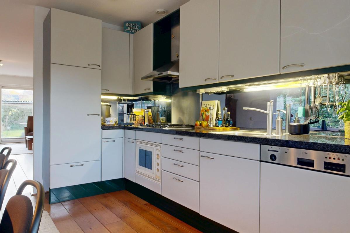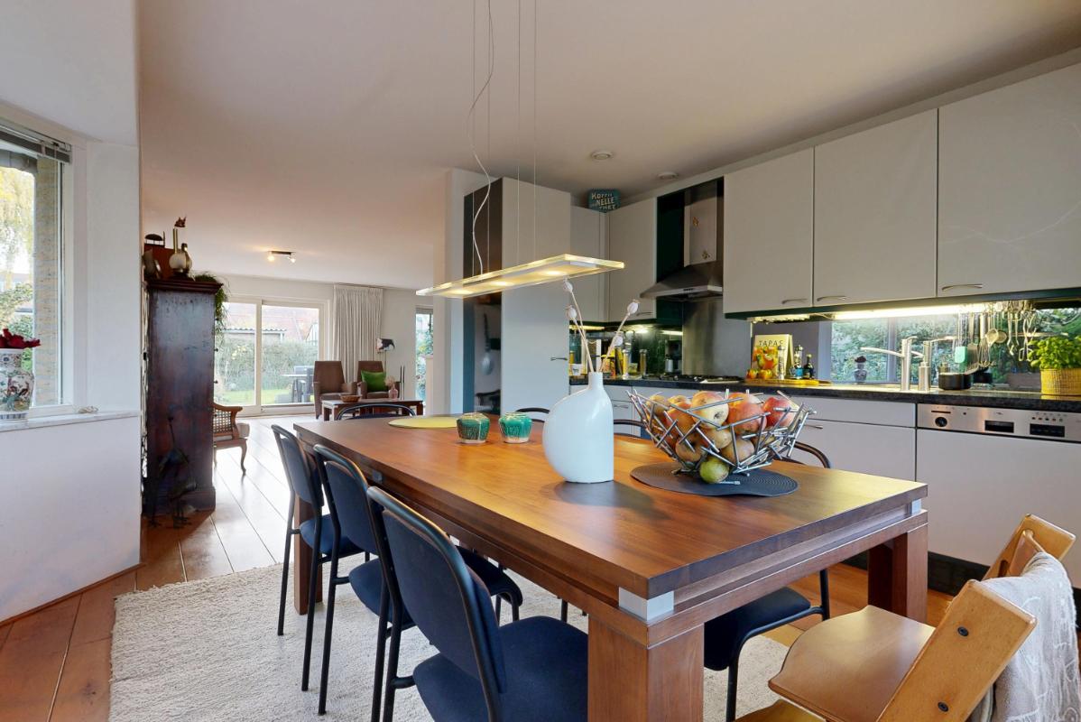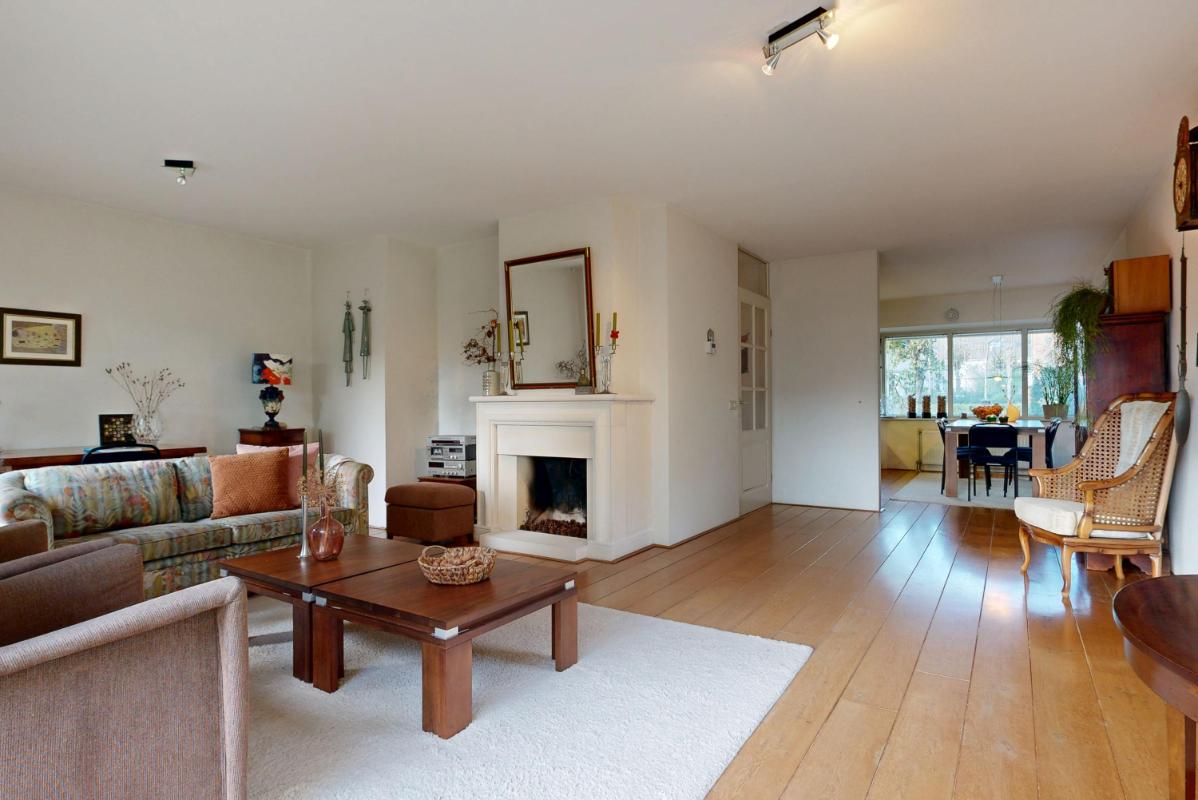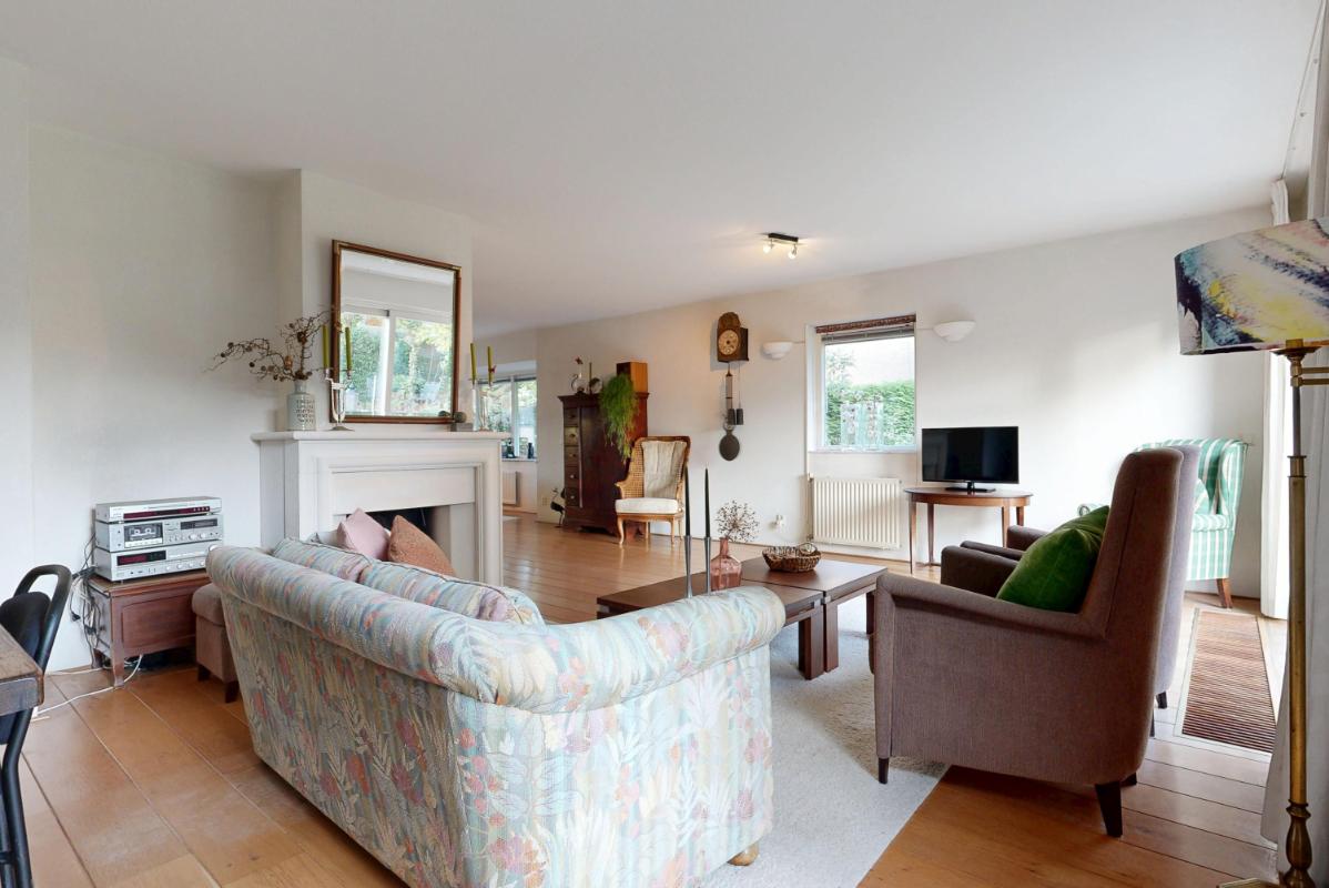 De woonkamer aan de achterzijde is ruim en sfeervol, met een open haard voor knusse avonden en een schuifpui die binnen naadloos verbindt met de tuin. Hier creëer je eenvoudig een gezellige zithoek, mede dankzij de grote raampartijen die veel licht binnenlaten. Aan de voorzijde ligt de half open keuken met inbouwapparatuur, grote ramen rondom en plek voor een ruime eettafel – een lichte, uitnodigende plek om te koken en te eten.