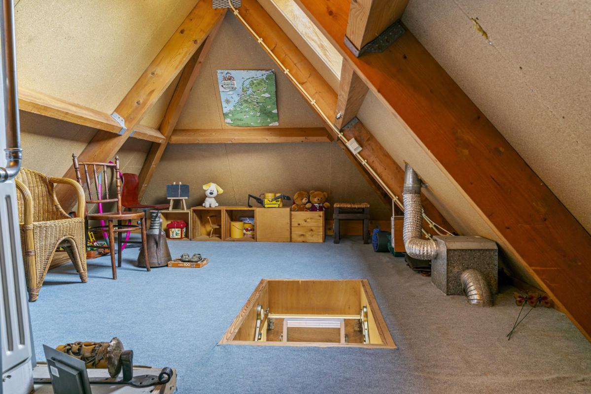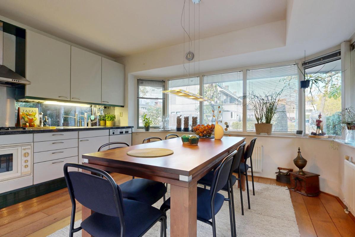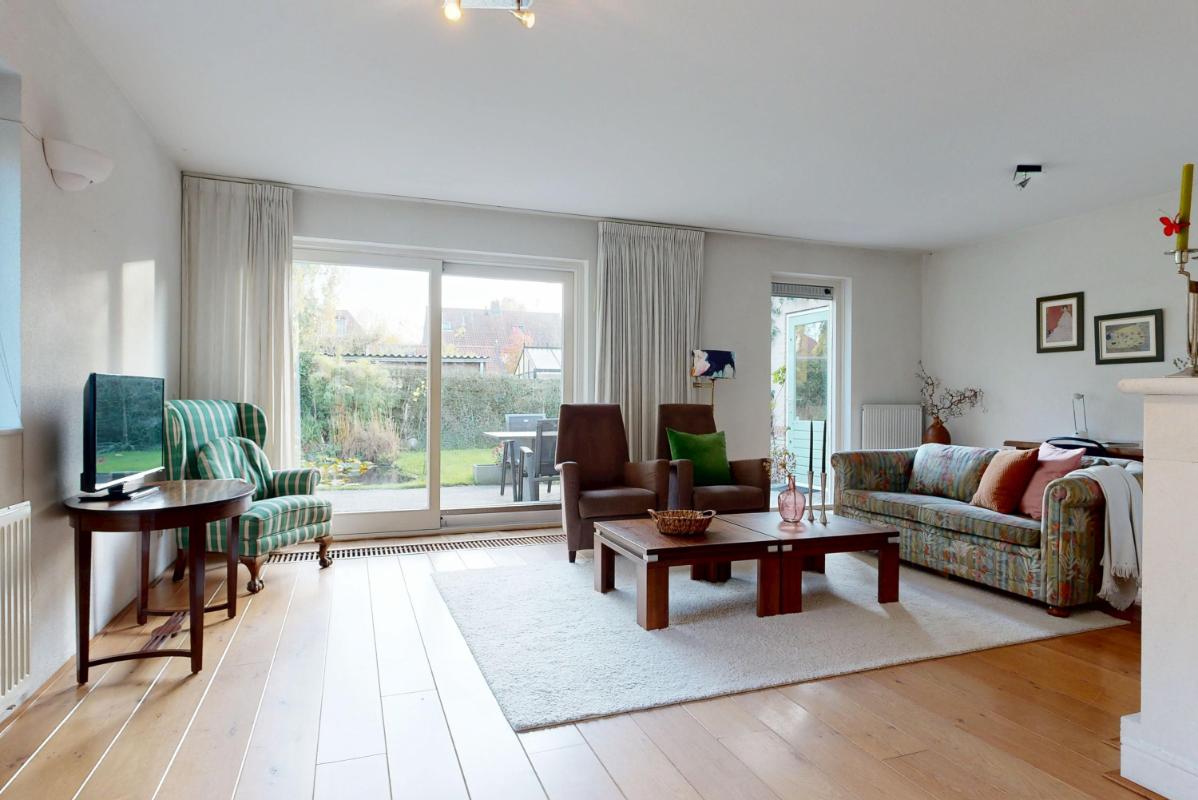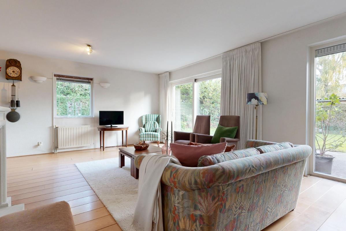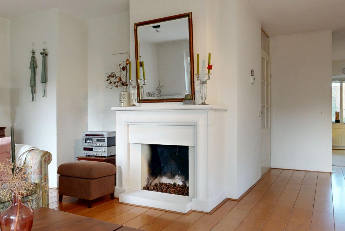 De woonkamer aan de achterzijde is ruim en sfeervol, met een open haard voor knusse avonden en een schuifpui die binnen naadloos verbindt met de tuin. Hier creëer je eenvoudig een gezellige zithoek, mede dankzij de grote raampartijen die veel licht binnenlaten. Aan de voorzijde ligt de half open keuken met inbouwapparatuur, grote ramen rondom en plek voor een ruime eettafel – een lichte, uitnodigende plek om te koken en te eten.