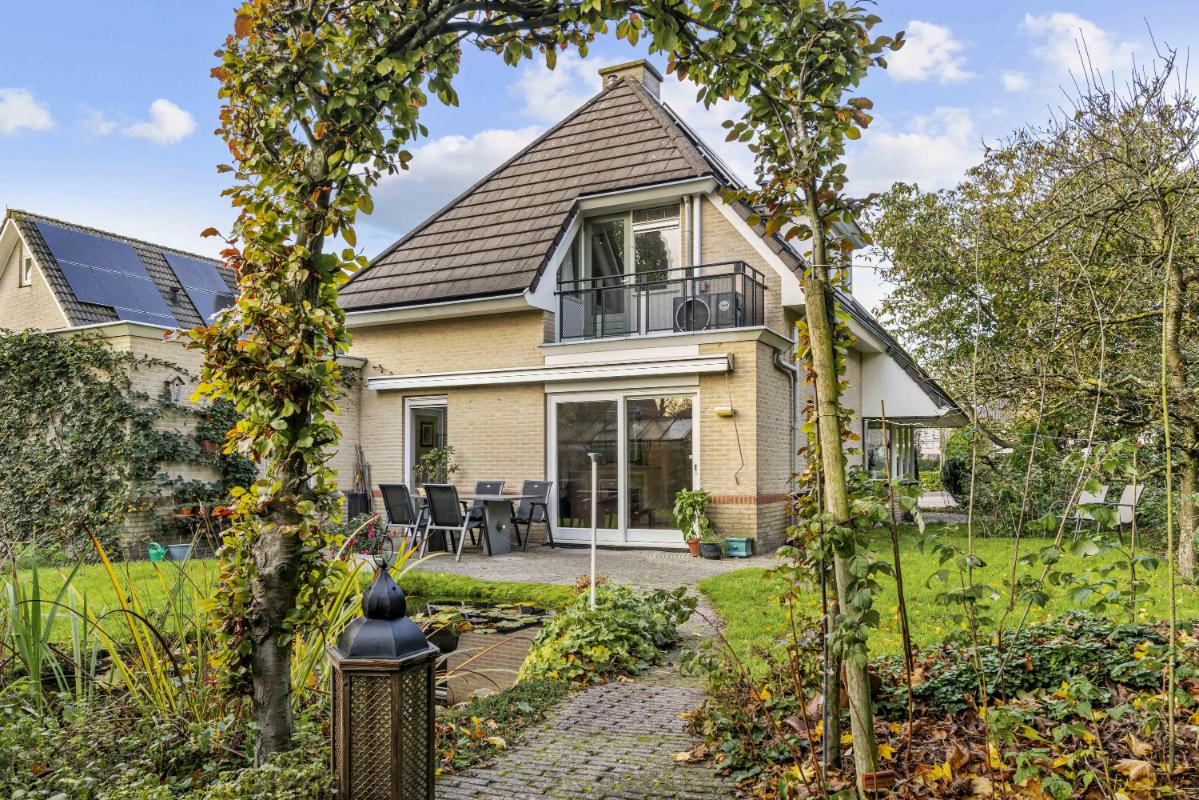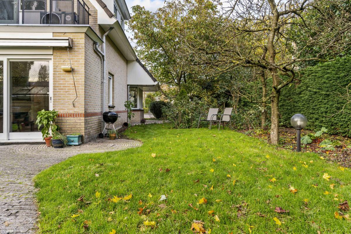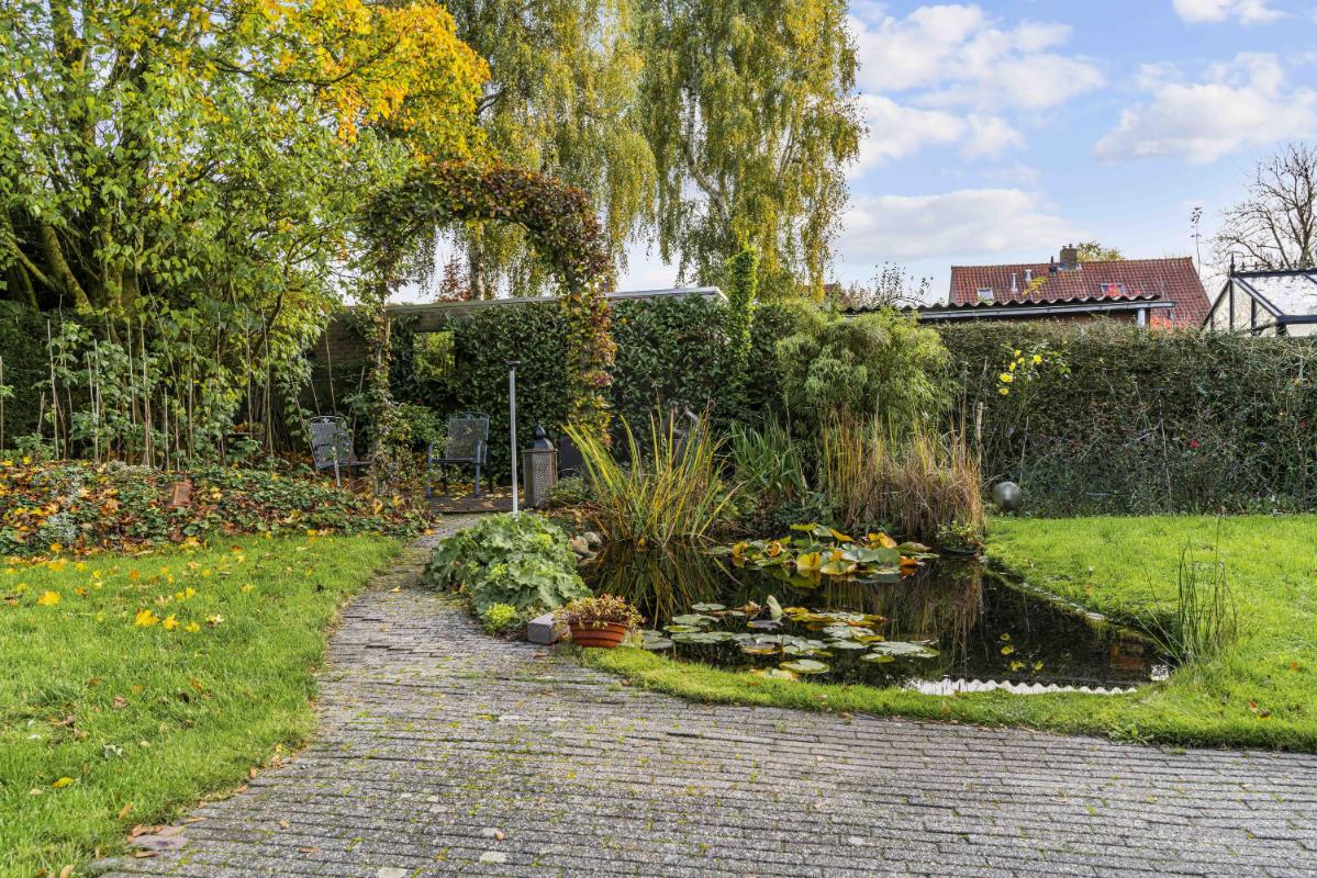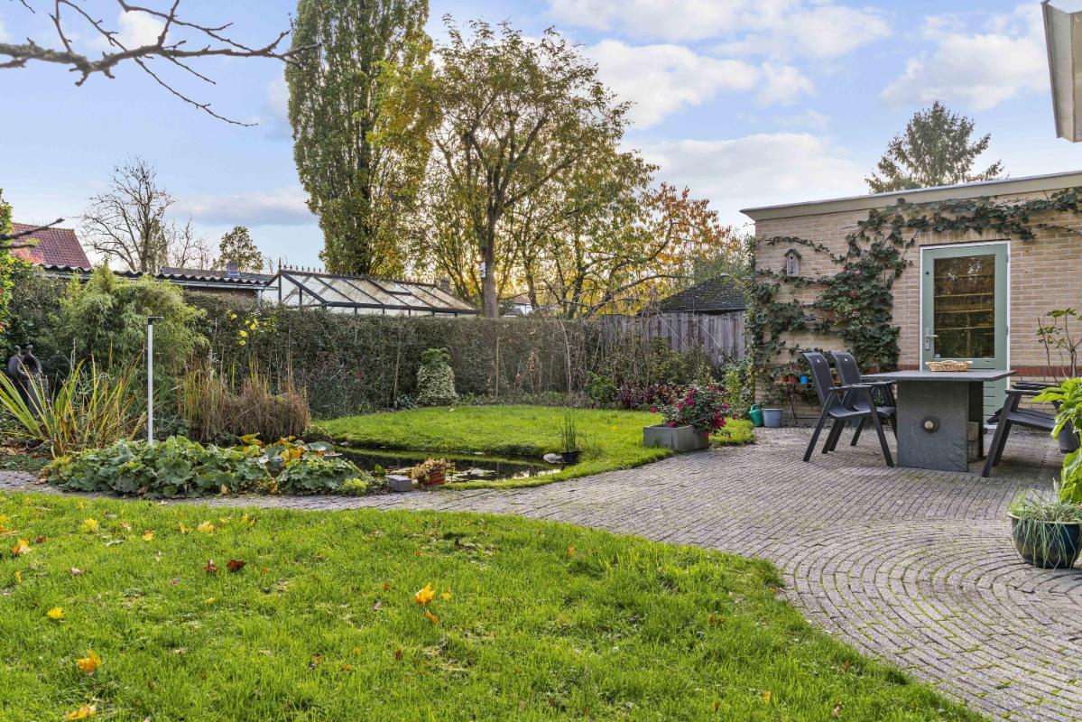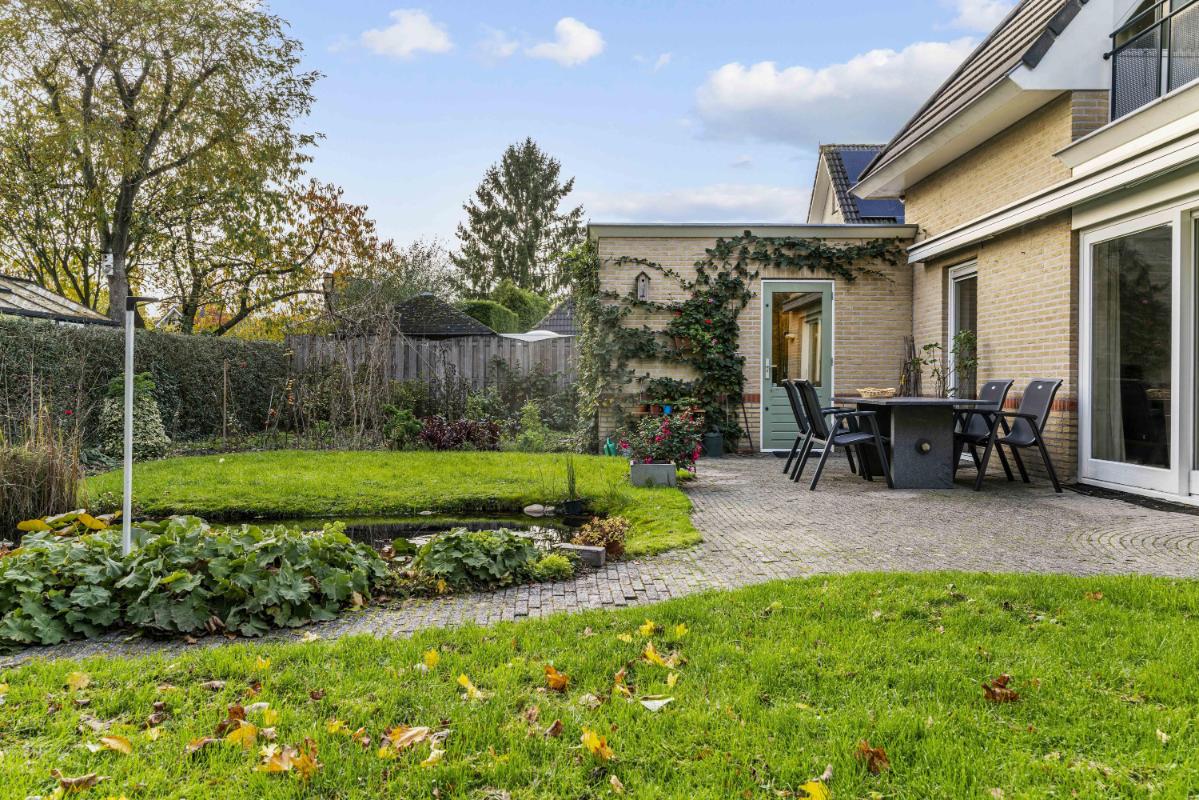 De woning beschikt over een royale tuin rondom. De achtertuin, bereikbaar via de schuifpui of via de zijkant van de woning, ligt pal op het zuiden, is zonnig en biedt veel privacy dankzij het volwassen groen. Met een vijver, meerdere terrassen en een zonnescherm aan de achterzijde is dit een heerlijke buitenruimte. Tevens beschikt deze woning over een zeer ruime garage met aansluitingen voor de wasmachine en droger, en geeft deze directe toegang tot de tuin – perfect voor opslag en gemak.
