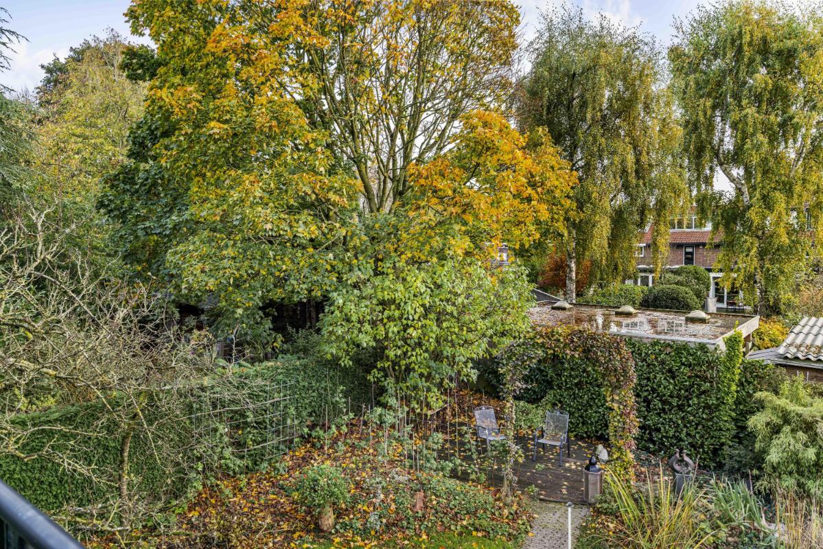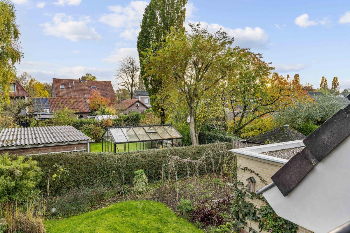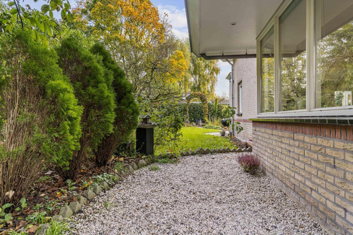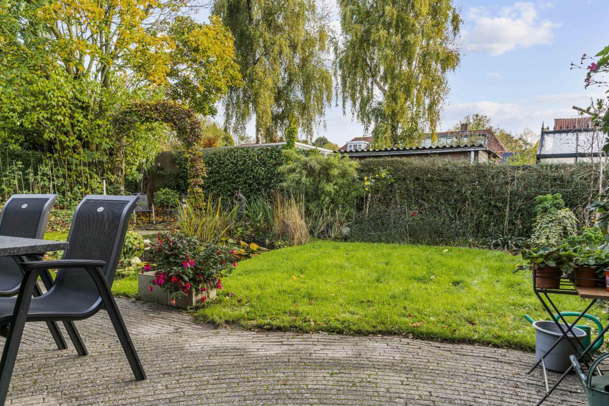 De woning beschikt over een royale tuin rondom. De achtertuin, bereikbaar via de schuifpui of via de zijkant van de woning, ligt pal op het zuiden, is zonnig en biedt veel privacy dankzij het volwassen groen. Met een vijver, meerdere terrassen en een zonnescherm aan de achterzijde is dit een heerlijke buitenruimte. Tevens beschikt deze woning over een zeer ruime garage met aansluitingen voor de wasmachine en droger, en geeft deze directe toegang tot de tuin – perfect voor opslag en gemak.