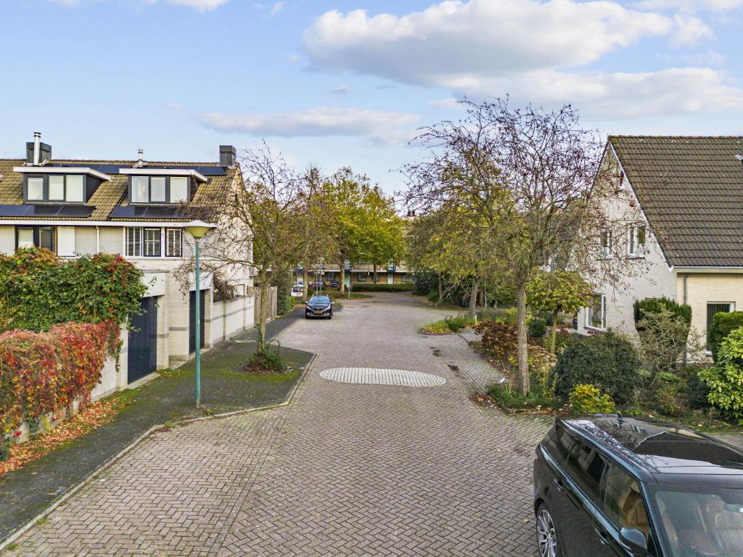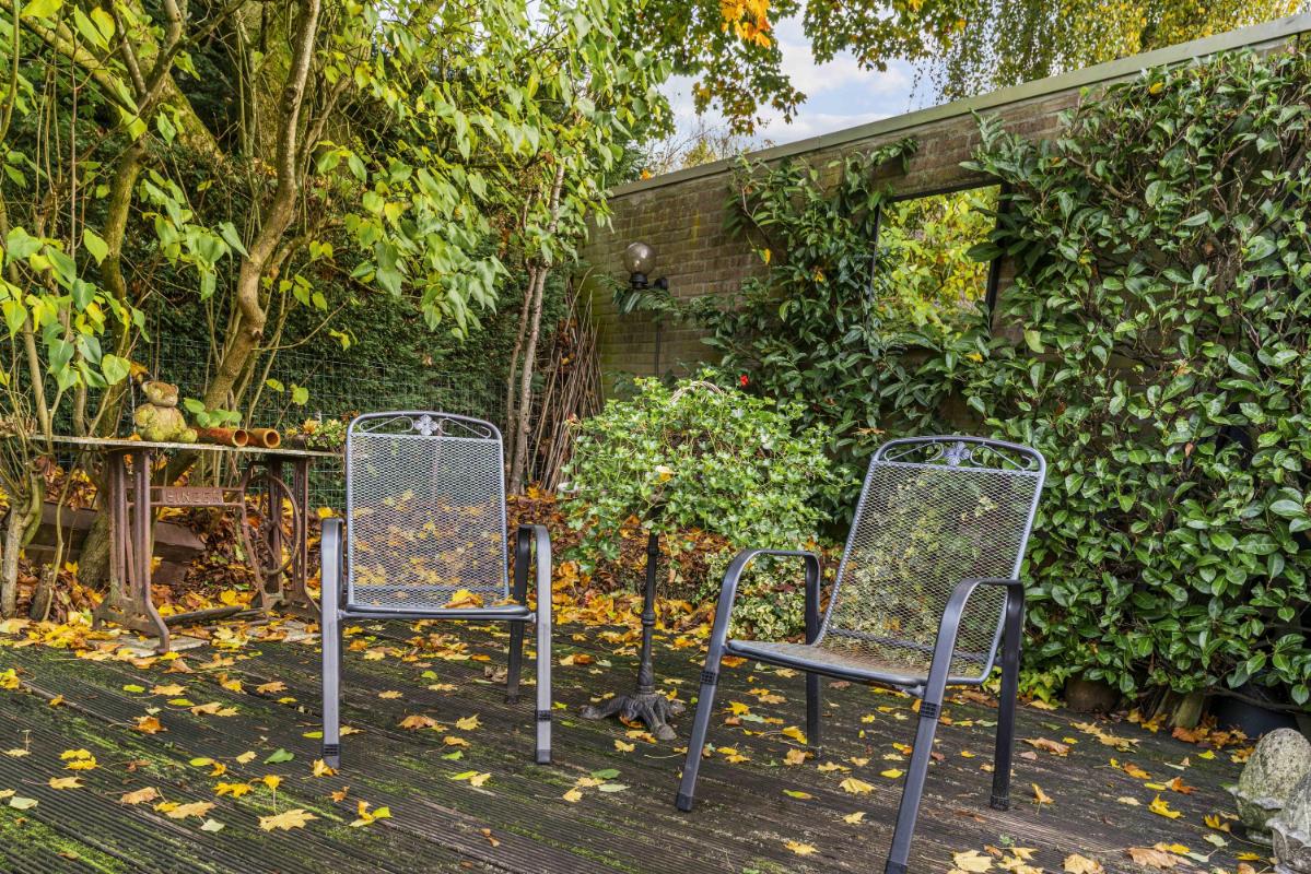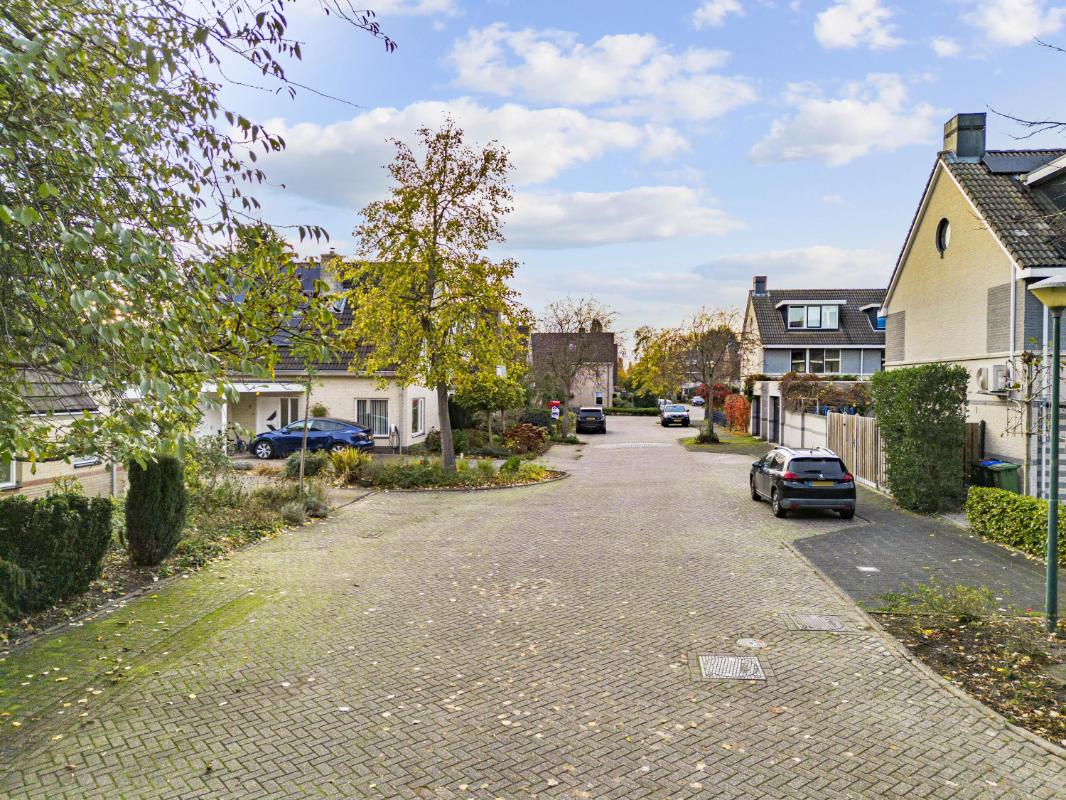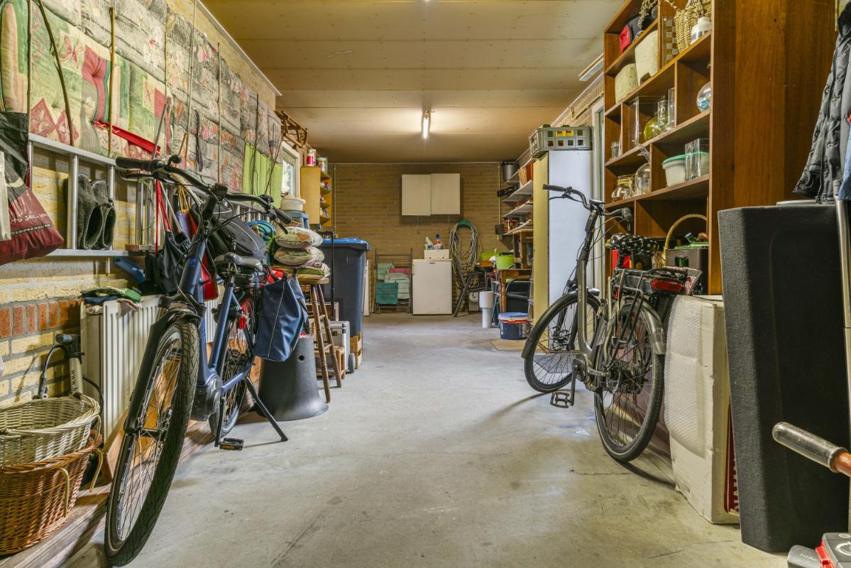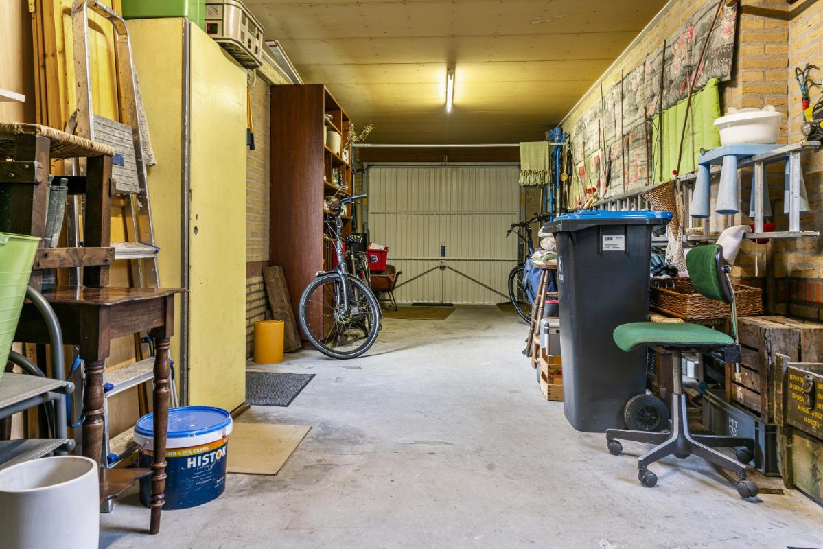 De woning beschikt over een royale tuin rondom. De achtertuin, bereikbaar via de schuifpui of via de zijkant van de woning, ligt pal op het zuiden, is zonnig en biedt veel privacy dankzij het volwassen groen. Met een vijver, meerdere terrassen en een zonnescherm aan de achterzijde is dit een heerlijke buitenruimte. Tevens beschikt deze woning over een zeer ruime garage met aansluitingen voor de wasmachine en droger, en geeft deze directe toegang tot de tuin – perfect voor opslag en gemak.