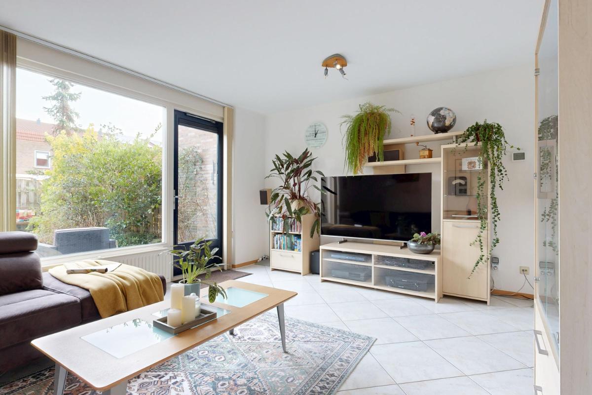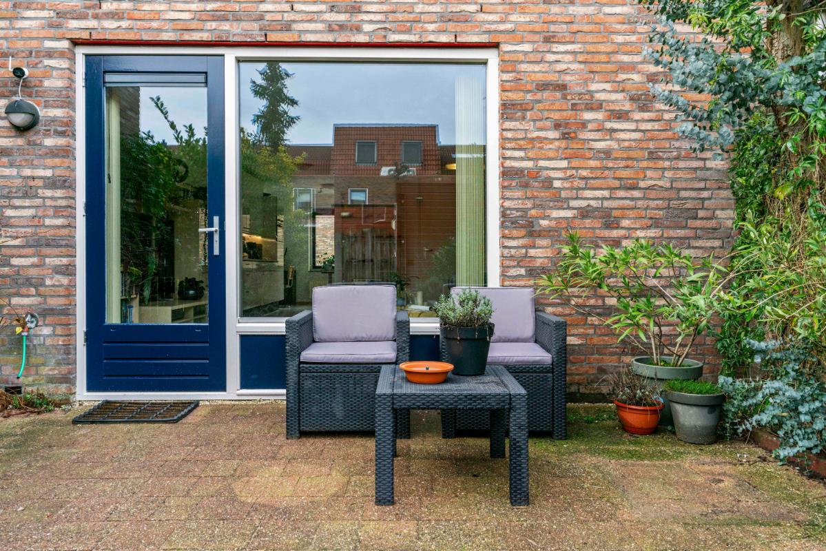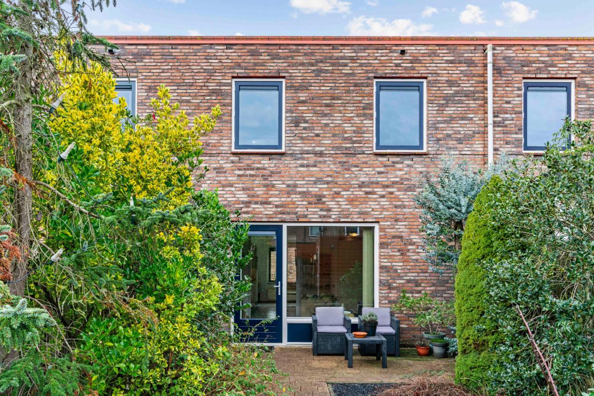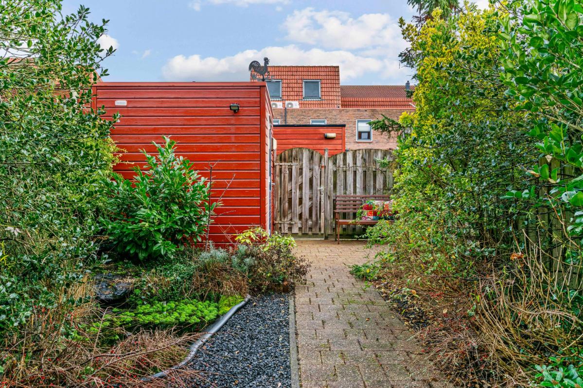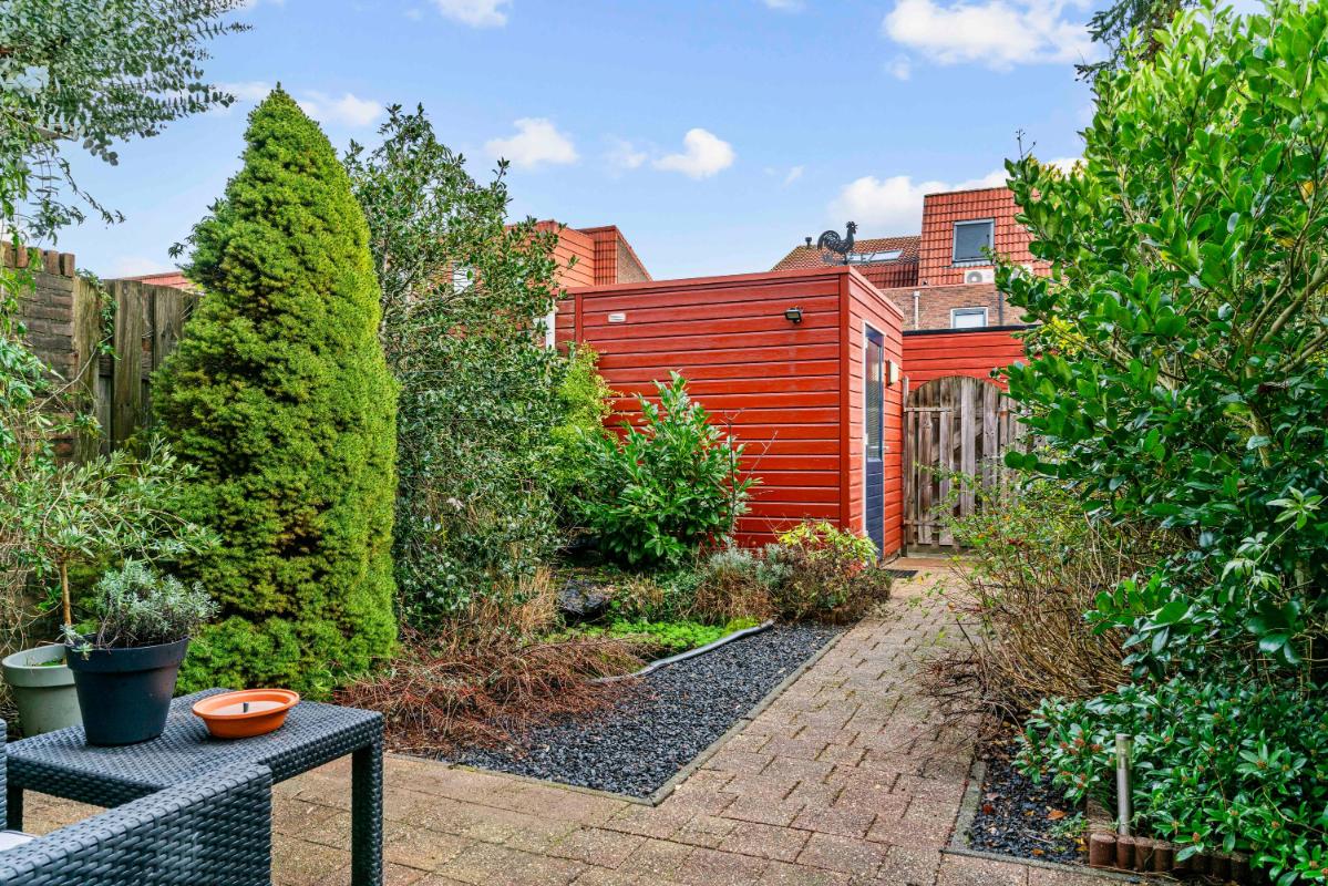 Vanuit de woonkamer stap je de achtertuin in: zonnig, netjes onderhouden en omgeven door veel groen. Er is een gezellig vijvertje, ruimte voor een fijne zithoek en een houten berging achterin met elektra. Via de achterom bereik je makkelijk de straat.