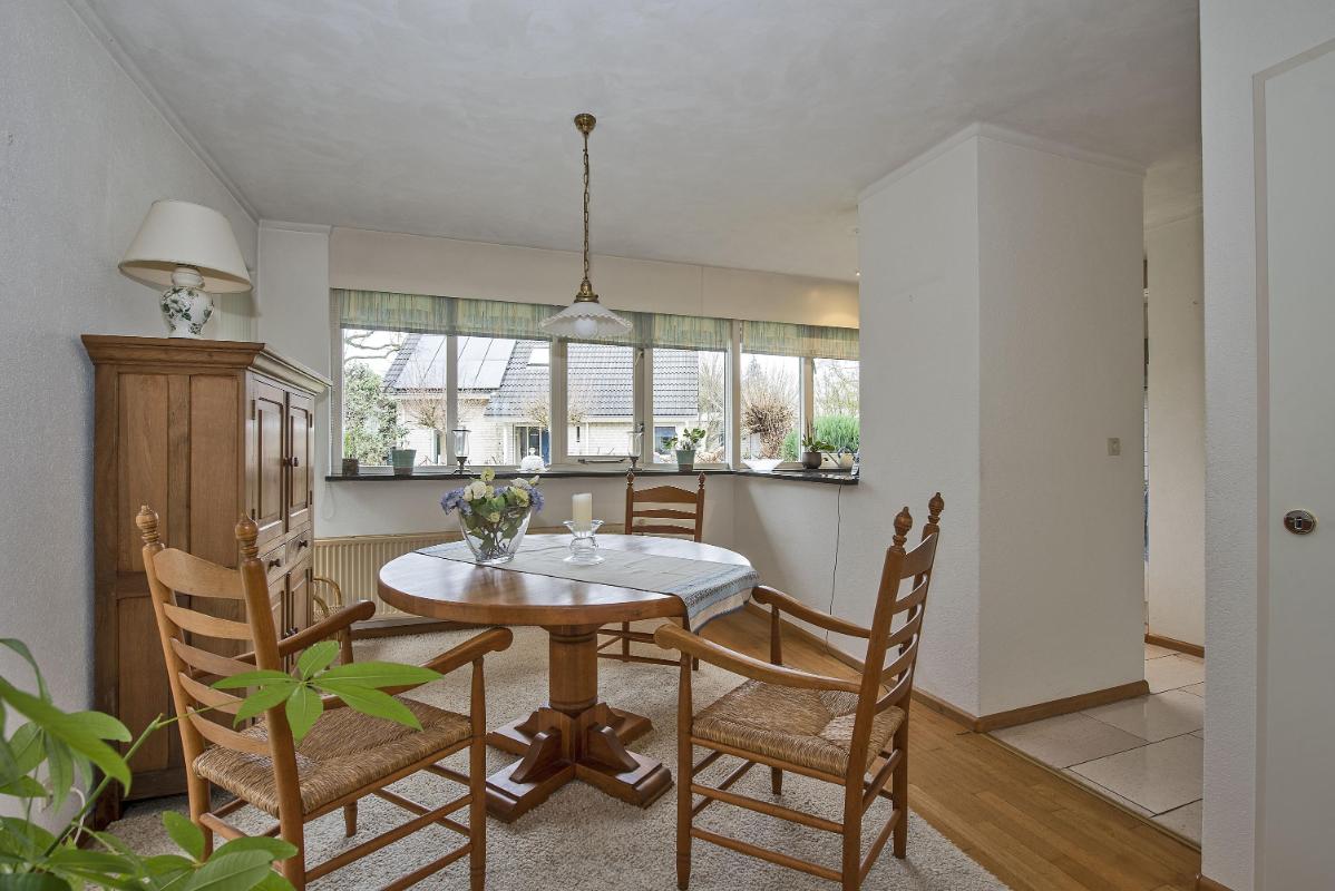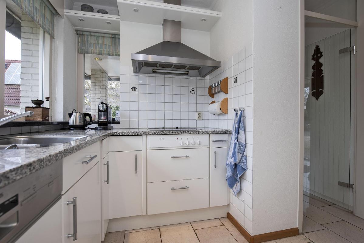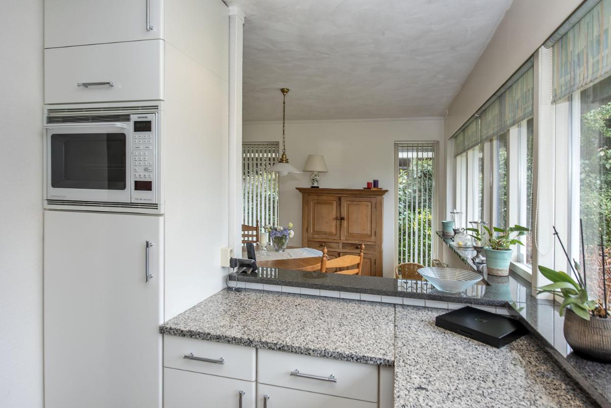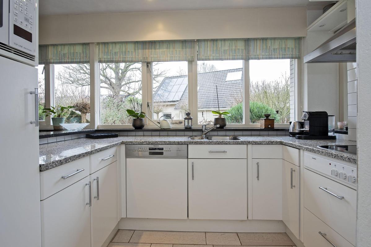 Een fijne leefruimte waar je met gemak een royale zithoek én eethoek creëert. Aan de voorzijde van de woning bevindt zich de keuken. Deze is voorzien van een fornuis (elektrisch koken), afzuigkap, combi oven, koelkast en vaatwasser. Functioneel ingericht en klaar voor dagelijks gebruik. Verder in de doorgang van de keuken naar de hal vind je een praktische inbouwkast. Een ideale ruimte voor levensmiddelenvoorraad en/of extra bergruimte.