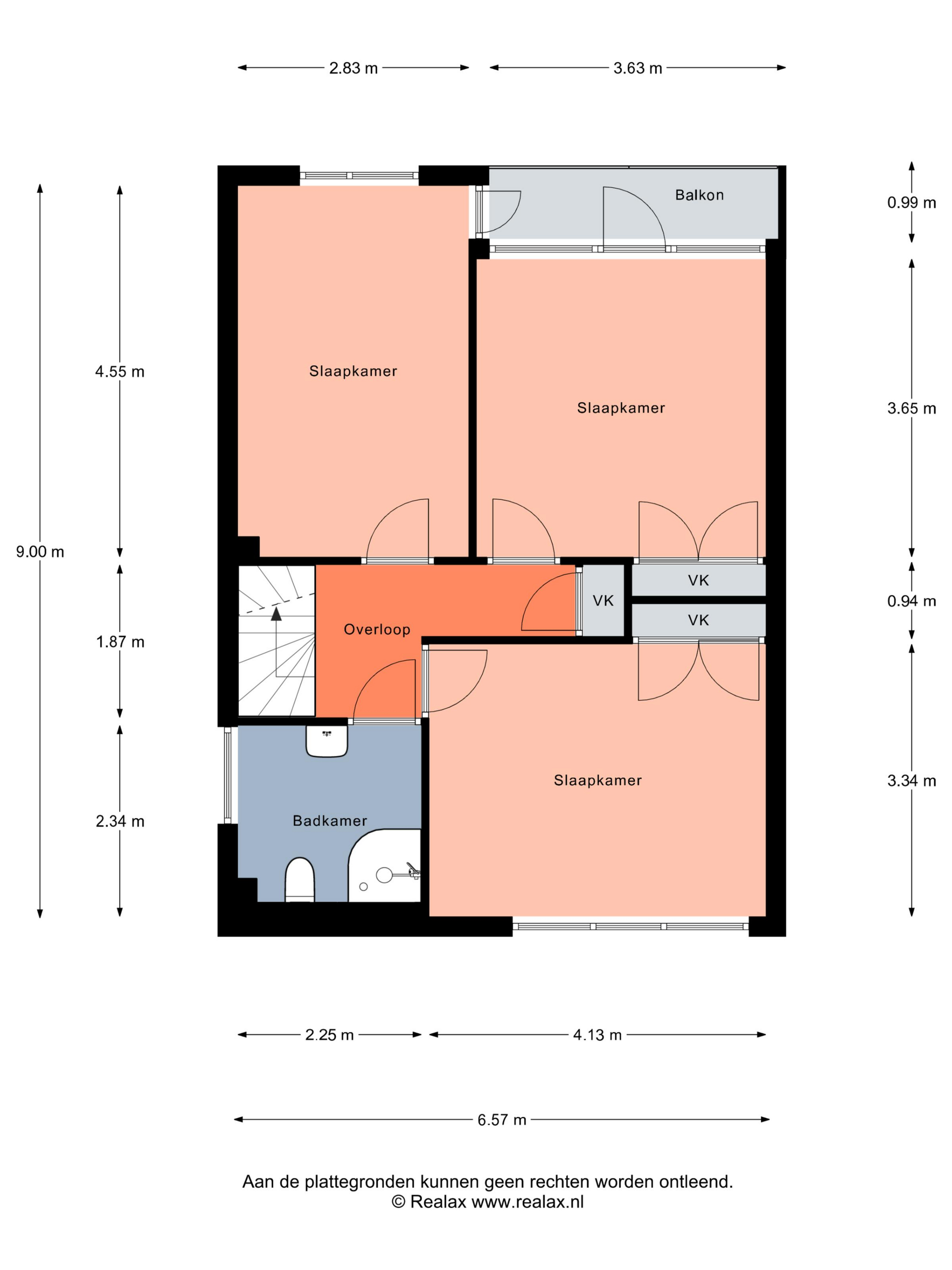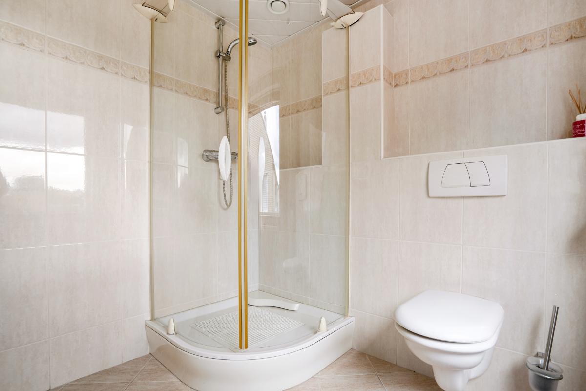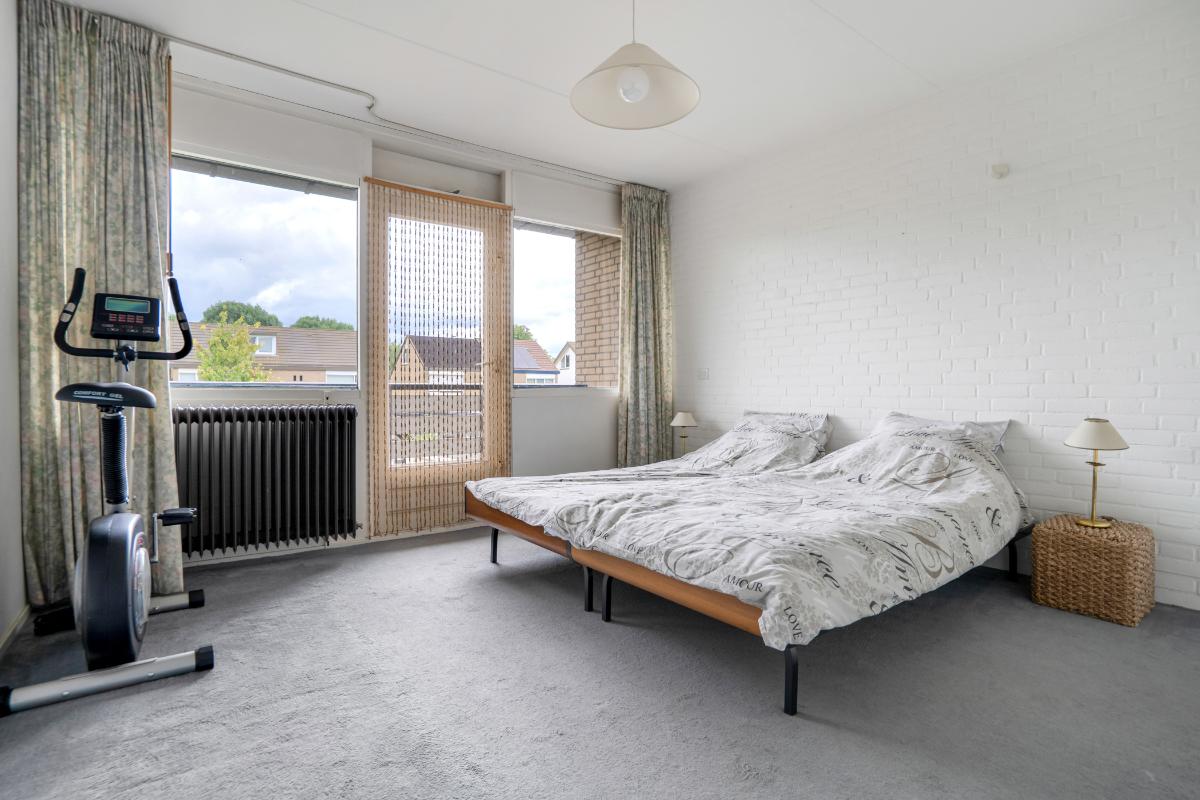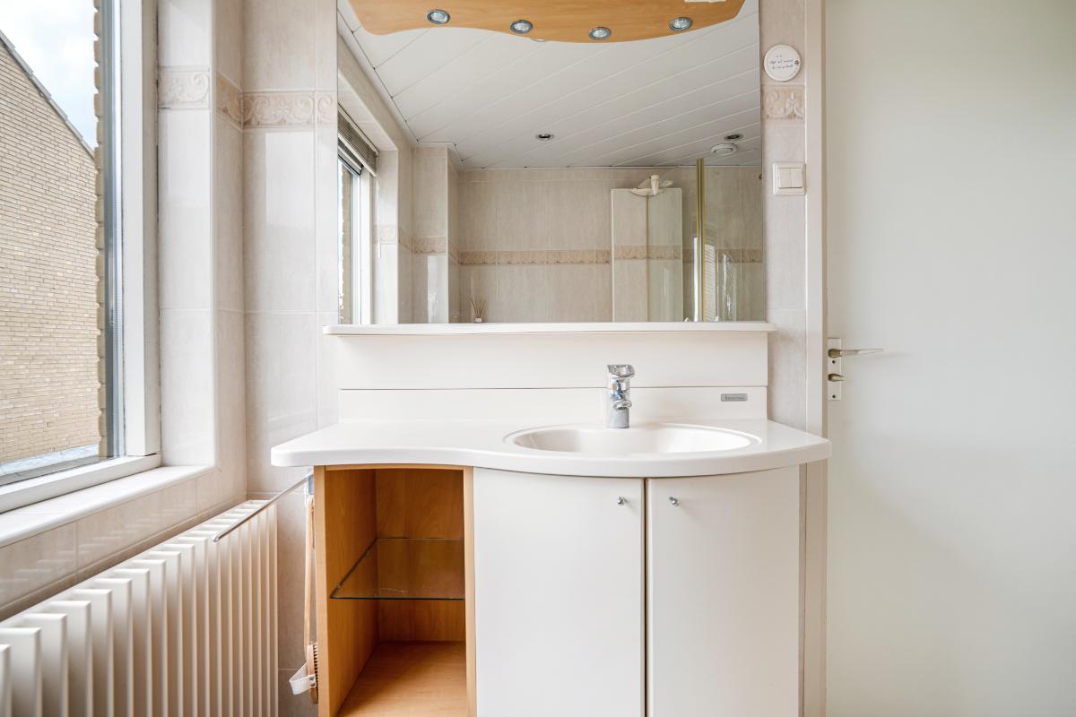Eerste verdieping: overloop met vaste kast, drie slaapkamers waarvan twee met toegang tot balkon en twee voorzien van een vaste kast, tot slot een badkamer met douche, wastafel en toilet.
