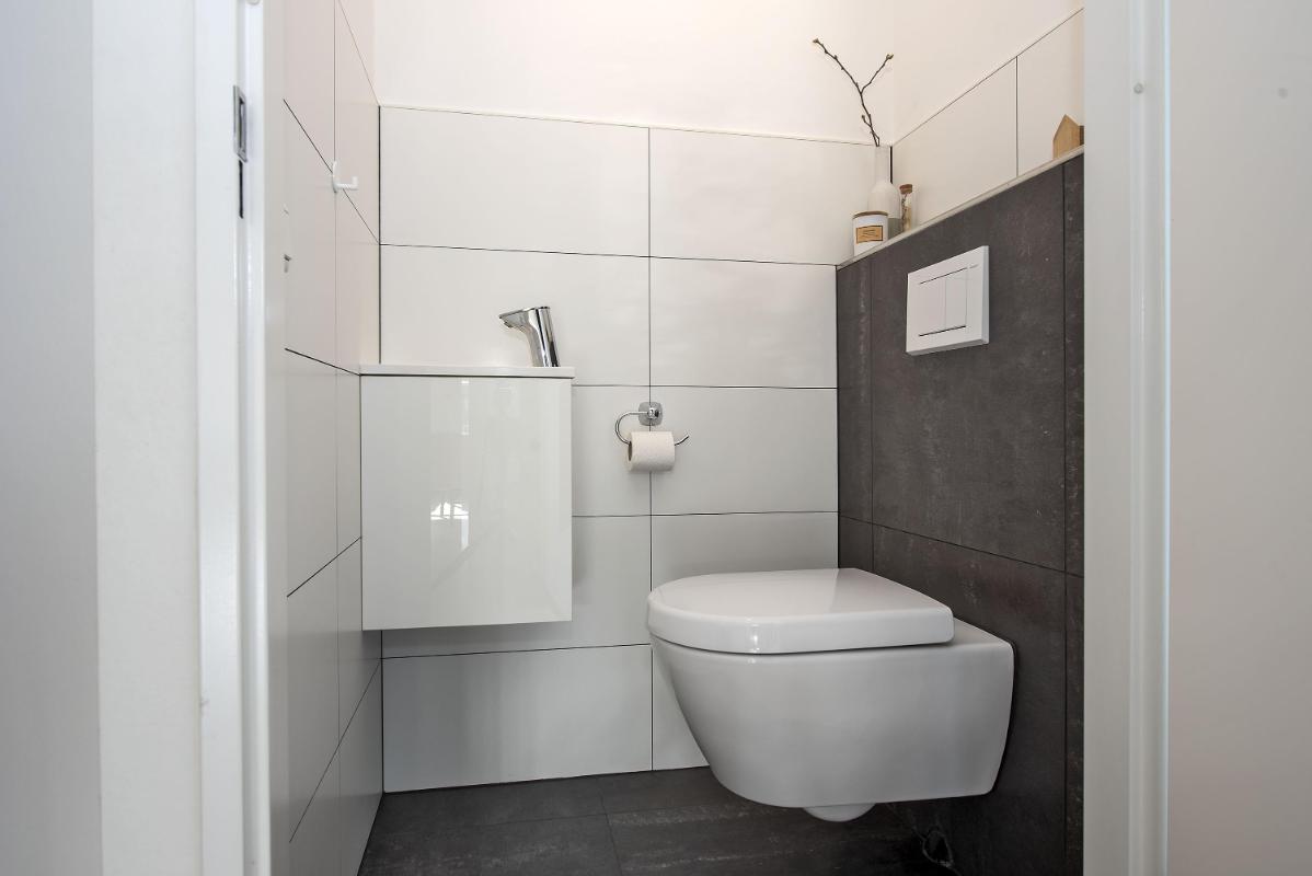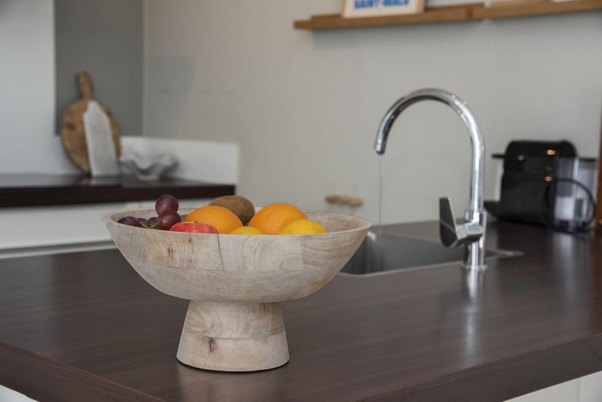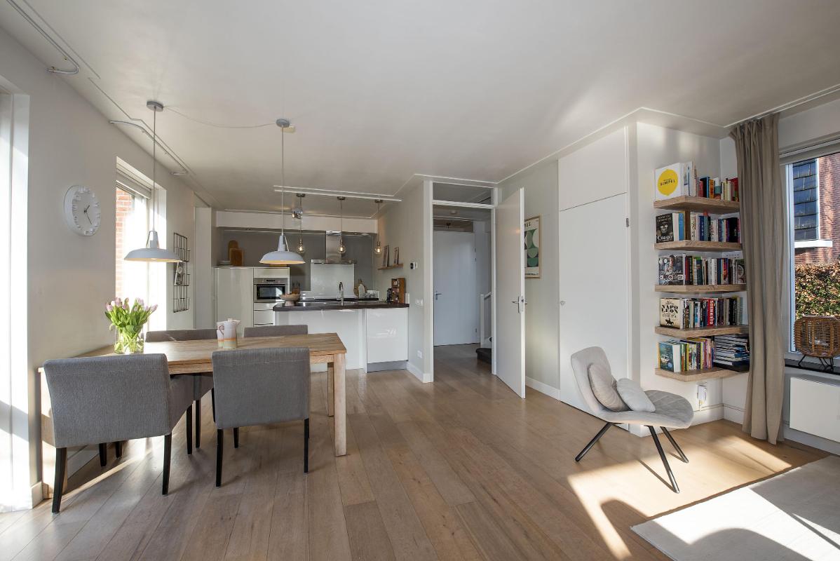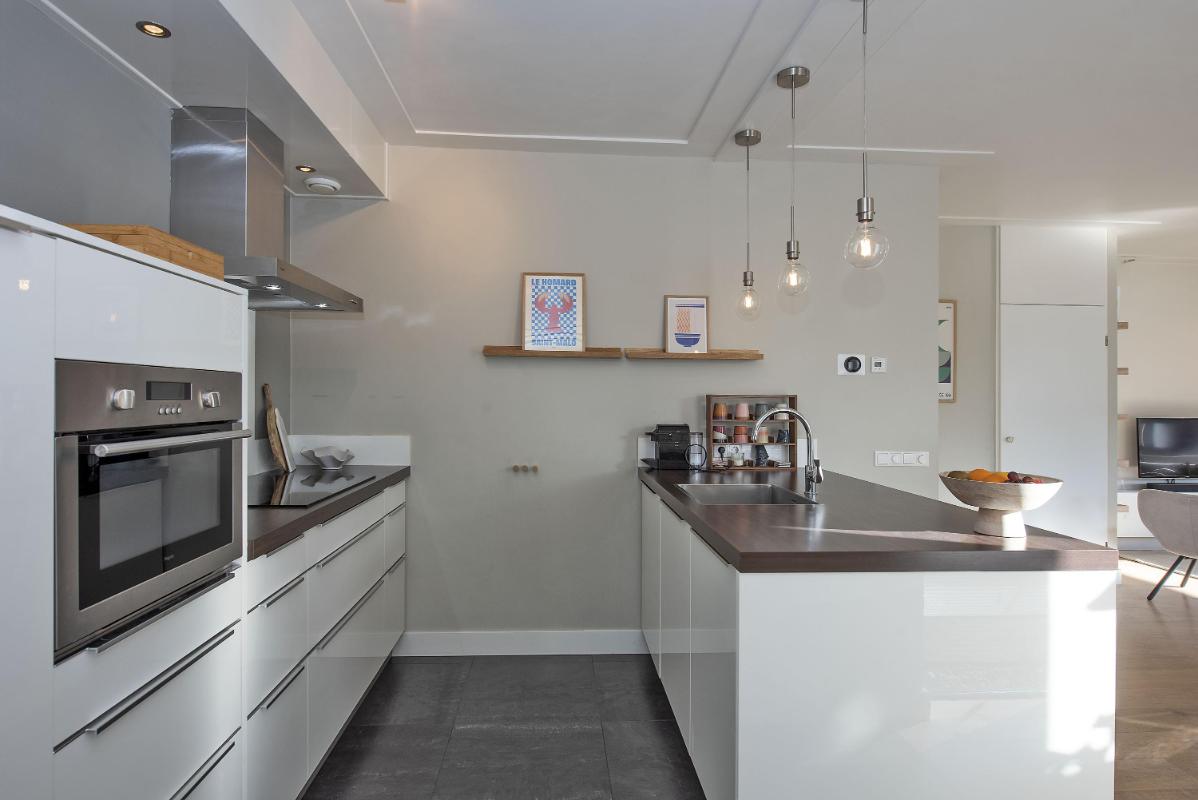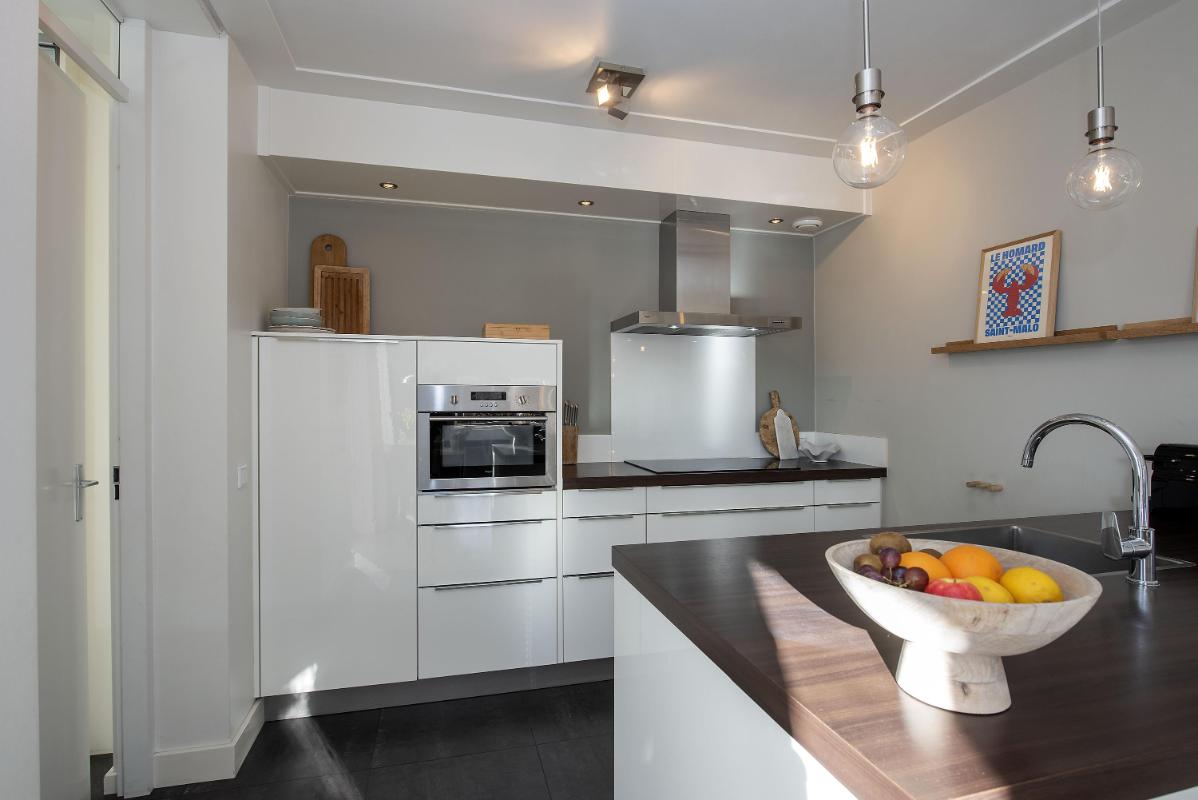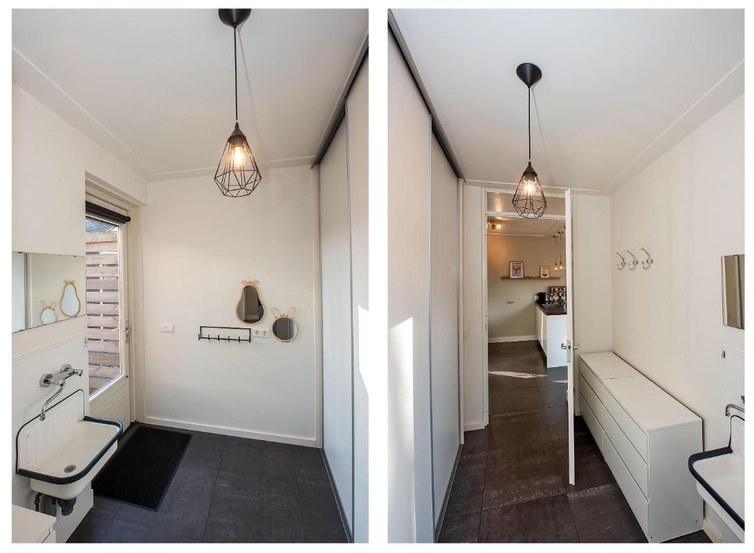 De open keuken sluit prettig aan op de woonkamer en is praktisch ingericht met diverse inbouwapparatuur, waaronder een inductiekookplaat, afzuigkap, combi-oven, koelkast en vaatwasser. Alles wat je nodig hebt overzichtelijk en binnen handbereik. Vanuit de keuken loop je de bijkeuken in, met gootsteen en ruime inbouwkast voor veel bergruimte. Vanuit hier heb je direct toegang tot de tuin en de oprit.