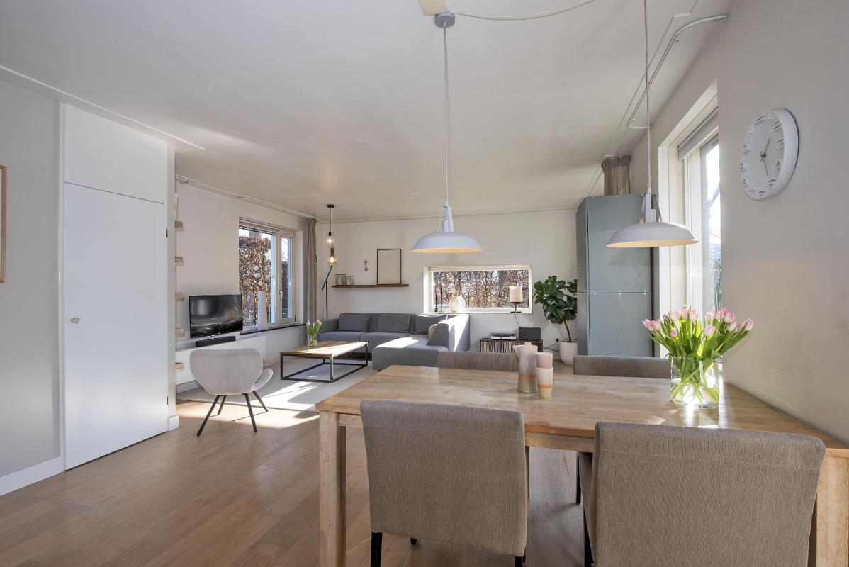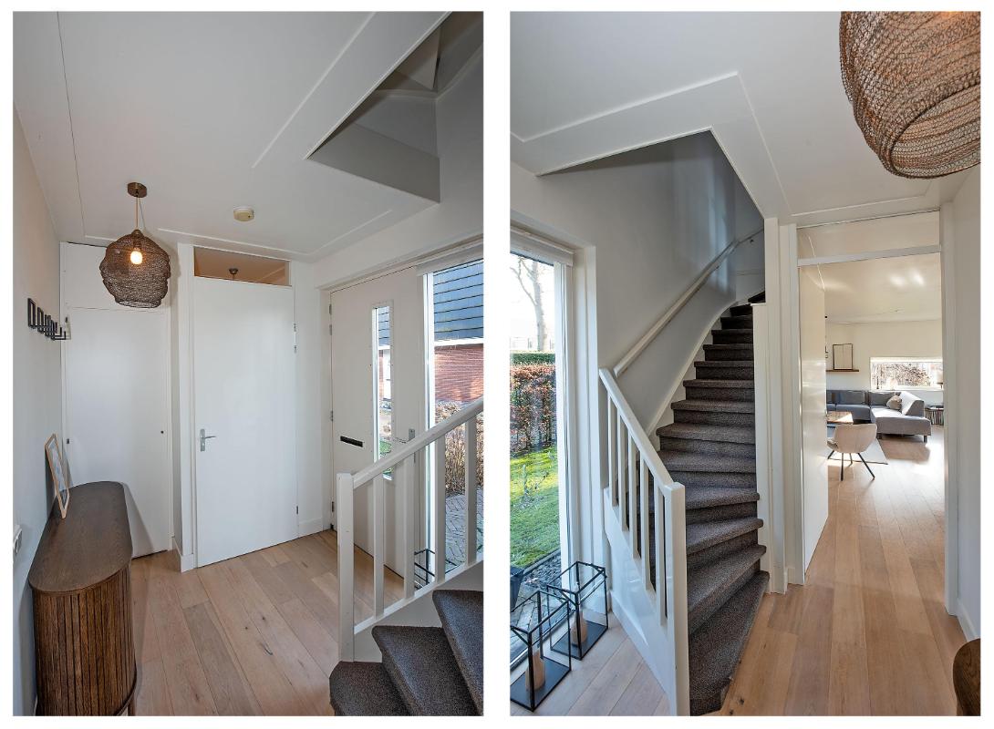 Comfortabel wonen met een logische indeling Je komt binnen in de hal met toilet, meterkast en trapopgang. Vanuit hier loop je de woonkamer binnen: een fijne, lichte leefruimte met grote raampartijen, die zorgen voor een ruime en open sfeer. Er is volop ruimte voor een comfortabele zithoek én een royale eettafel, waardoor dit een plek is waar je graag samenkomt, ontspant en geniet. In de trapkast is veel opbergruimte.