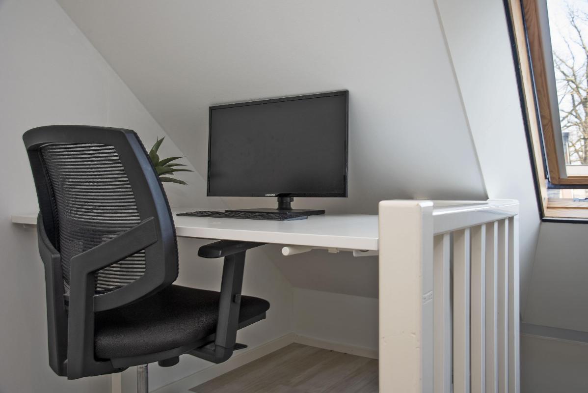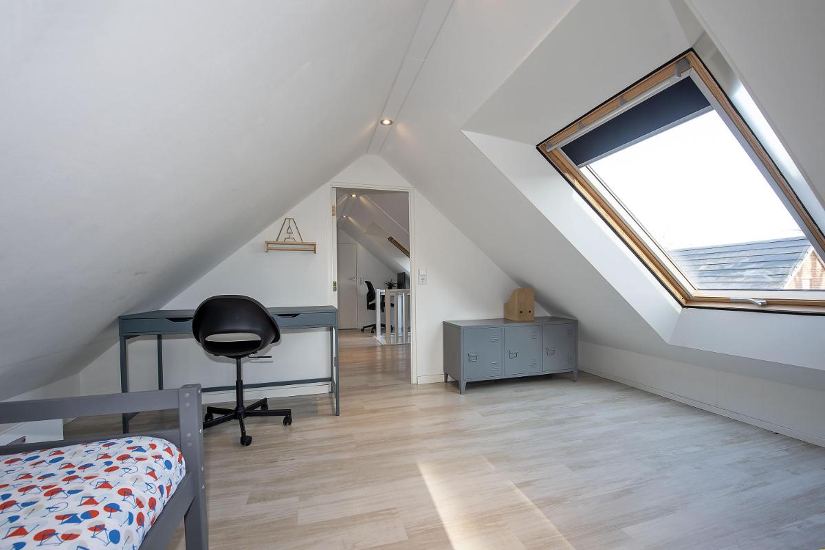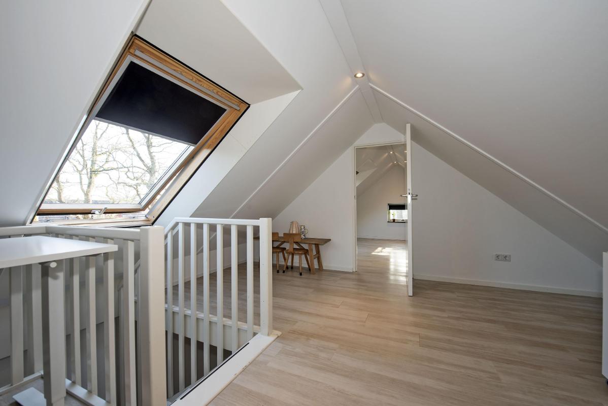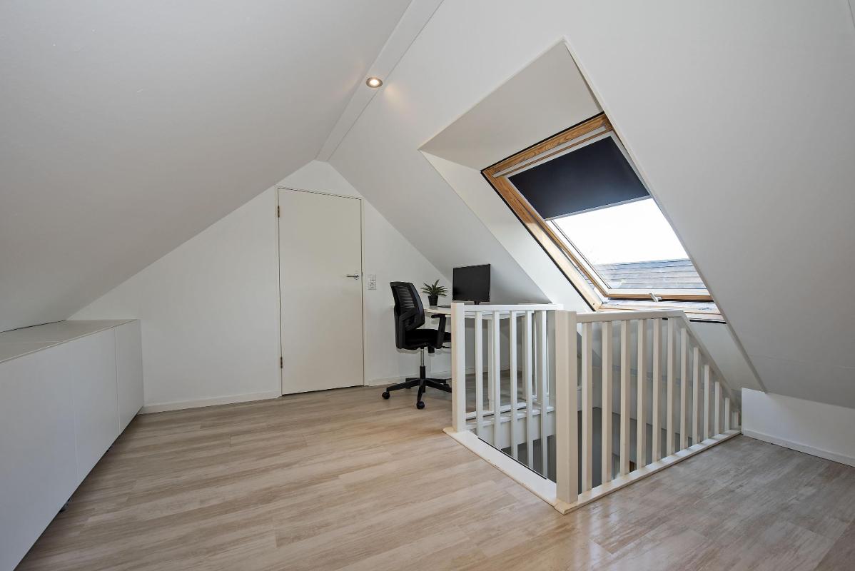Via een vaste trap bereik je de tweede verdieping. Deze verdieping biedt een extra slaapkamer, een werkruimte en aparte praktische bergruimte. Ideaal als logeerkamer en als thuiswerkplek of hobbyruimte.
