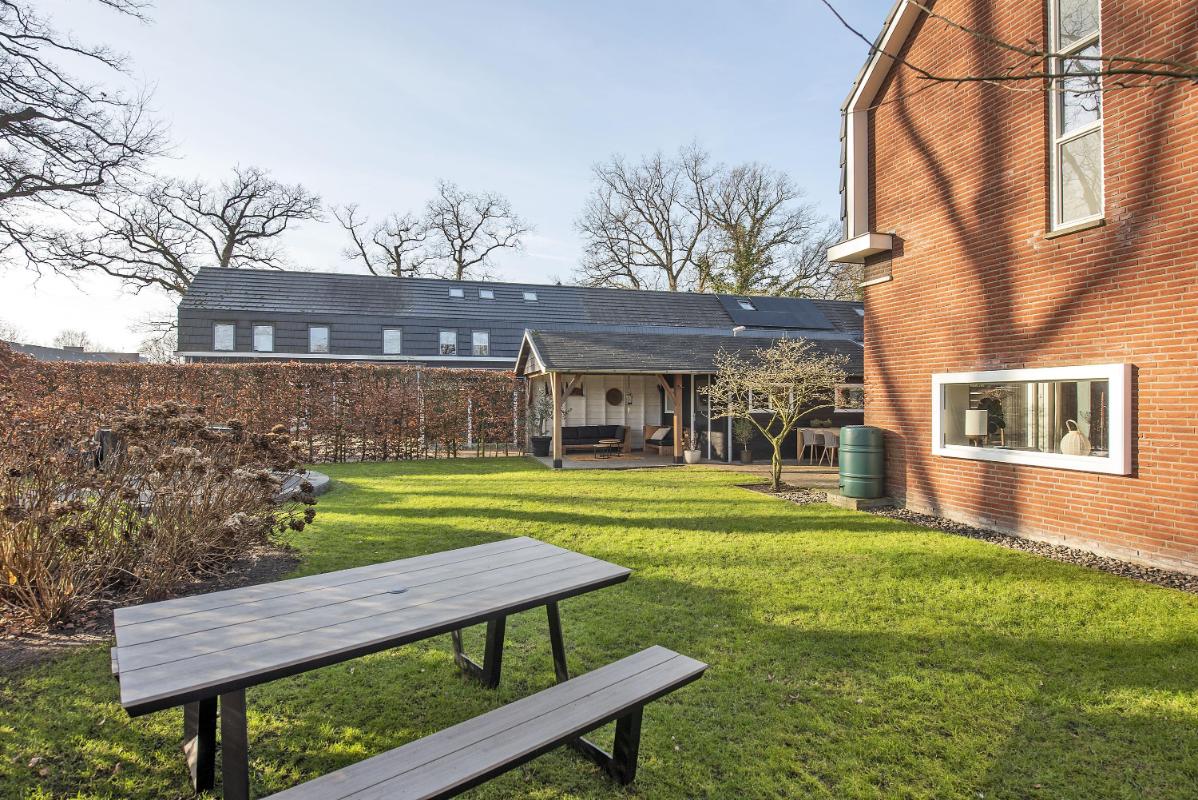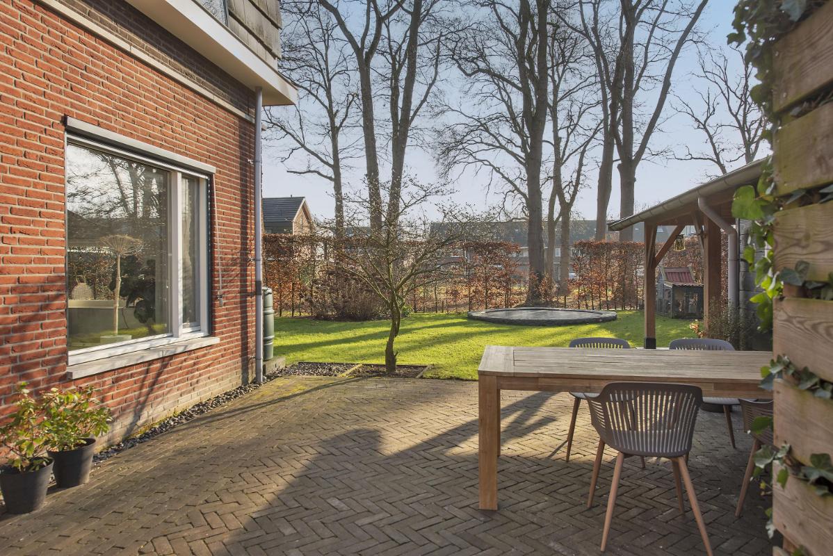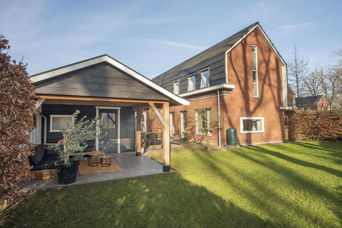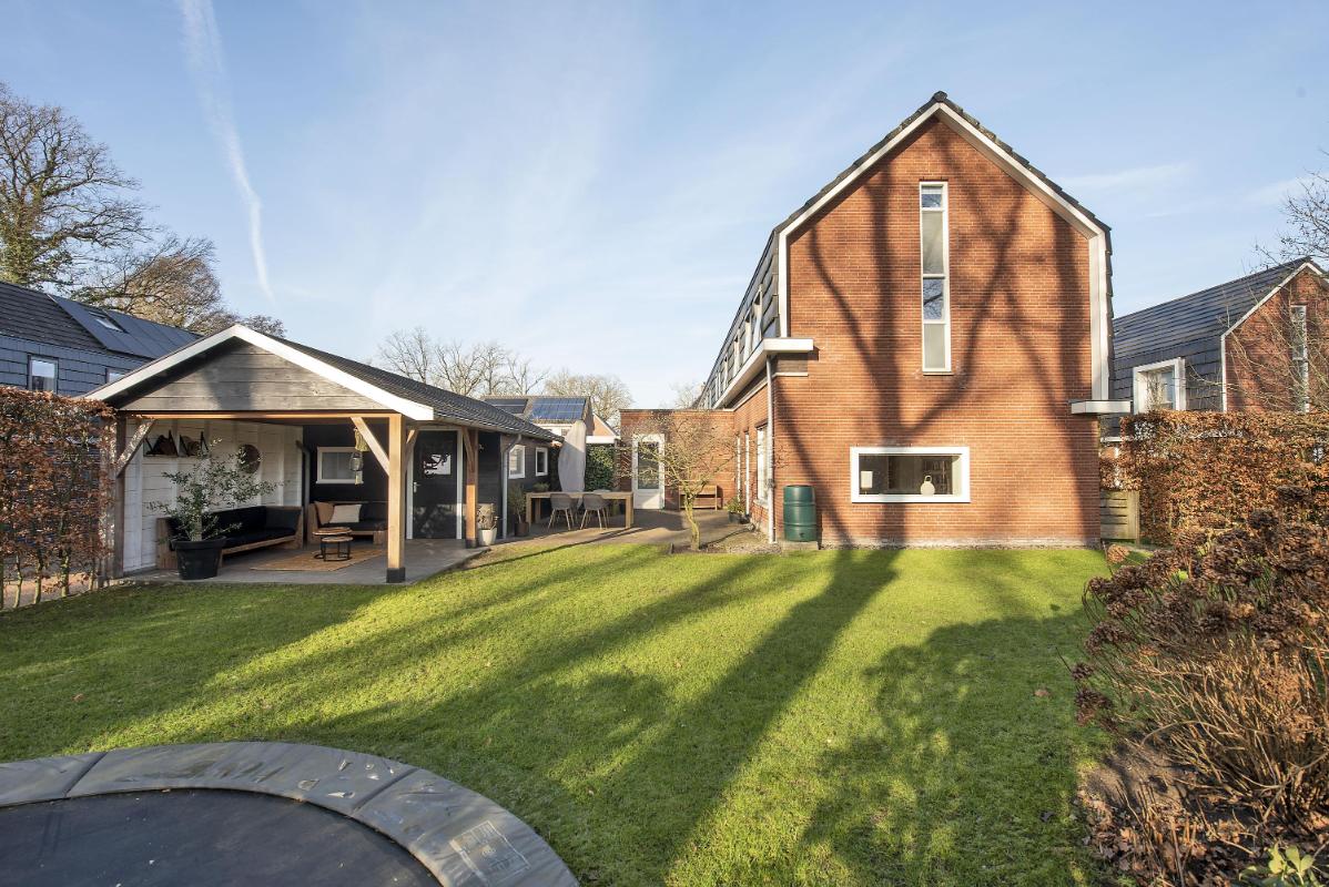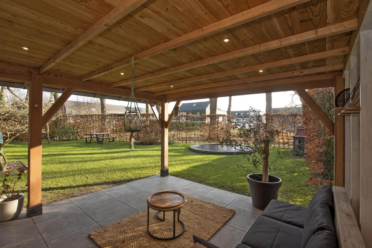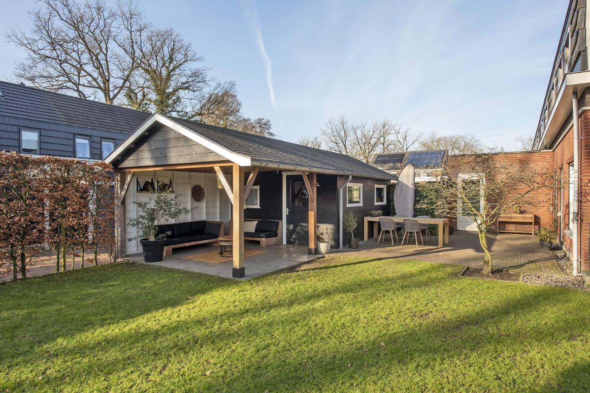 In de tuin is een vrijstaande berging met overkapping gebouwd, die ruim plaats biedt aan fietsen, gereedschap en tuinspullen. Onder de overkapping is ruimte voor een comfortabele loungeset – een heerlijke plek om beschut te zitten op warme dagen, of juist tot in de avond buiten te blijven. De berging is zowel vanuit de tuin als vanaf de eigen oprit toegankelijk. De eigen oprit is zeer praktisch voor dagelijks gebruik.