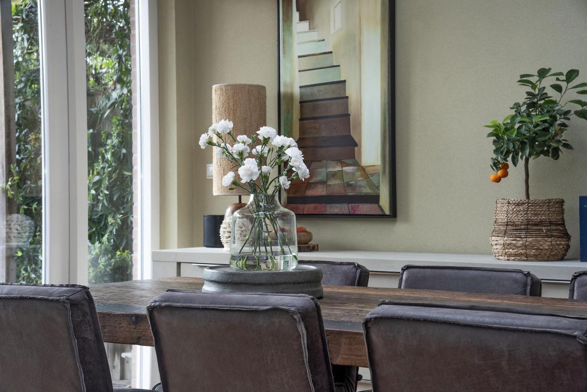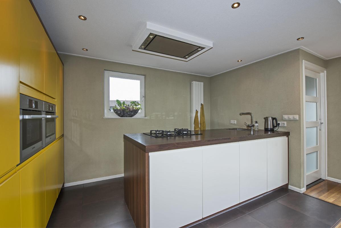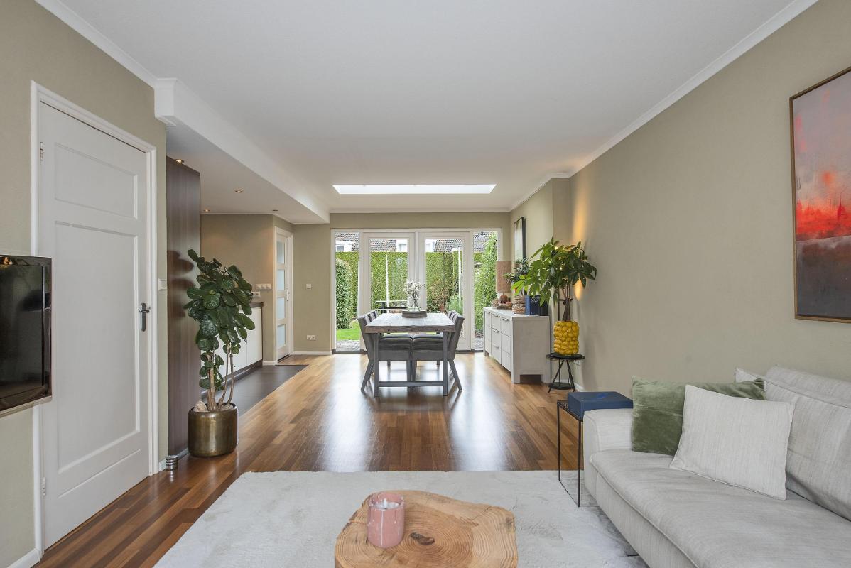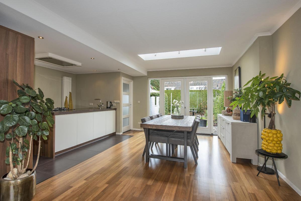 De woonkamer loopt open door naar het eetgedeelte, dat centraal in het huis ligt en uitnodigt tot lang tafelen. Hier bevindt zich een lichtstraat wat zorgt voor een mooie en natuurlijke lichtinval. Aansluitend bevindt zich de open keuken, modern afgewerkt en praktisch ingericht. Via de openslaande deuren loop je zo de tuin in, waardoor binnen en buiten op een fijne manier met elkaar verbonden zijn.