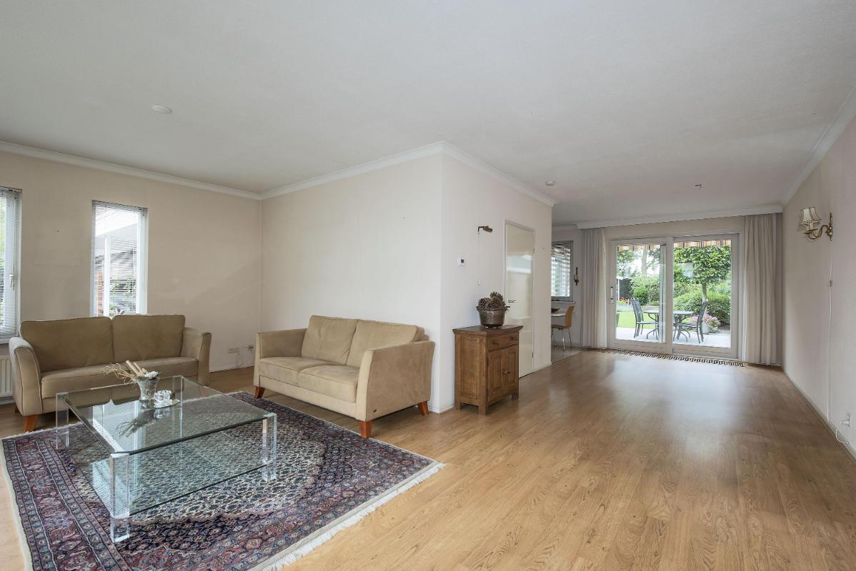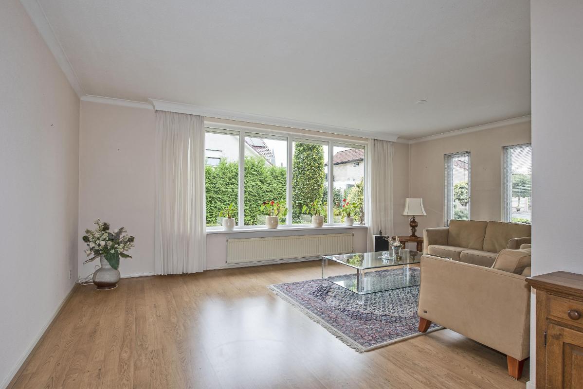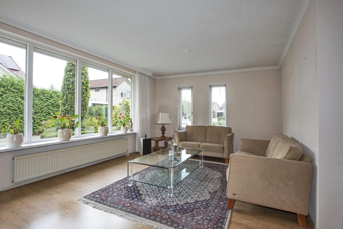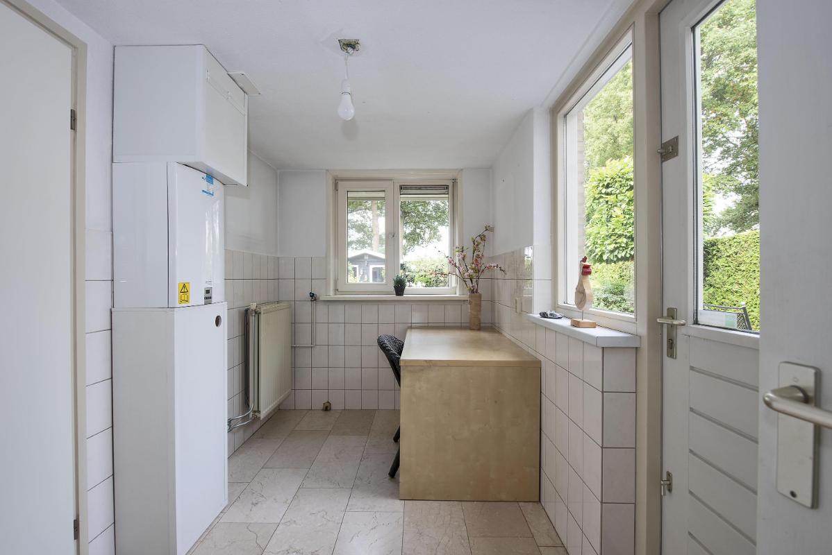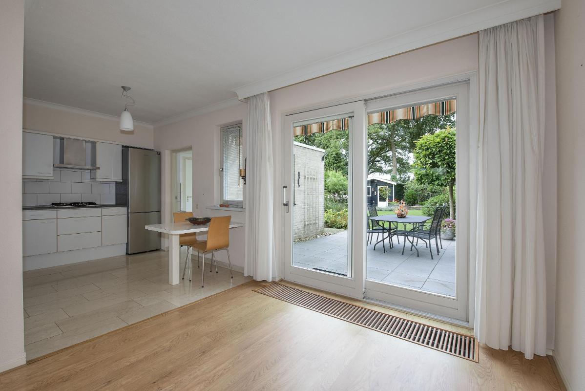 Binnen: licht en overzichtelijk De woonkamer aan de voorzijde is heerlijk licht en vormt samen met de open keuken een fijne leefruimte. Het eetgedeelte ligt aan de tuinzijde en vormt het hart van de woning: een plek waar je dagelijks dineert met fantastisch uitzicht. Vanuit de keuken kom je in de bijkeuken, die op zijn beurt toegang geeft tot de tuin en de garage. Het geheel is netjes onderhouden en biedt volop mogelijkheden om te moderniseren of juist te personaliseren.