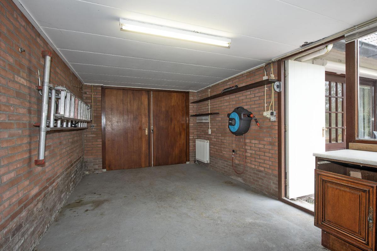 Begane grond: overdekte entree, hal met trapopgang, vaste kasten, meterkast en toilet. Vanuit de hal is er toegang tot een werkkamer aan de voorzijde en tot de woonkamer met open haard. Aan de achterzijde bevindt zich de gesloten keuken met toegang tot de bijkeuken met wastafel. Vanuit de bijkeuken zijn zowel de kelder als de garage bereikbaar. De garage is voorzien van een keukenblok en biedt toegang tot een separaat gelegen stenen berging.