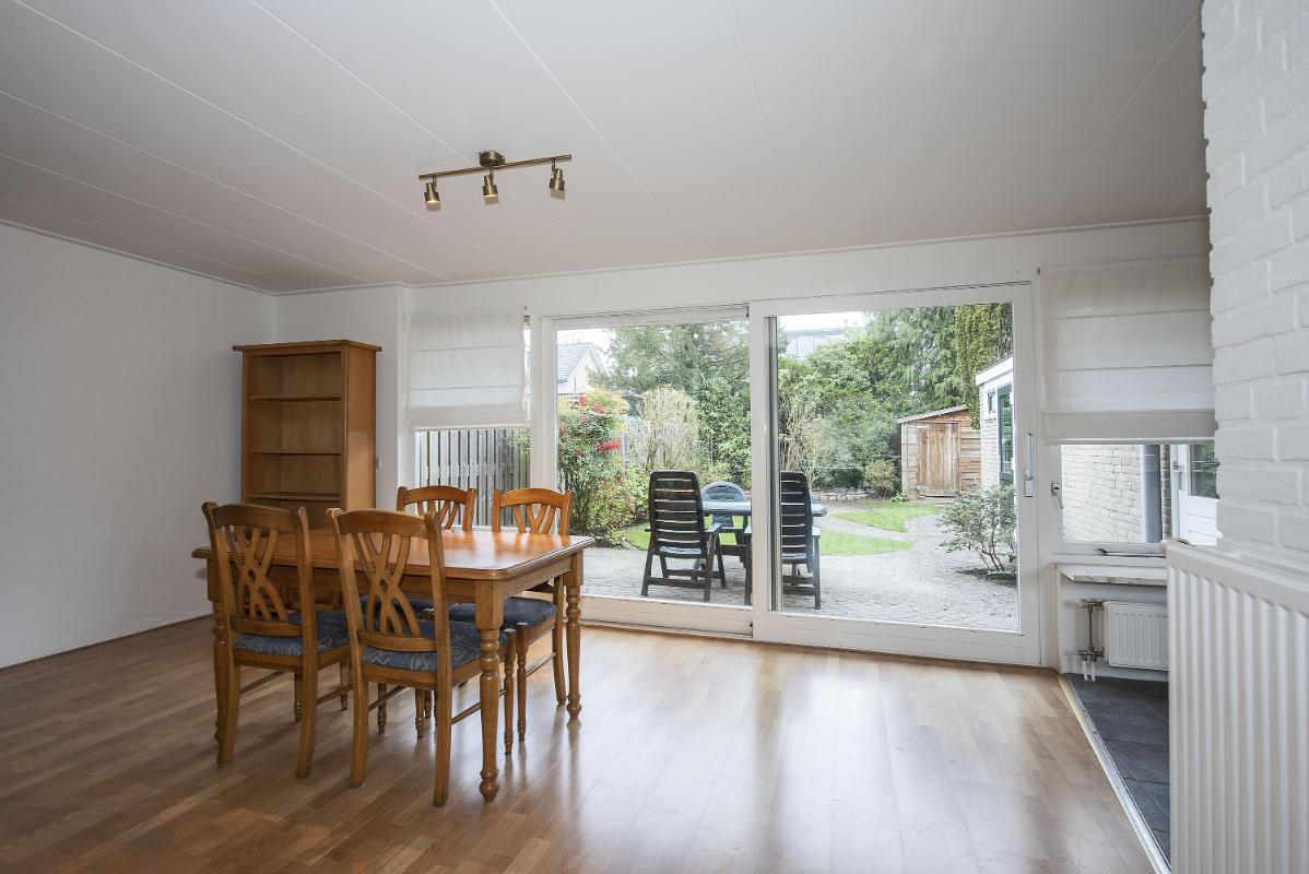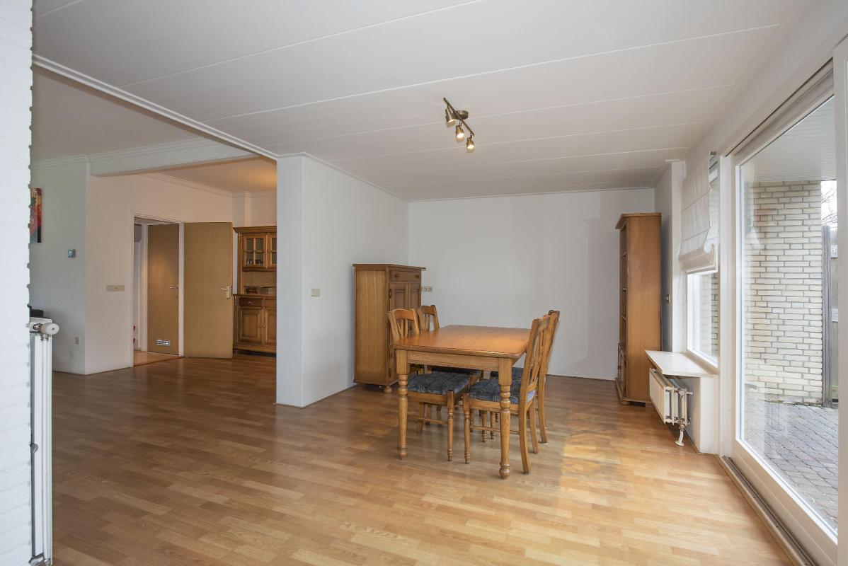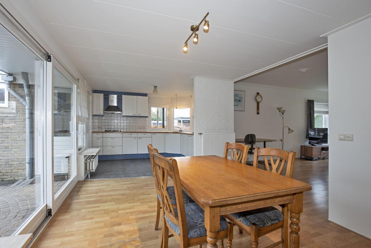 Ruimte in en om het huis Zodra je binnenkomt, merk je hoe ruim en uitnodigend deze woning aanvoelt. De woonkamer aan de voorzijde is opvallend licht en biedt genoeg plek voor een comfortabele zithoek. Dankzij de open verbinding met de eethoek ontstaat er een fijne doorloop. Aan de achterzijde vind je de keuken, praktisch ingedeeld. Vanuit de keuken loop je door naar de bijkeuken, waar extra opbergruimte en de toegang tot de tuin samenkomen. Deze aanbouw zorgt net voor dat beetje extra leefruimte waar je elke dag plezier van hebt.