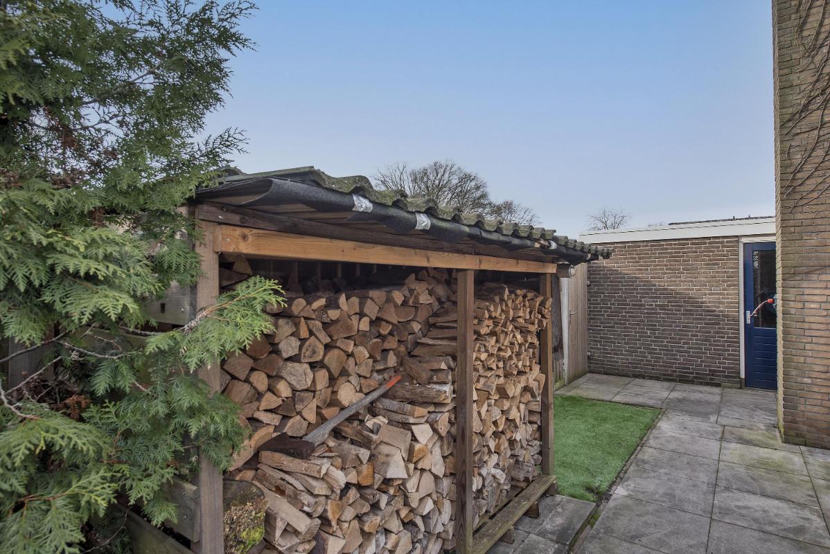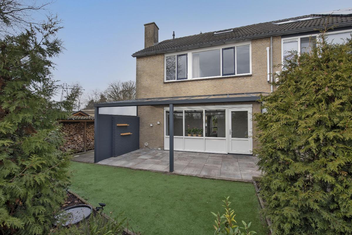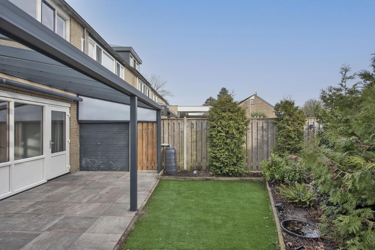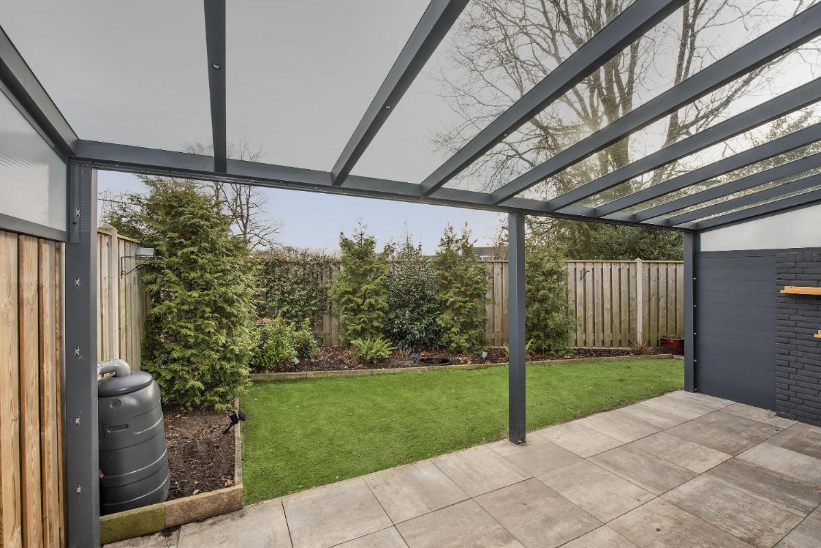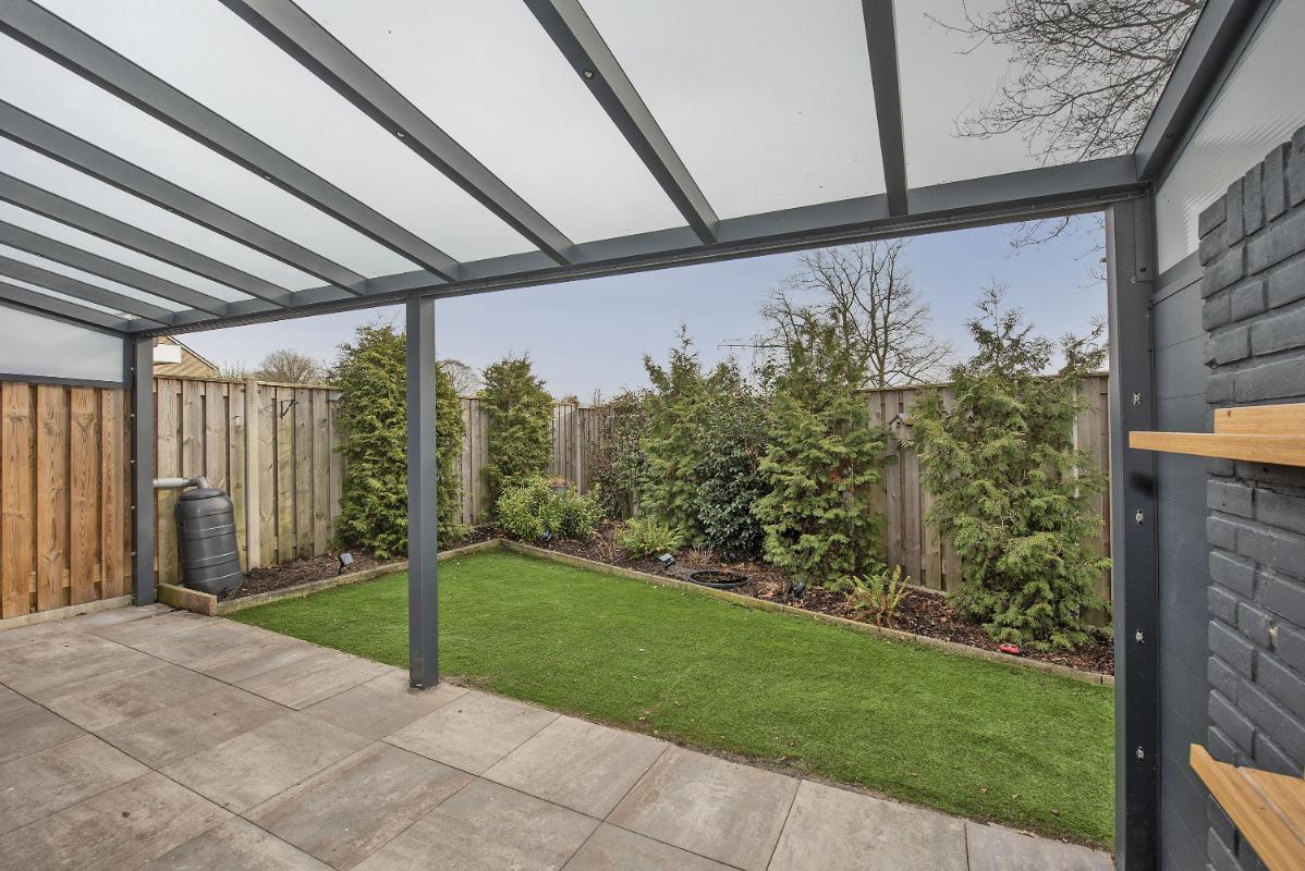 Groene tuin De achtertuin is groen en verzorgd aangelegd en biedt een fijne plek om buiten te zitten, te spelen of te tuinieren. Onder de veranda geniet je al vroeg in het seizoen van het buitenleven. Daarnaast is er een achterom aanwezig, wat de tuin extra praktisch maakt in het dagelijks gebruik.