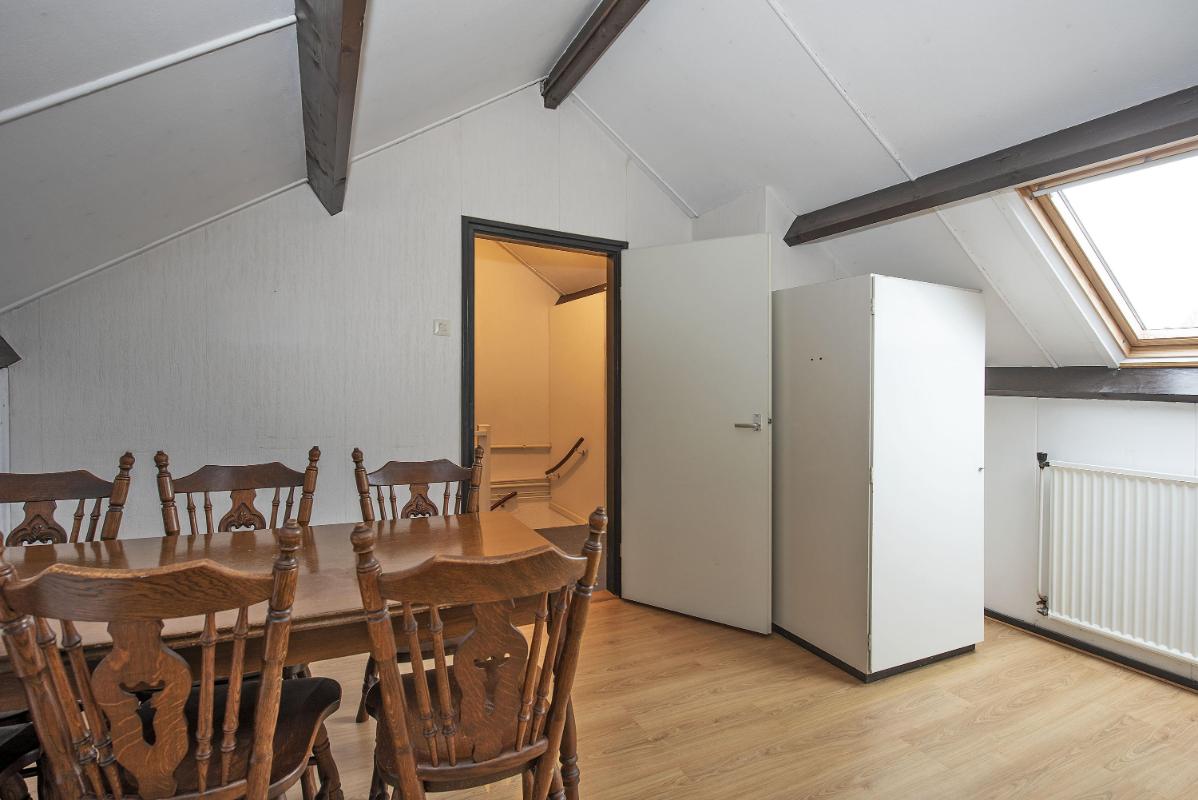 De tweede verdieping is een verrassing: een royale zolderkamer met dakraam en handige bergruimte achter de knieschotten. Nu ingericht als slaapkamer, maar net zo geschikt als werkplek, hobbyruimte of logeerkamer. Jij bepaalt wat hier het beste past.