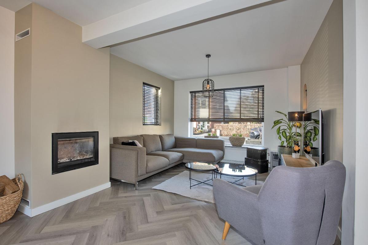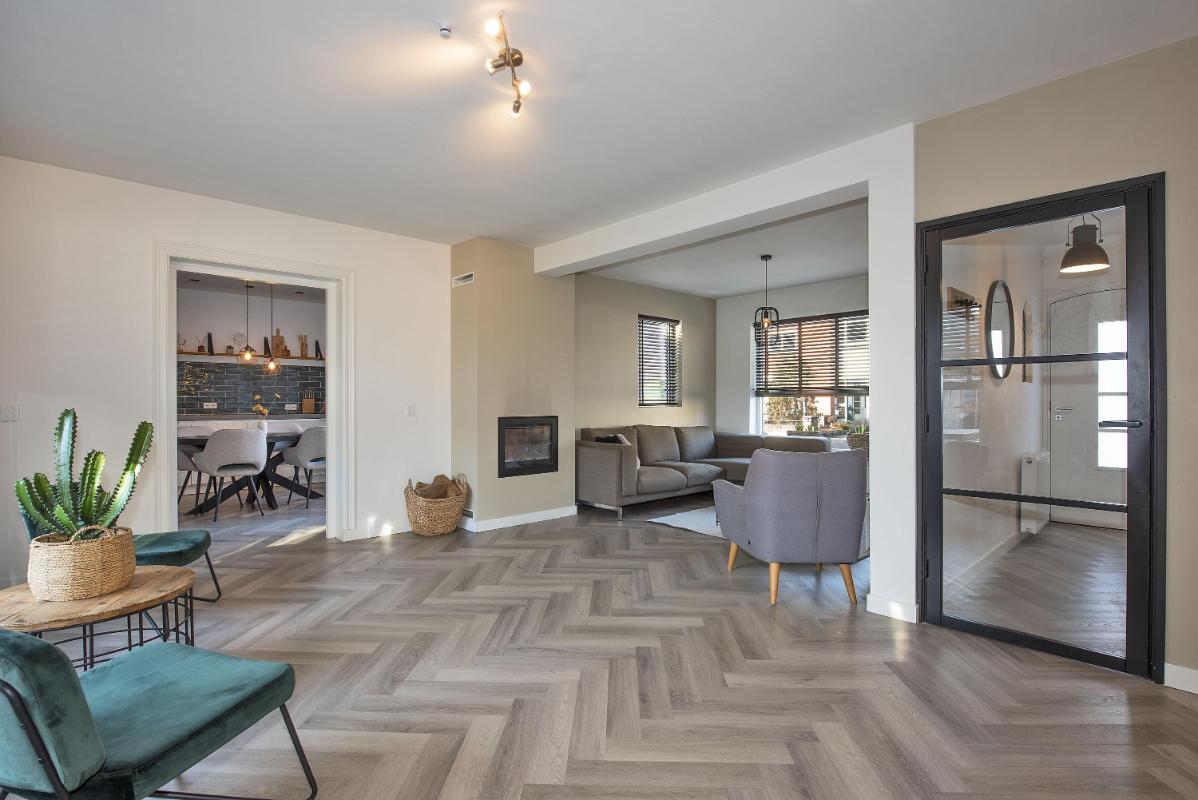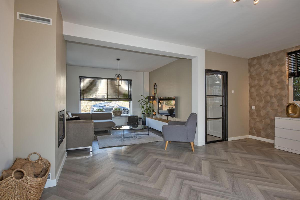 Licht, sfeer en comfortabel wonen De begane grond vormt het hart van de woning. Je komt binnen in de hal met toilet en trapopgang. Vanuit hier loop je door naar de woonkamer, een fijne en lichte leefruimte. Een plek waar je moeiteloos verschillende woonhoeken creëert en de houtkachel zorgt voor extra warmte en gezelligheid. Op warme dagen biedt de aanwezige airconditioning juist verkoeling, waardoor het hier het hele jaar door comfortabel wonen is. Vanuit de woonkamer heb je toegang tot de aanbouw, een praktische ruimte met aansluitingen voor wasapparatuur welke tevens ook te gebruiken is als speelruimte voor kinderen of een werkplek.