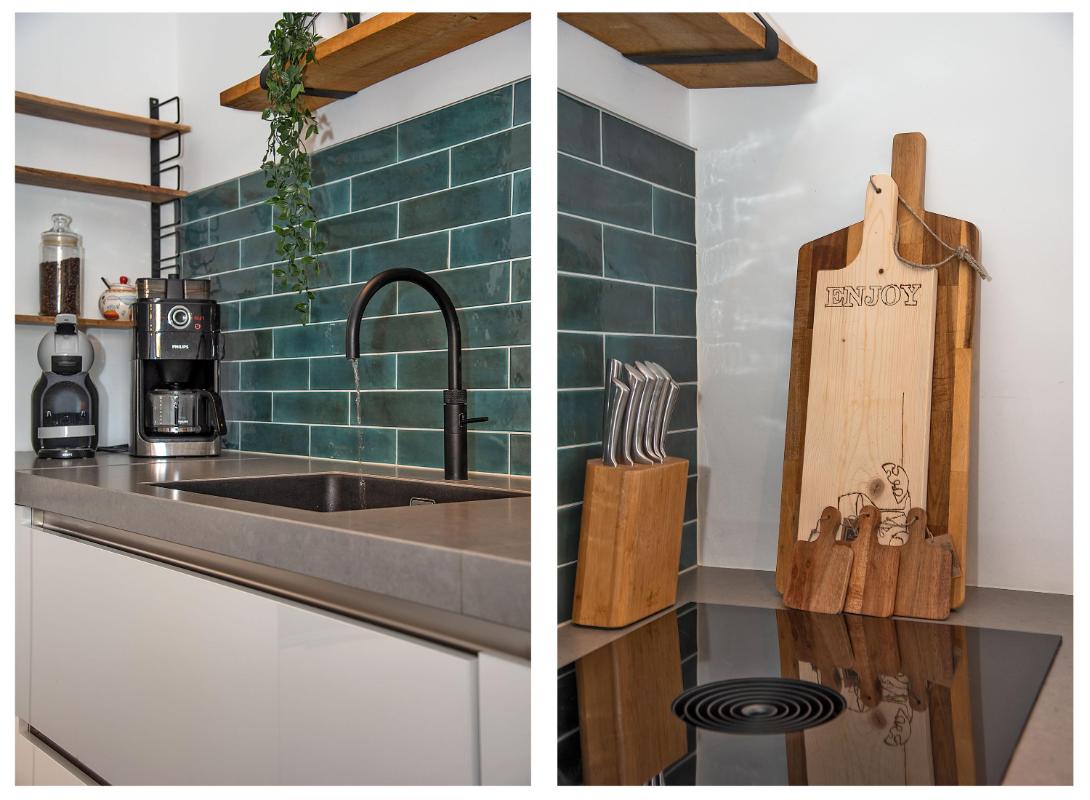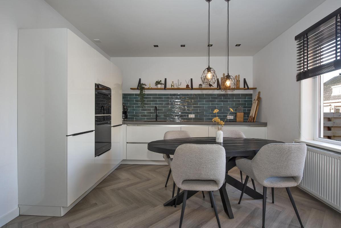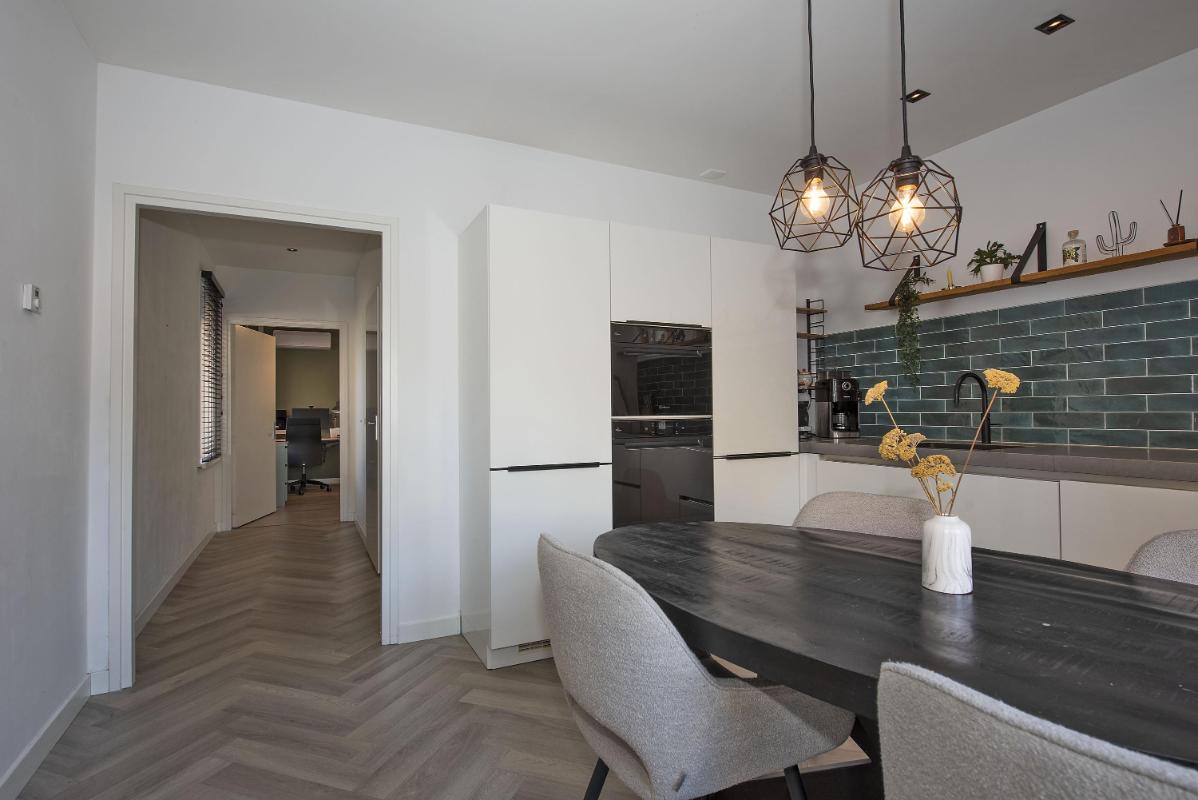De woonkeuken staat in directe verbinding met de woonkamer. Koken en samen zijn lopen hier moeiteloos in elkaar over. De keuken is compleet uitgerust met een kookplaat met geïntegreerde afzuigkap, oven, combimagnetron, vaatwasser, koel vriescombinatie en een quooker. Een fijne plek die uitnodigt tot gezellig tafelen of een rustig koffiemoment gedurende de dag.