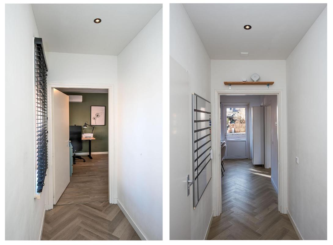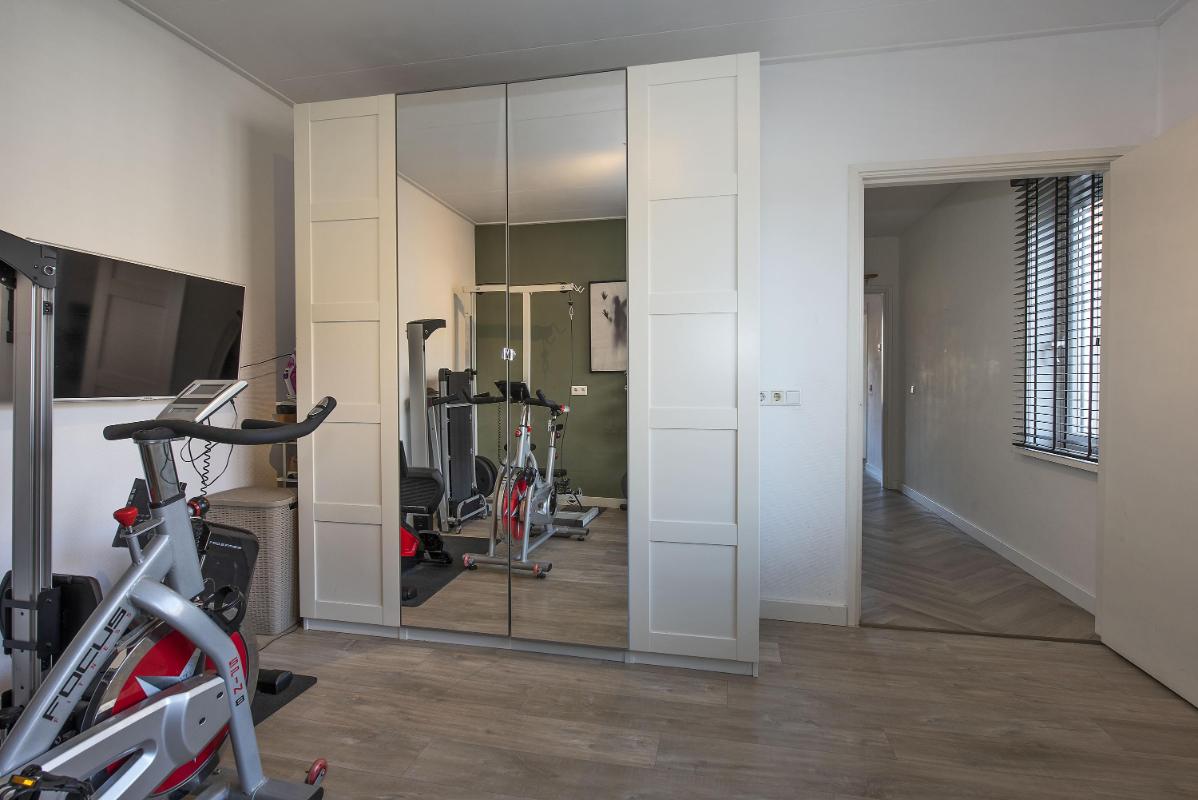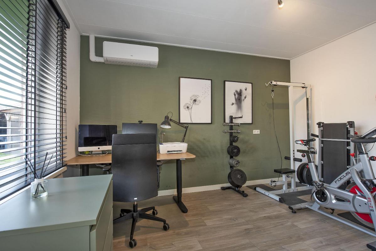 Via de keuken kom je in een tweede hal. Deze geeft toegang tot de badkamer en een slaapkamer op de begane grond. De ruimte wordt momenteel gebruikt als sportkamer en werkkamer, maar is eenvoudig aan te passen naar eigen wens. Ook hier is airconditioning aanwezig.
