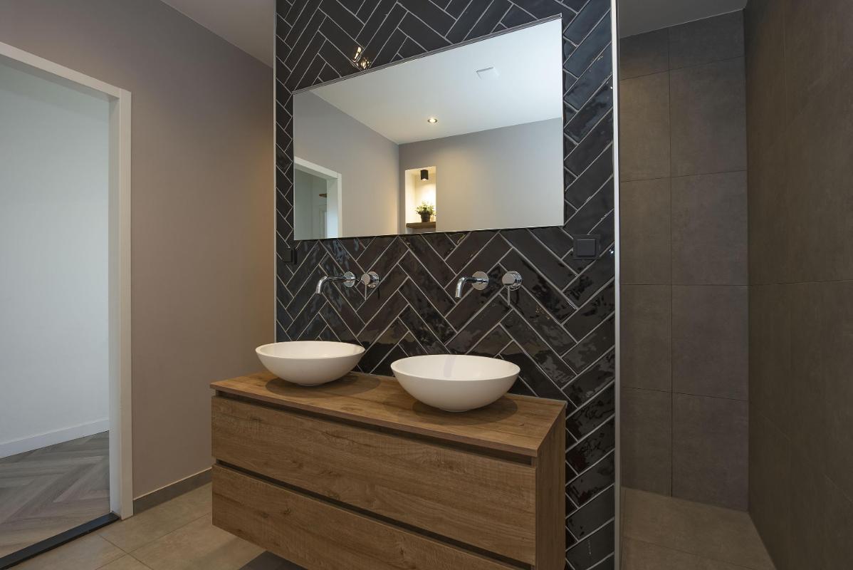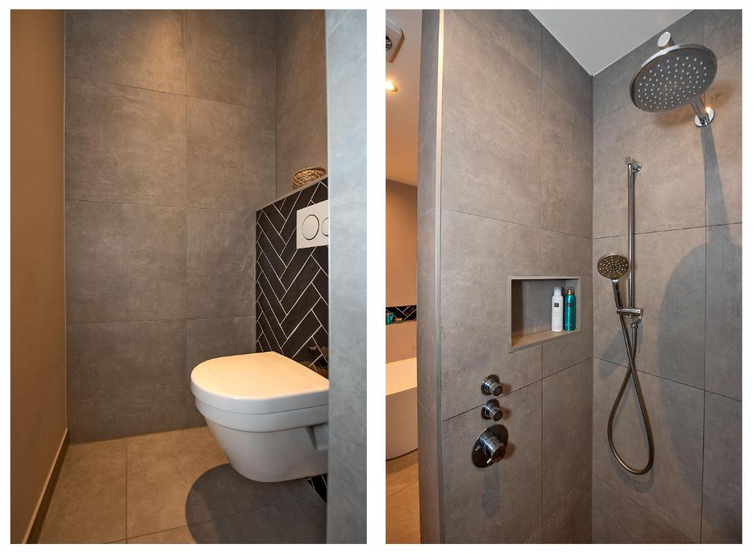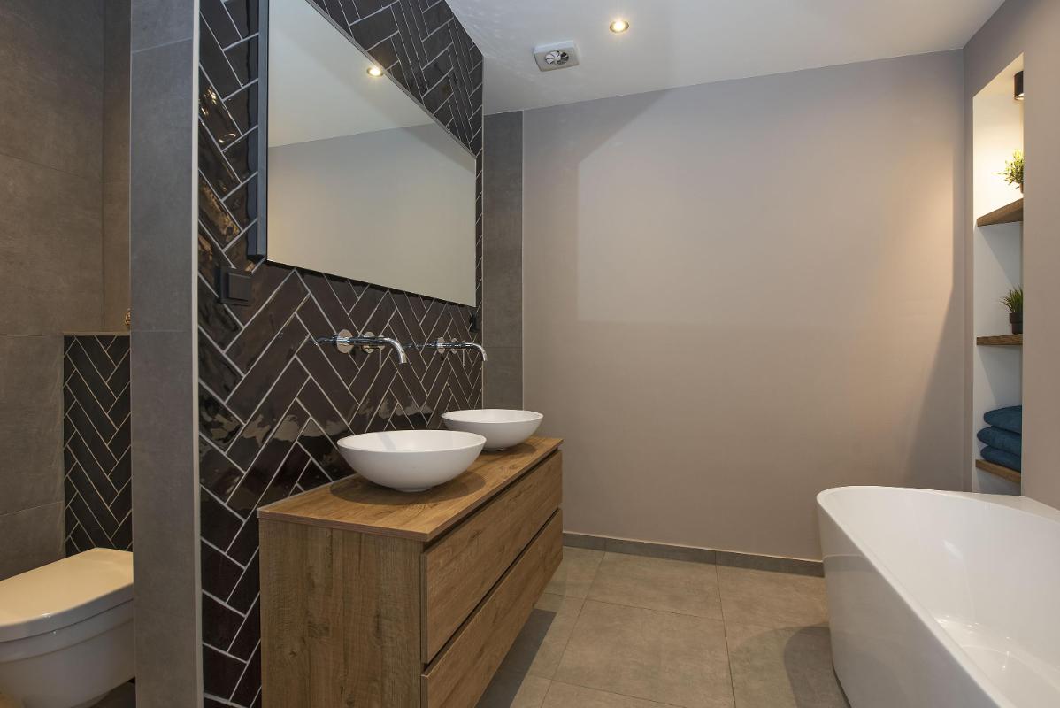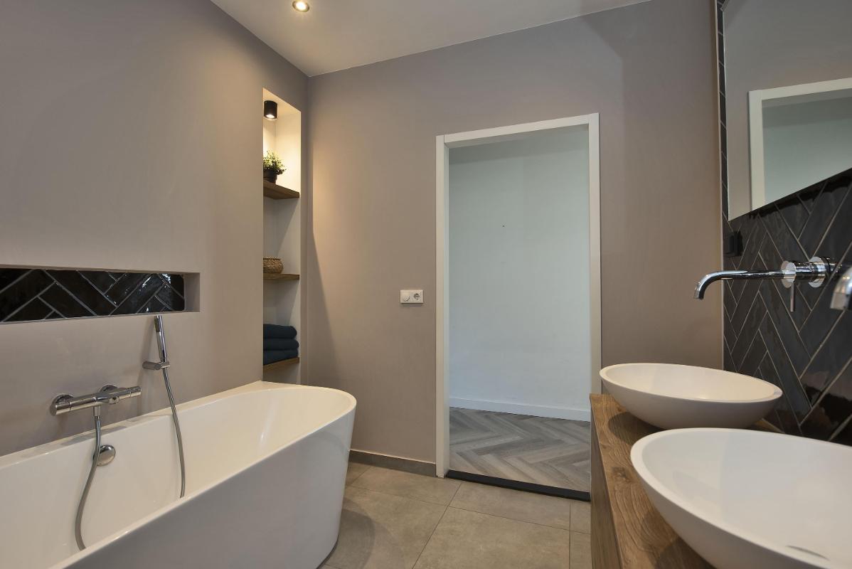 Gelijkvloers comfort De badkamer op de begane grond is verzorgd en comfortabel ingericht. Je beschikt hier over een ligbad, een inloopdouche, een dubbele wastafel met meubel en een toilet. Vloerverwarming in zowel de badkamer als de aangrenzende gang zorgt voor extra comfort in het dagelijks gebruik. Slapen en baden op de begane grond maakt deze woning levensloopbestendig en prettig voor nu én later.