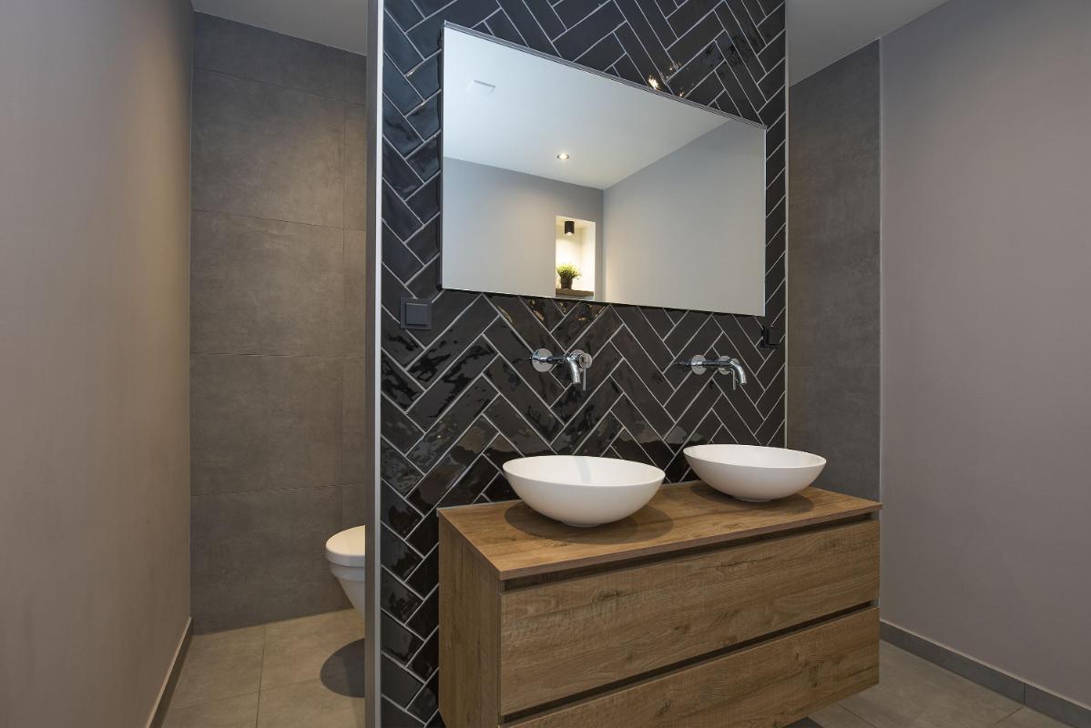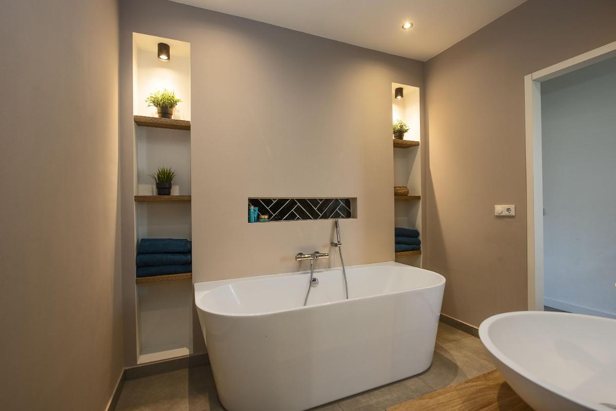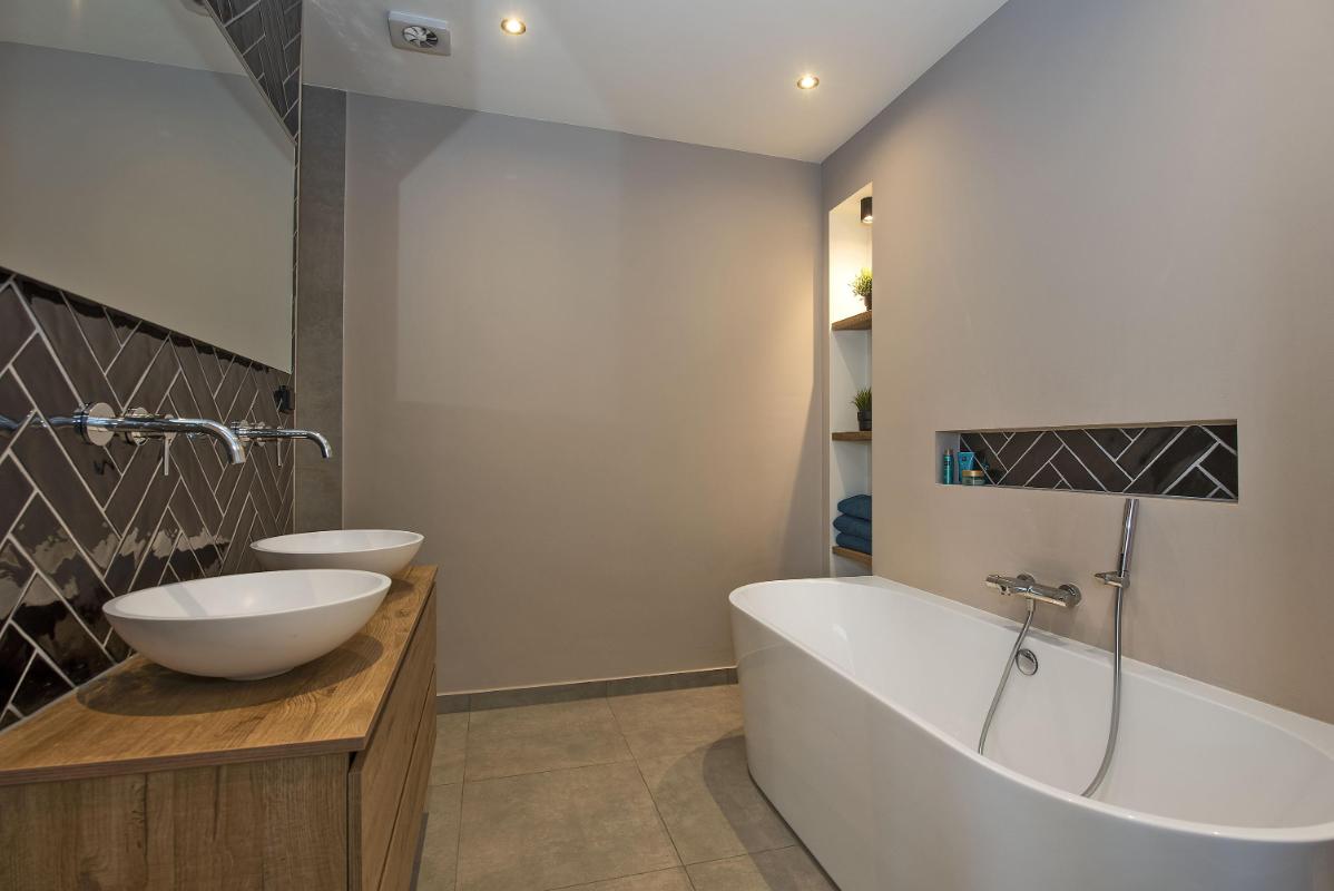 Gelijkvloers comfort De badkamer op de begane grond is verzorgd en comfortabel ingericht. Je beschikt hier over een ligbad, een inloopdouche, een dubbele wastafel met meubel en een toilet. Vloerverwarming in zowel de badkamer als de aangrenzende gang zorgt voor extra comfort in het dagelijks gebruik. Slapen en baden op de begane grond maakt deze woning levensloopbestendig en prettig voor nu én later.