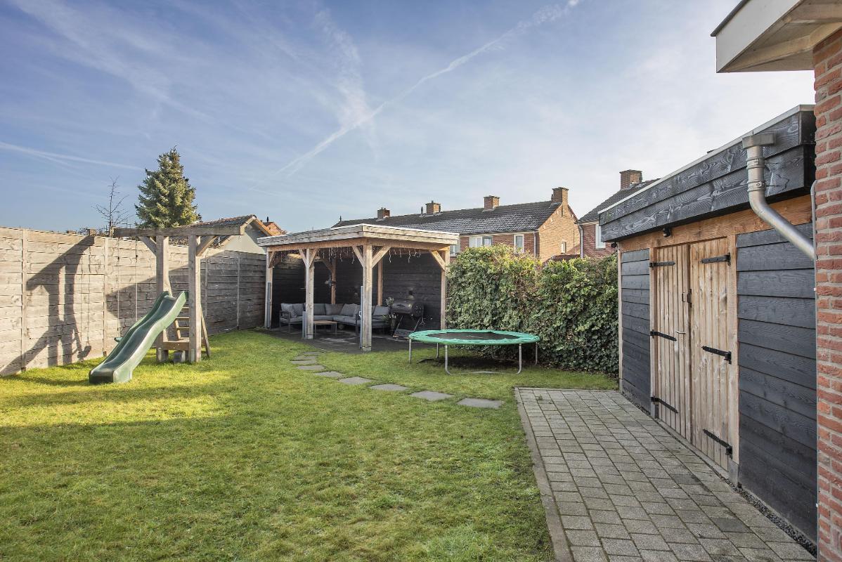 Ruime tuin met overkapping Rondom de woning ligt een verzorgde tuin met volop ruimte, een fijne plek waar kinderen vrij kunnen spelen. Achter in de tuin bevindt zich een overkapping met een gezellige zithoek, ideaal om beschut buiten te zitten en heerlijk te ontspannen.