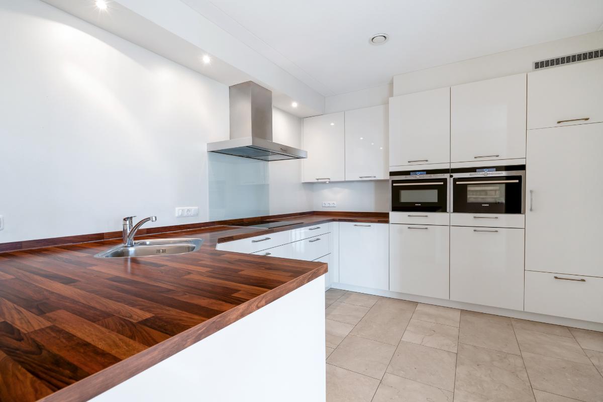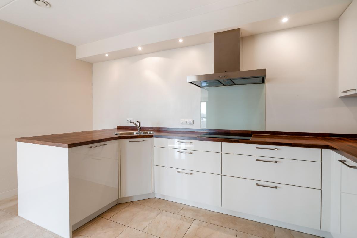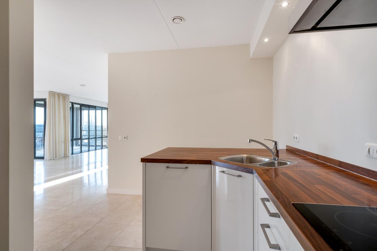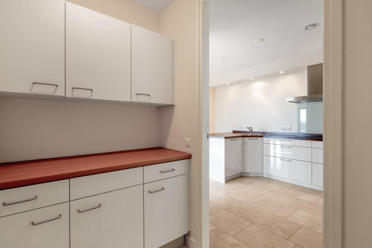 De open keuken sluit hier mooi op aan en is ingericht met diverse inbouwapparatuur, waaronder een kookplaat, afzuigkap, oven, magnetron, koelkast en vaatwasser. Aangrenzend aan de keuken bevindt zich een praktische pantry, een fijne toevoeging voor extra bergruimte en dagelijks gemak.