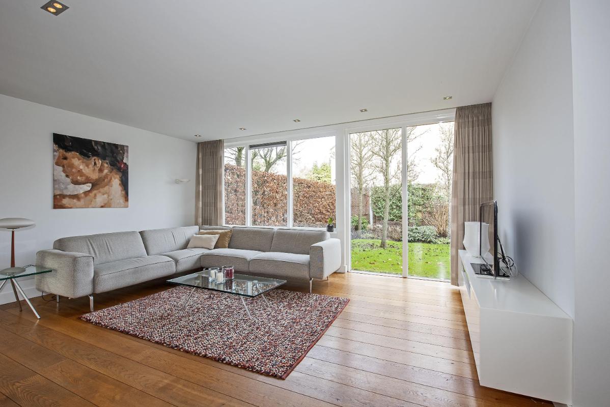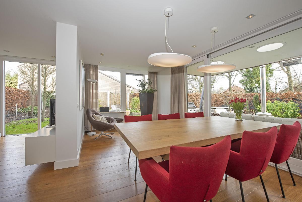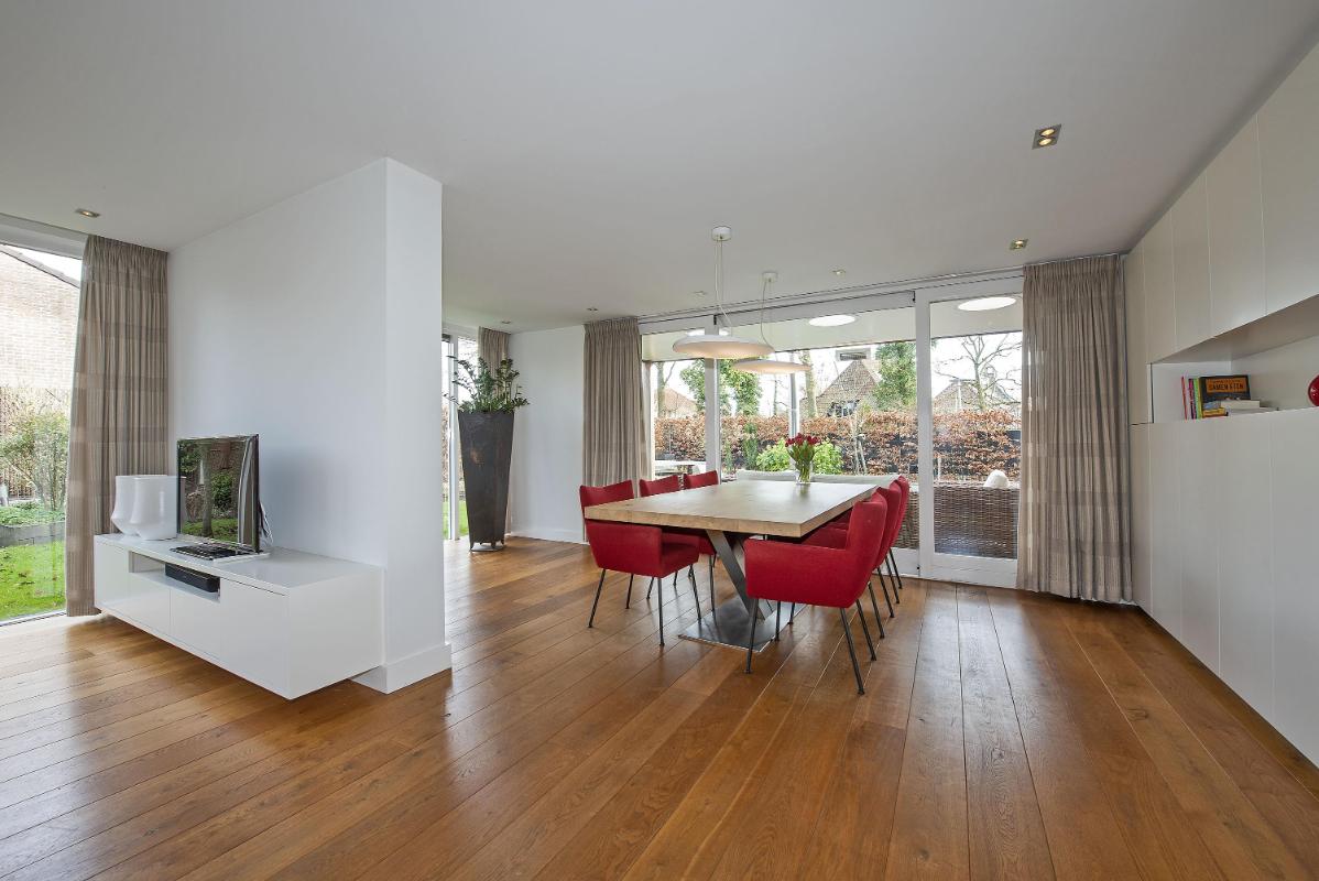 Aan de achterzijde is ruimte voor een royale eettafel. Vanuit de eethoek verbindt een schuifpui de woning met de tuin. Deze zorgt niet alleen voor veel daglicht, maar ook voor een directe en natuurlijke overgang tussen binnen en buiten.