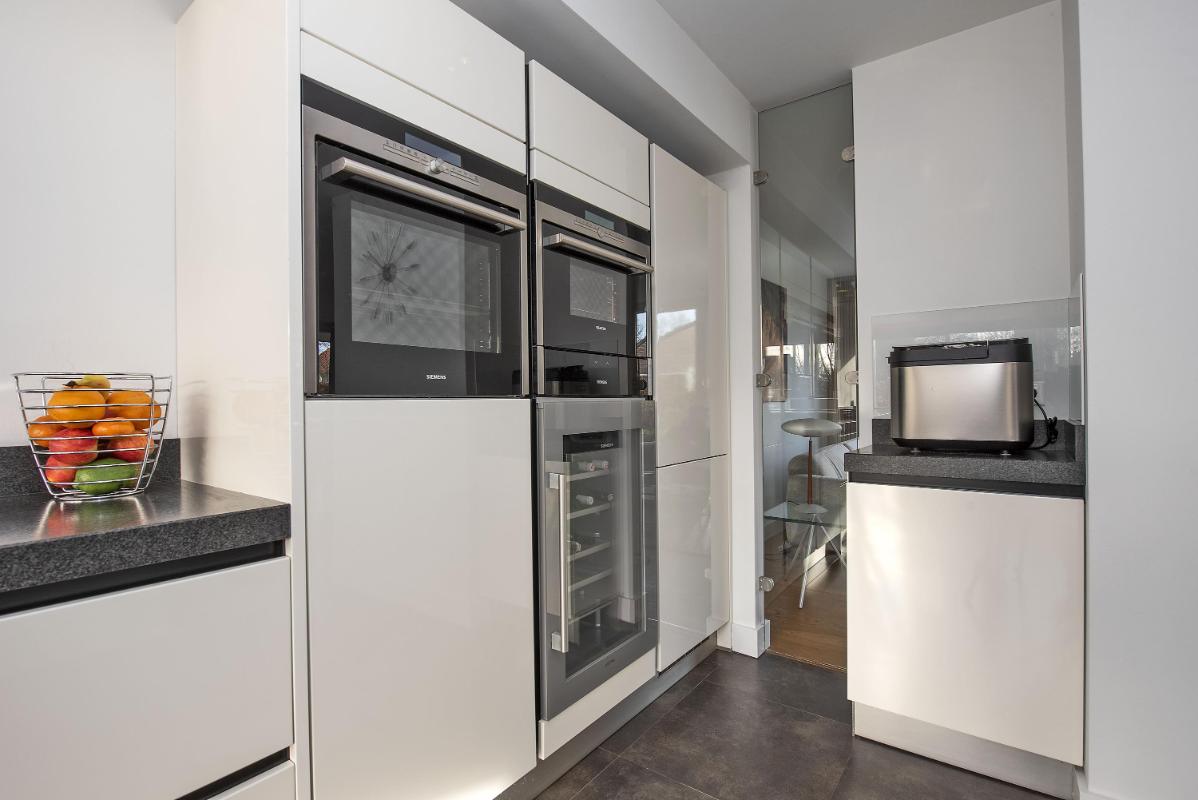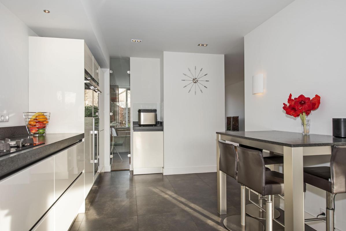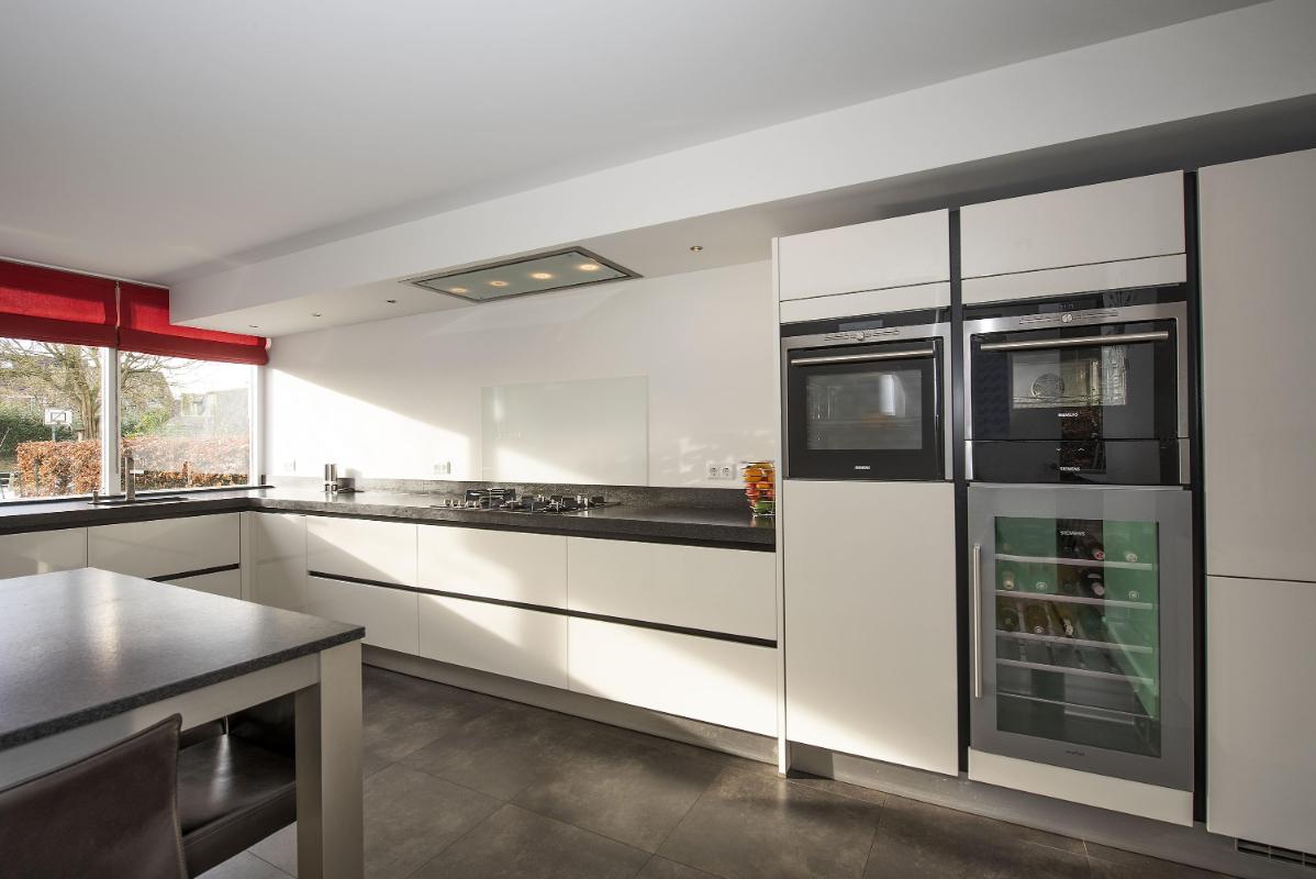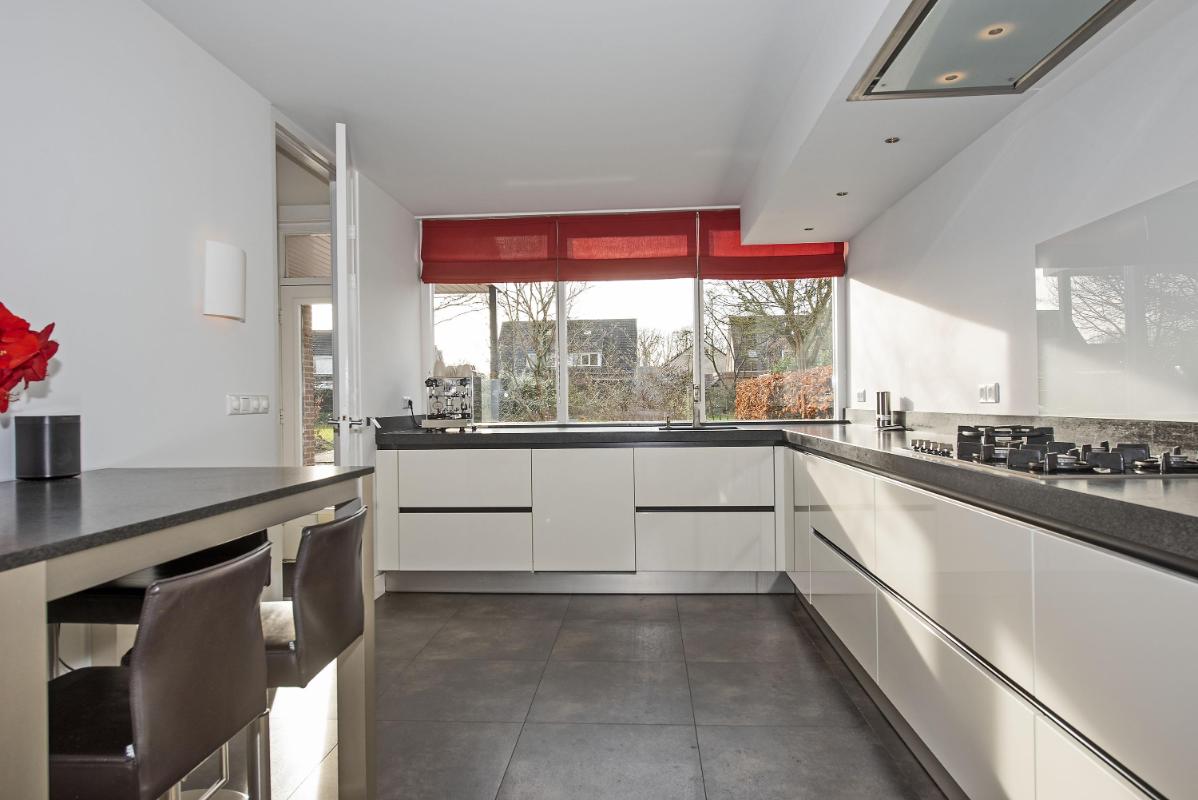 De half open keuken is een fijne plek om te koken, met zicht naar buiten en een open verbinding met het wonen. De keuken is verzorgd en praktisch ingericht en voorzien van diverse inbouwapparatuur, waaronder een gasfornuis met afzuigkap, oven, stoomoven met warmhoudlade, vaatwasser, koelkast en een wijnkoeler. Een complete en comfortabele keuken waar je dagelijks met plezier gebruik van maakt.