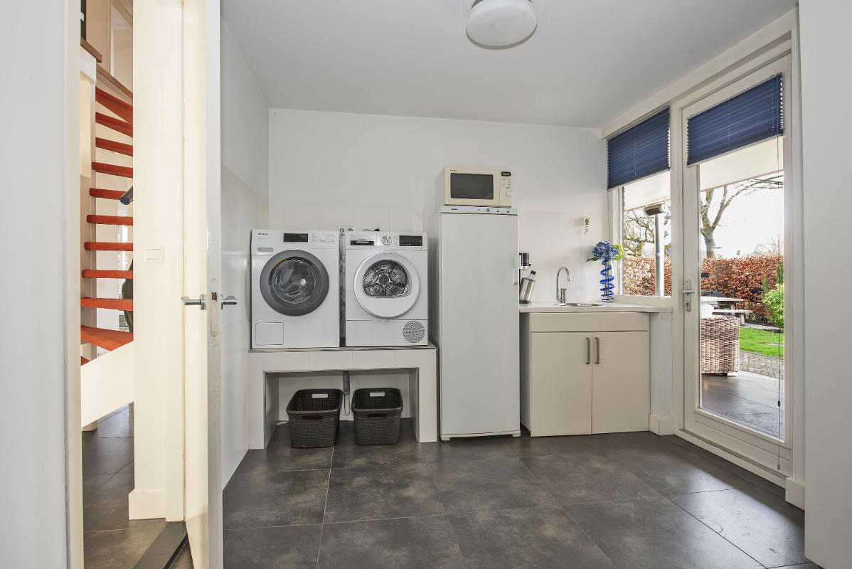 Via de hal bereik je de bijkeuken. Deze ruimte is functioneel ingericht en voorzien van aansluitingen voor wasapparatuur, ideaal voor extra opslag en dagelijkse spullen. Vanuit de bijkeuken heb je direct toegang tot de overkapping en de berging.