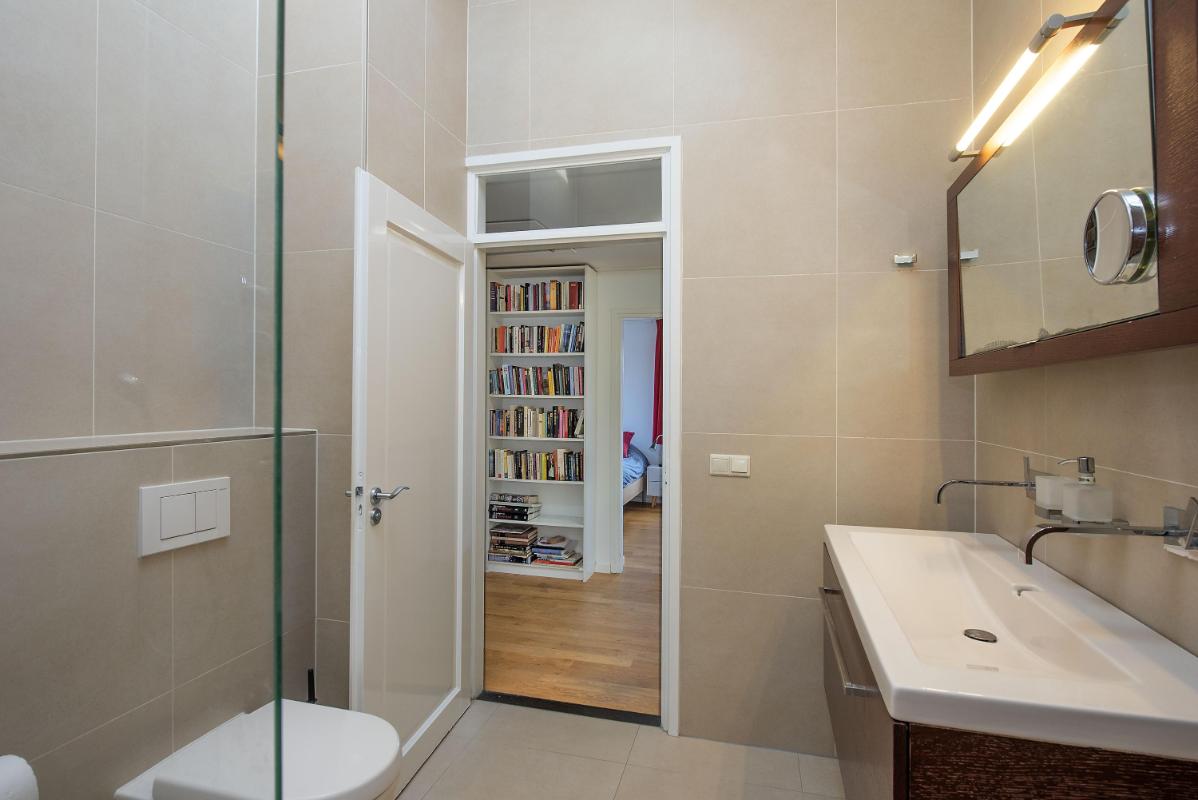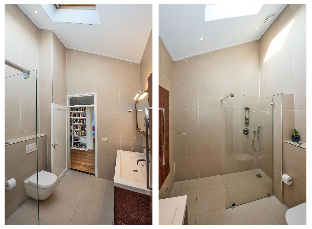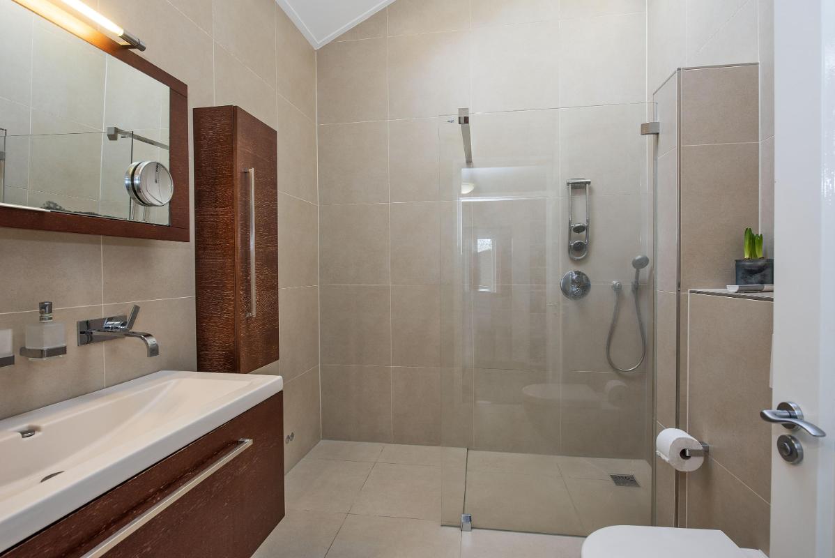 De badkamer is praktisch ingericht, verzorgd afgewerkt en beschikt over een inloopdouche, dubbele wastafel met meubel, toilet en vloerverwarming.