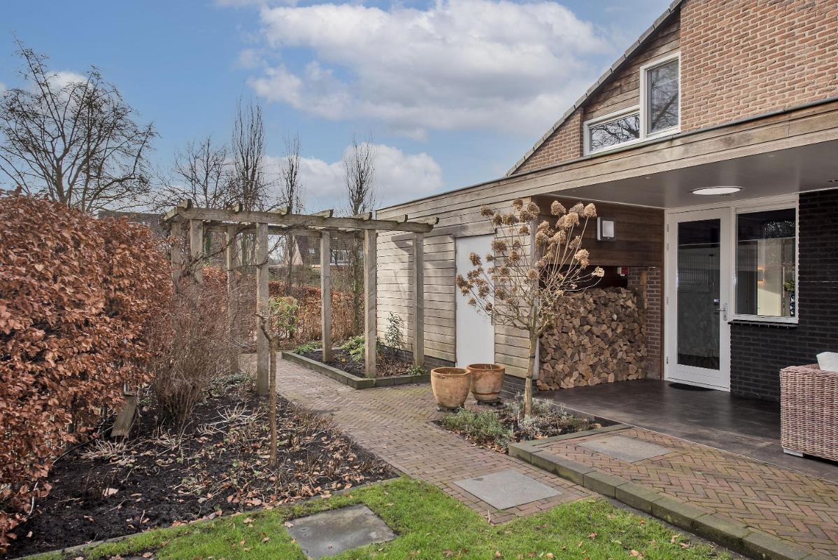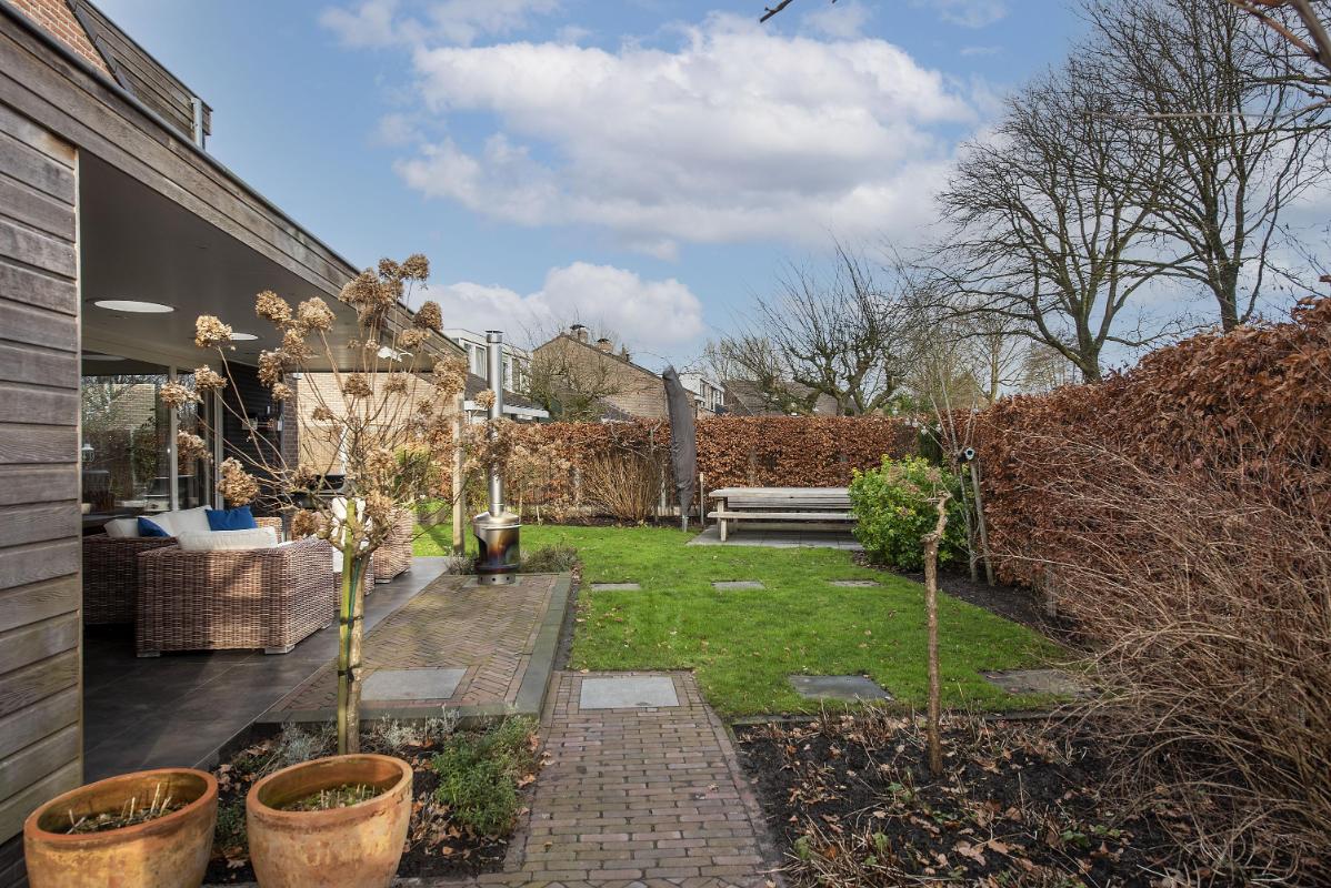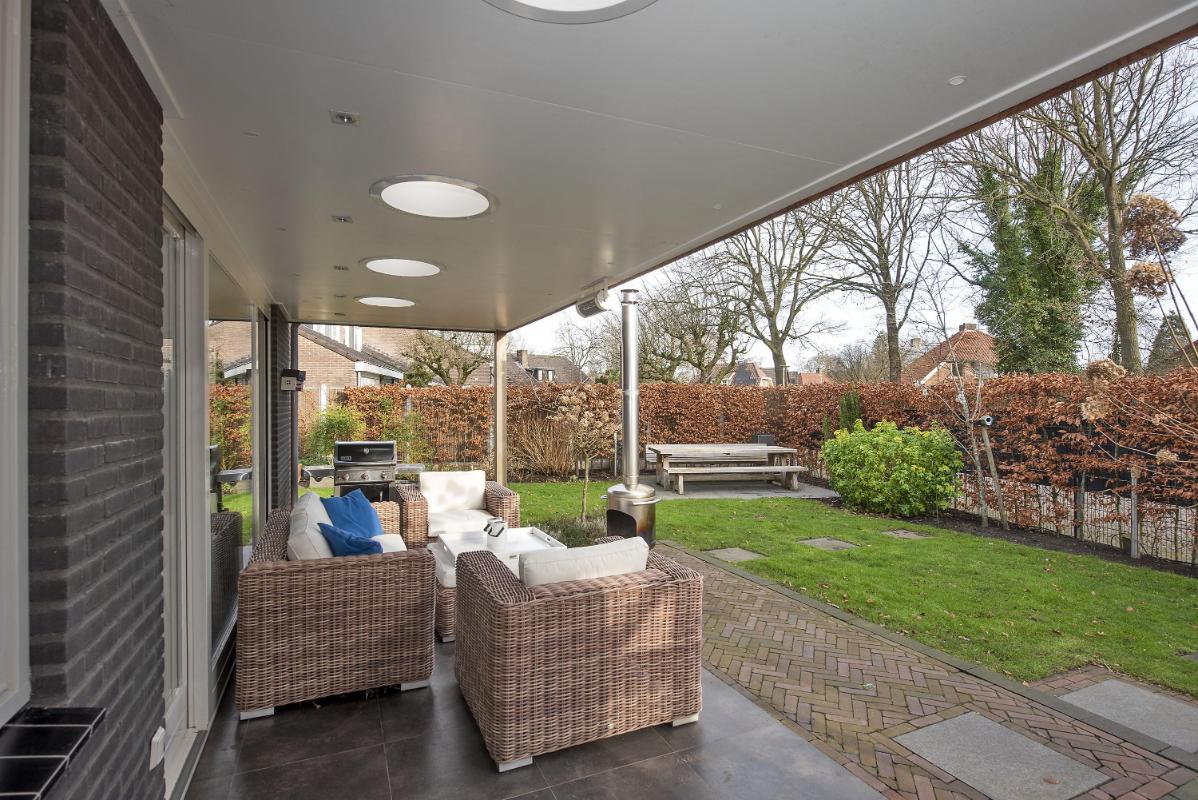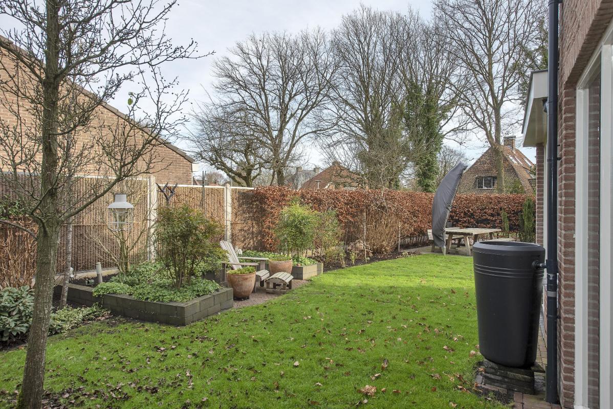 Buitenruimte met groen en privacy De achtertuin is ruim opgezet en groen aangelegd. Een prettige plek om tot rust te komen, met voldoende ruimte voor meerdere zitplekken. Dankzij de overkapping zit je hier ook bij minder weer heerlijk buiten. Daarnaast is er volop ruimte voor kinderen om lekker te spelen.