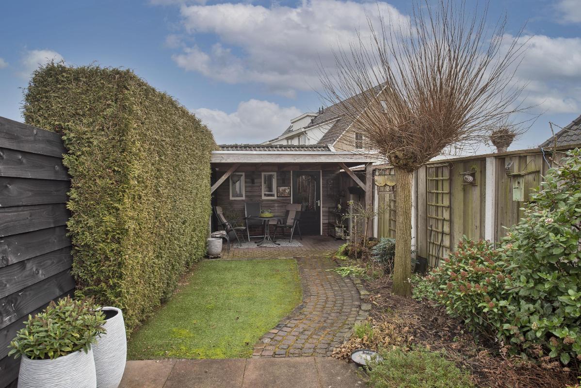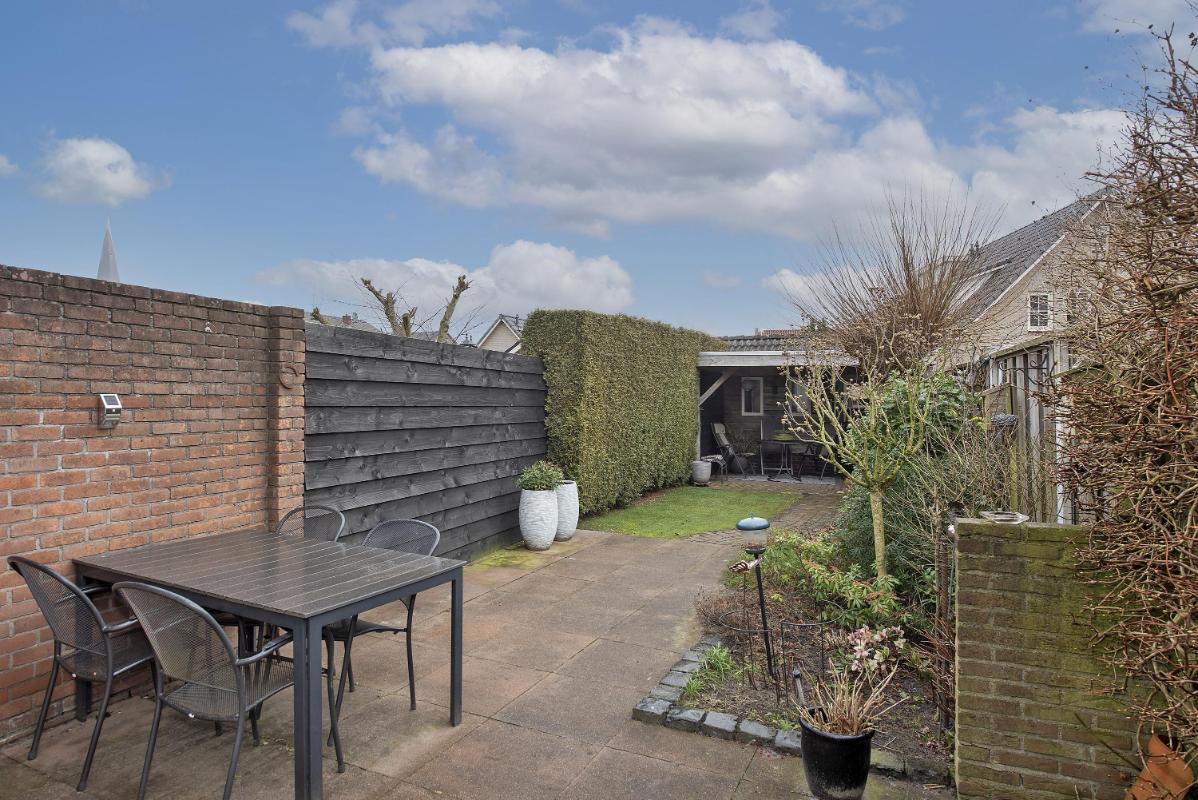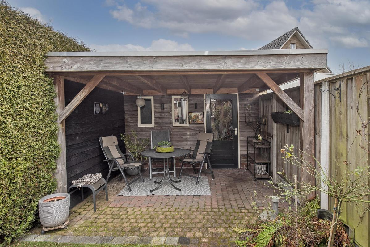 Buiten genieten Vanuit de keuken stap je de achtertuin in. De tuin is verzorgd aangelegd met bestrating en beplanting en biedt een fijne balans tussen groen en gemak. Achterin bevindt zich de overkapping. Een heerlijke plek om beschut te zitten, of het nu een zonnige middag is of een lange zomeravond. Aansluitend vind je de vrijstaande berging met werkbank. Praktisch voor fietsen, gereedschap of hobbyprojecten. Alles netjes opgeborgen en toch binnen handbereik.