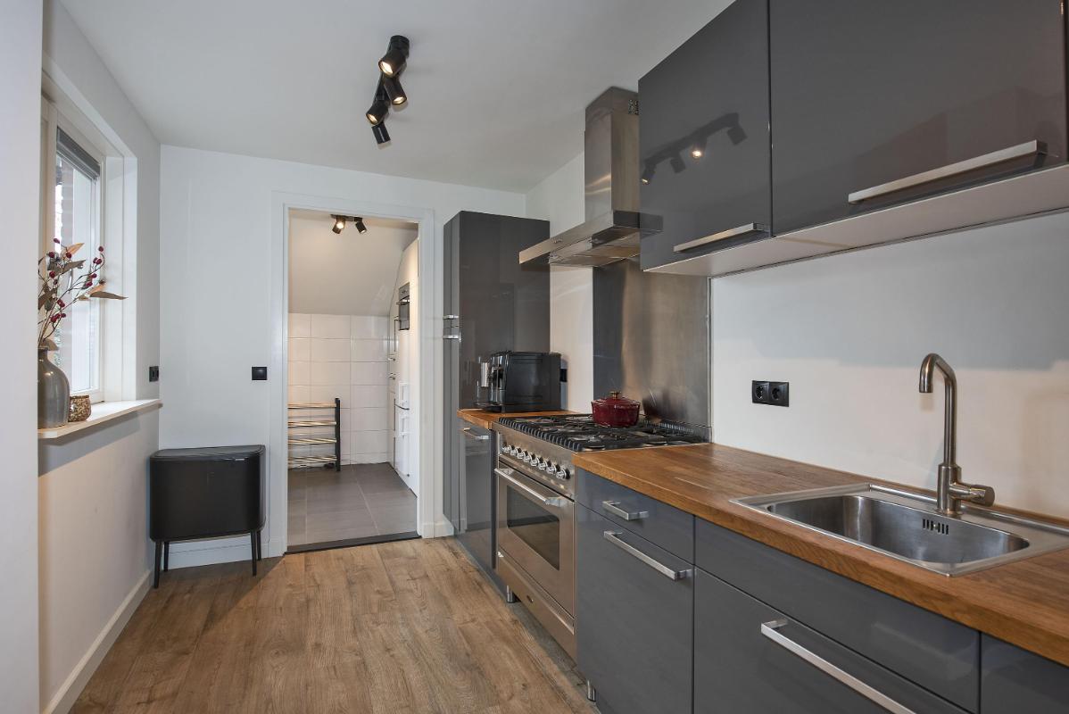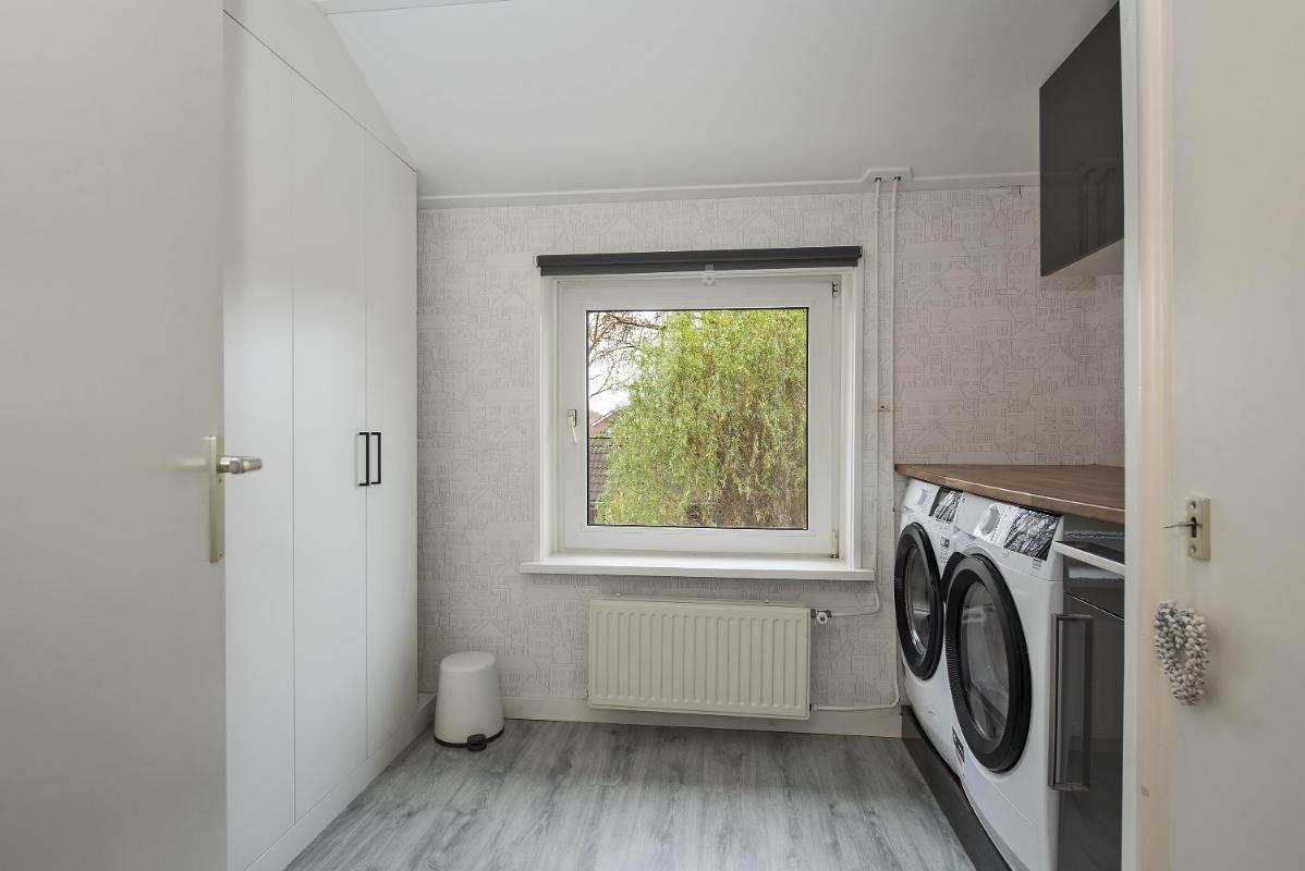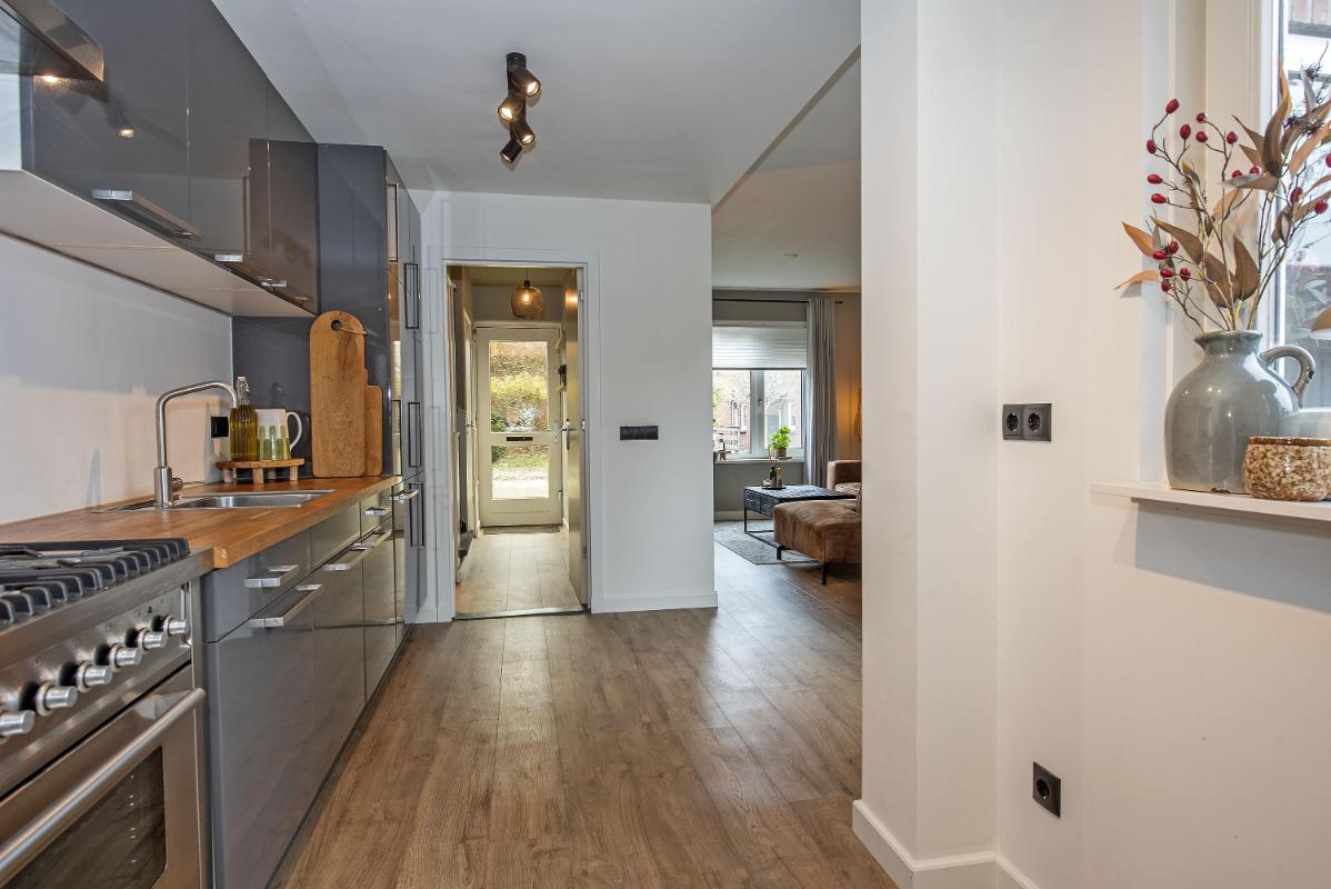 Indeling en feiten Begane grond: entree met hal, trapopgang en toilet. Lichte woonkamer met grote raampartijen en open verbinding naar de keuken. Moderne keuken met zes pits gasfornuis, oven, afzuigkap en koel vriescombinatie. Aangrenzende bijkeuken met extra opbergruimte, wasgoedaansluiting en toegang tot de tuin. Aansluiting voor inductie koken aanwezig in de meterkast. Eerste verdieping: drie slaapkamers, waarvan een met vaste kast én aansluiting voor wasmachine en droger. Moderne badkamer met Portugese tegels, vloerverwarming, douche, toilet, wastafelmeubel en designradiator. Vliering: praktische bergruimte, bereikbaar via vlizotrap. Tuin: diepe groene achtertuin op het zuidwesten met royale overkapping, schuur met gemetselde borstwering, houten opbouw en vliering.